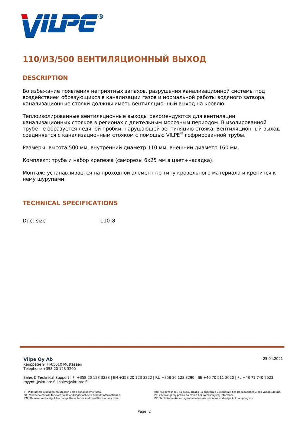 Диаметр воздуховода, мм110