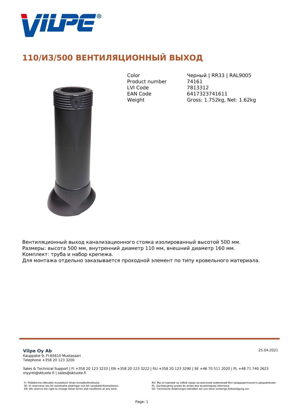 Комплектация:Труба ф110 (наружный ф160) - 1 шт.Крепеж - саморезы 6х25 мм в цвет + насадкаОписание:Вентиляционный выход канализационного стояка изолированный высотой 500 мм.Для монтажа отдельно заказывается проходной элемент по типу кровельного материала (
