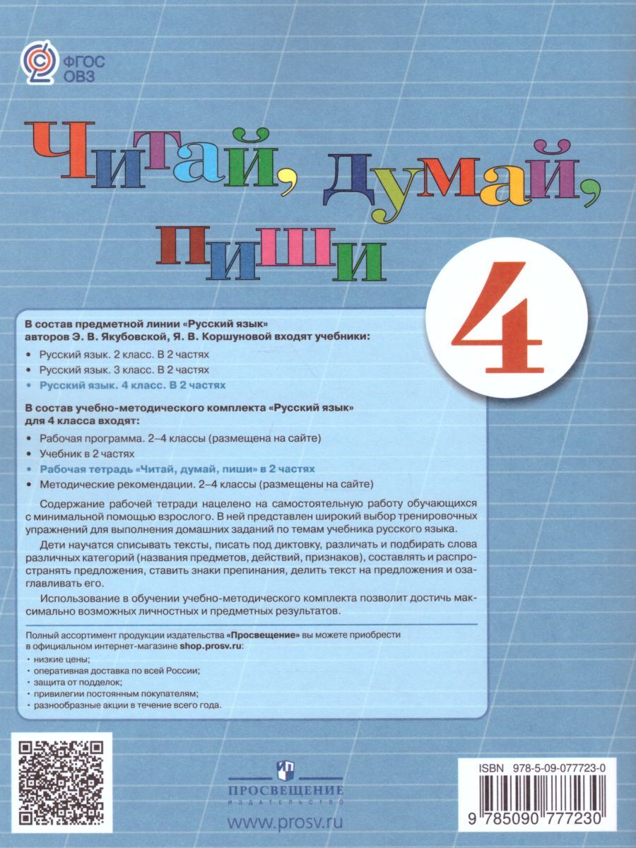Рабочая тетрадь для учащихся «Читай, думай, пиши» в 2 частях входит в состав учебно-методического комплекта по русскому языку для 4 класса, обеспечивающего реализацию требований адаптированной основной общеобразовательной программы в предметной области «Я