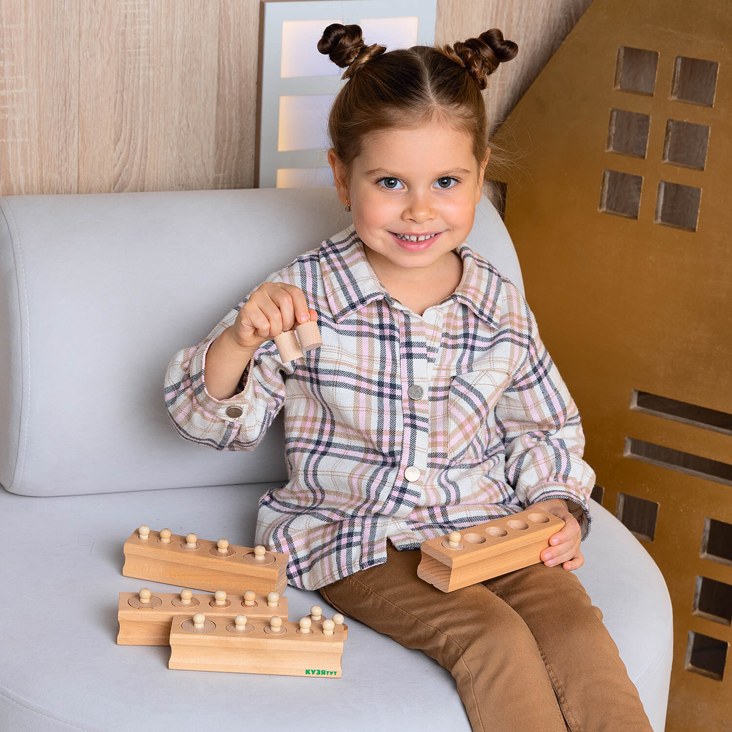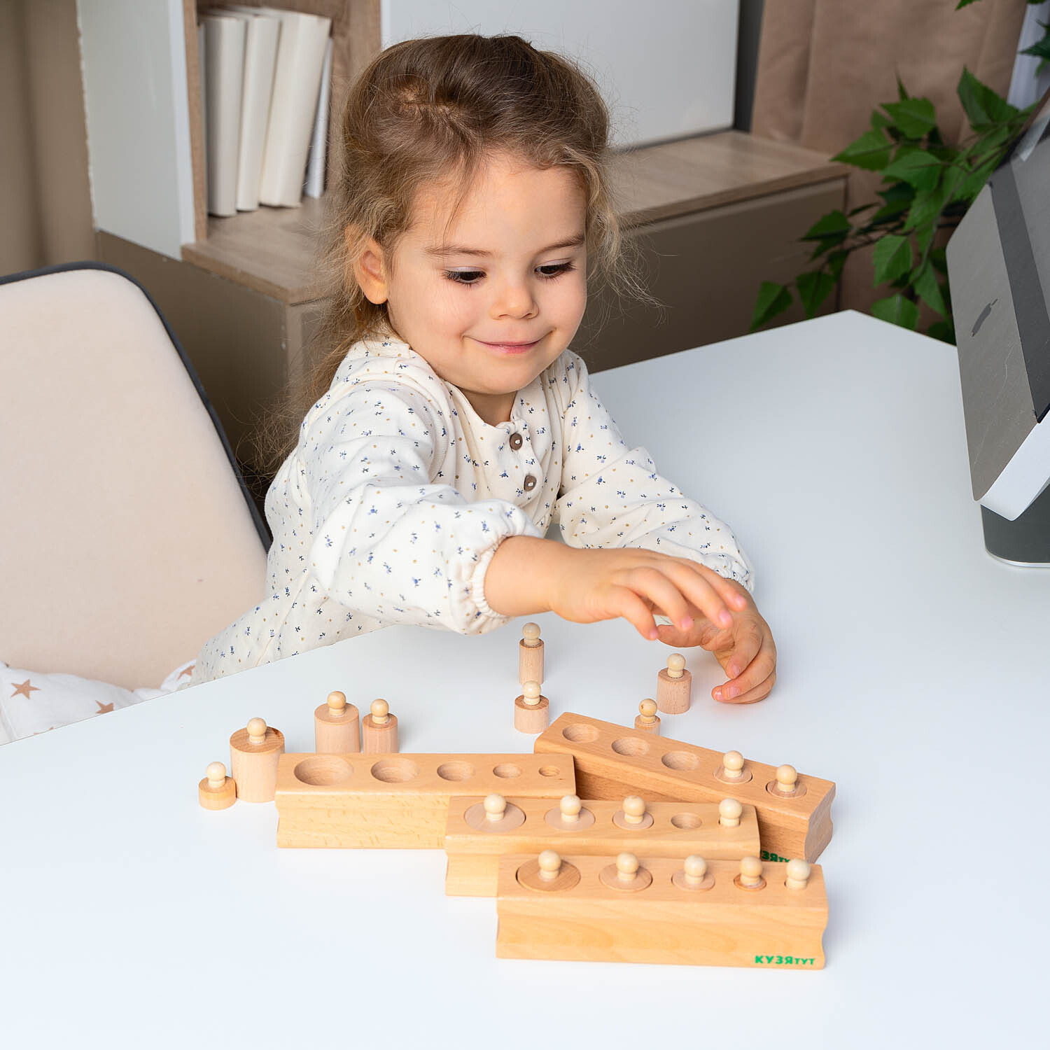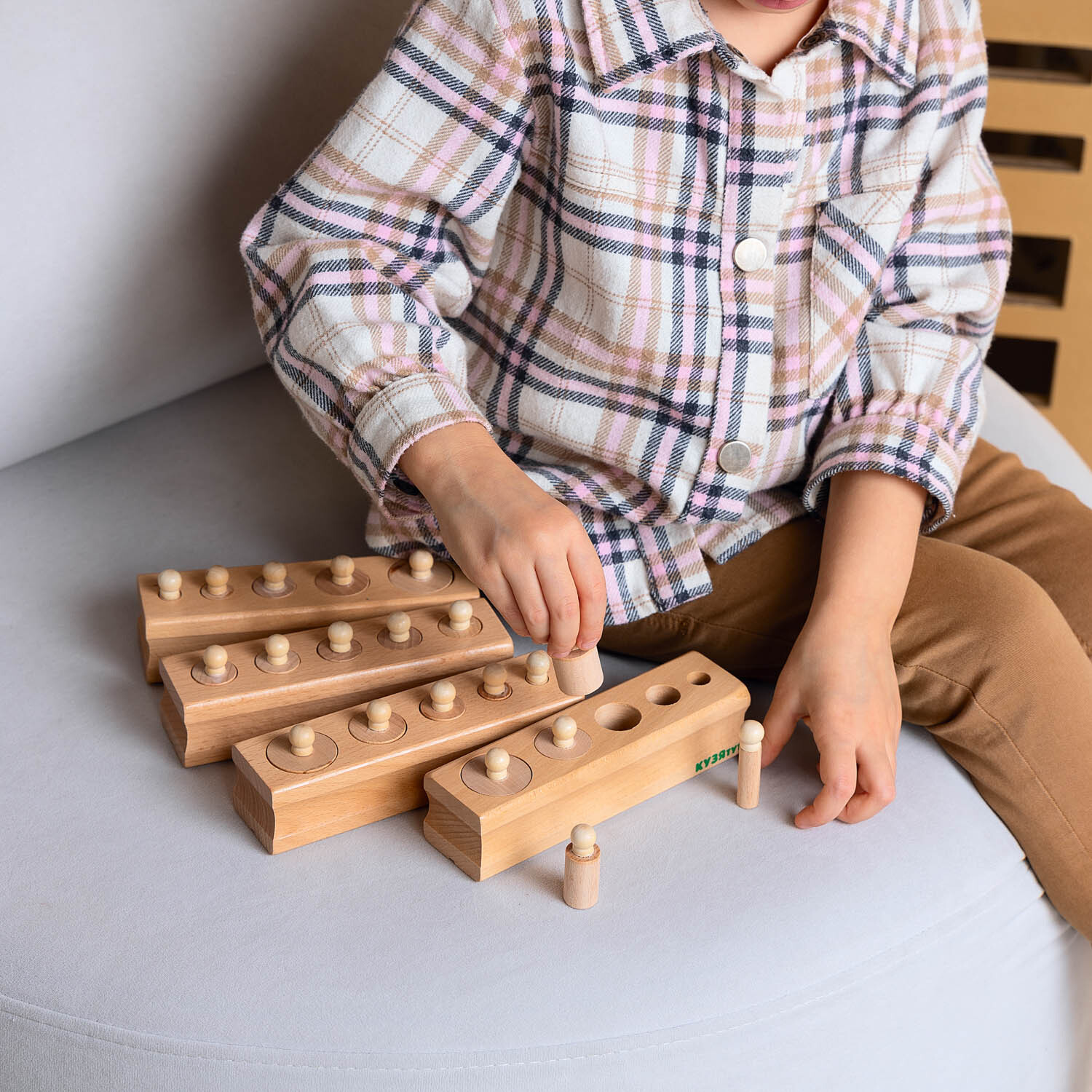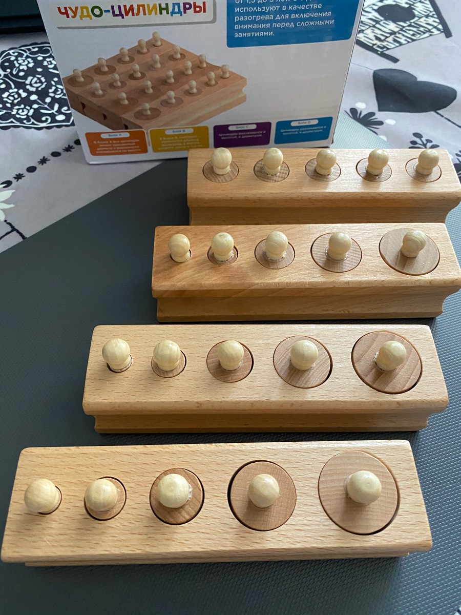 Комплектация:В набор входят 4 блока цилиндров разной высоты и диаметров, заводская фирменная упаковка.Описание:Самый популярный развивающий набор по методике Марии Монтессори - чудо цилиндры .В блоке А все цилиндры имеют одинаковый диаметр и равномерно ум