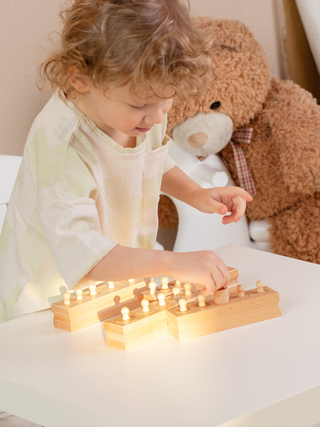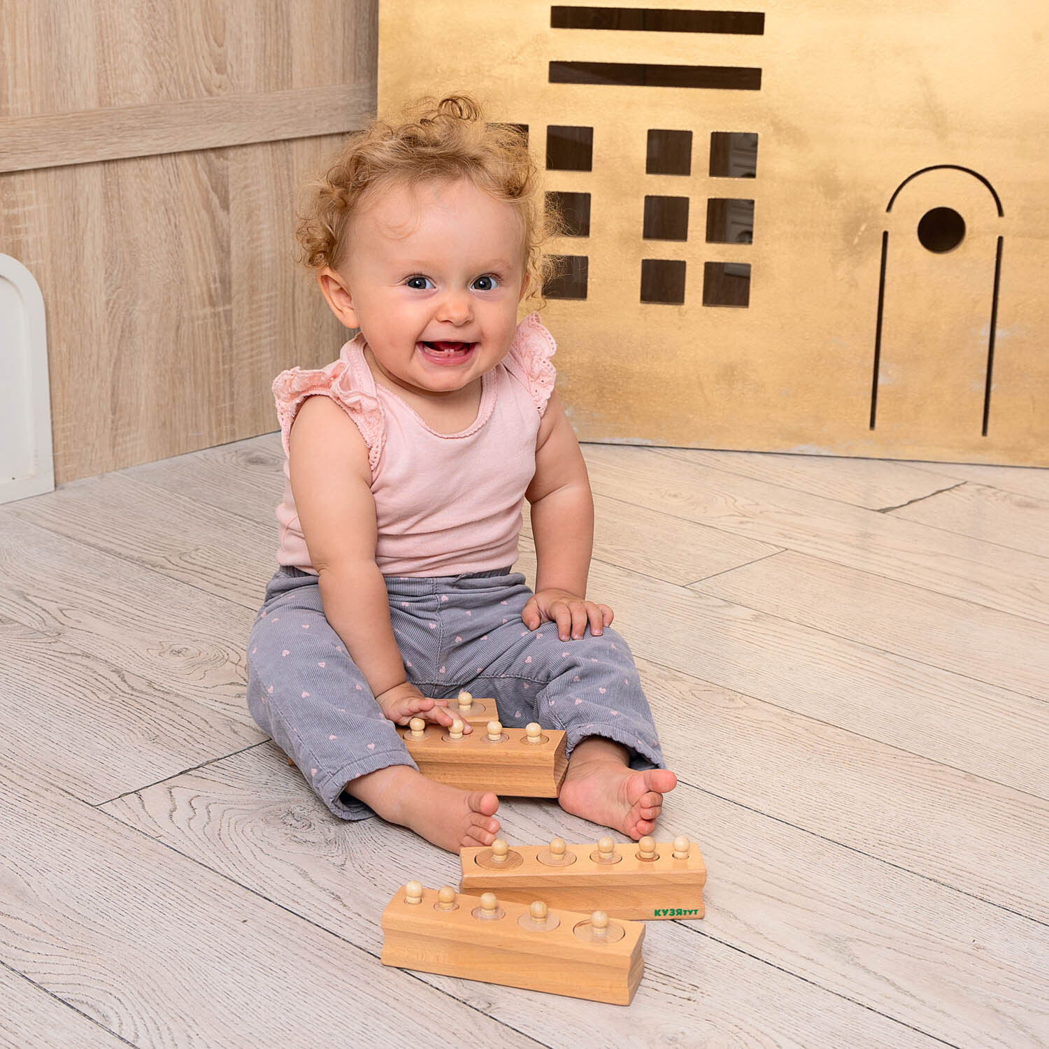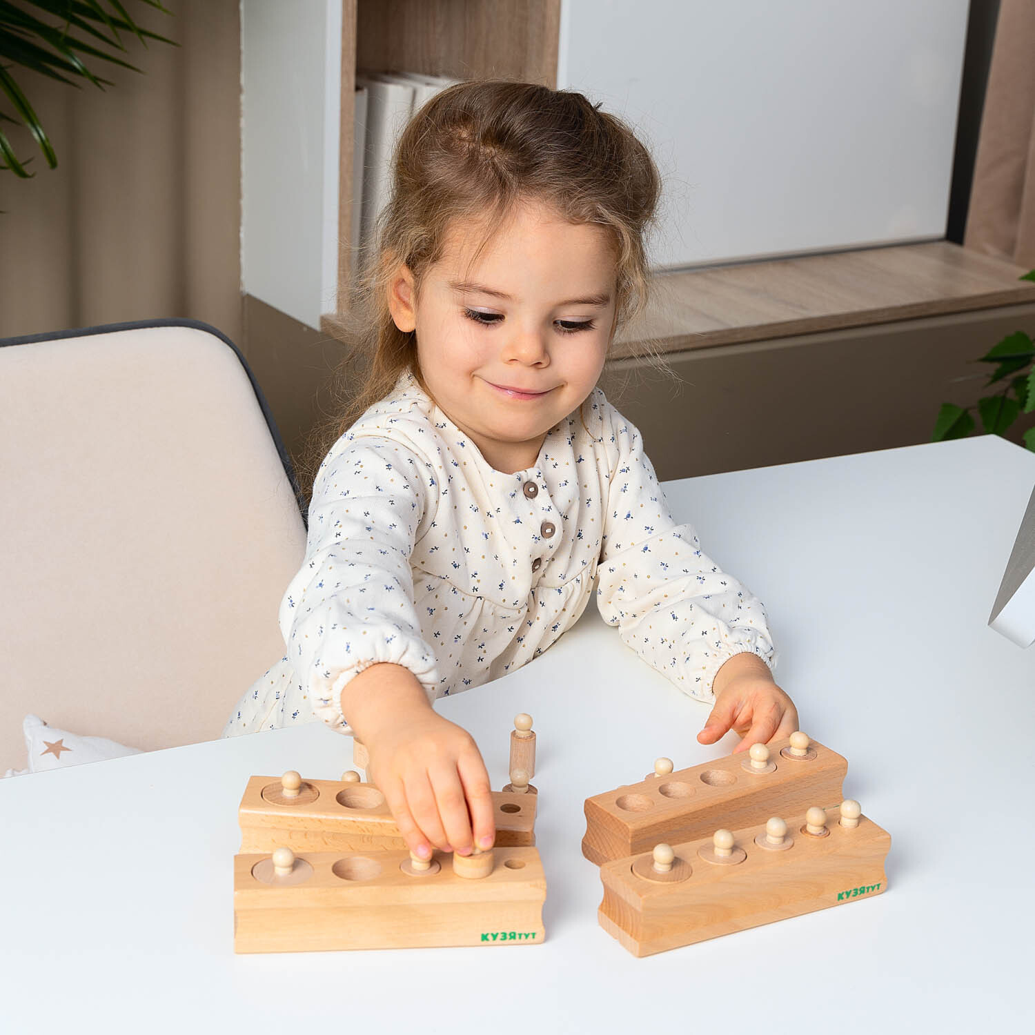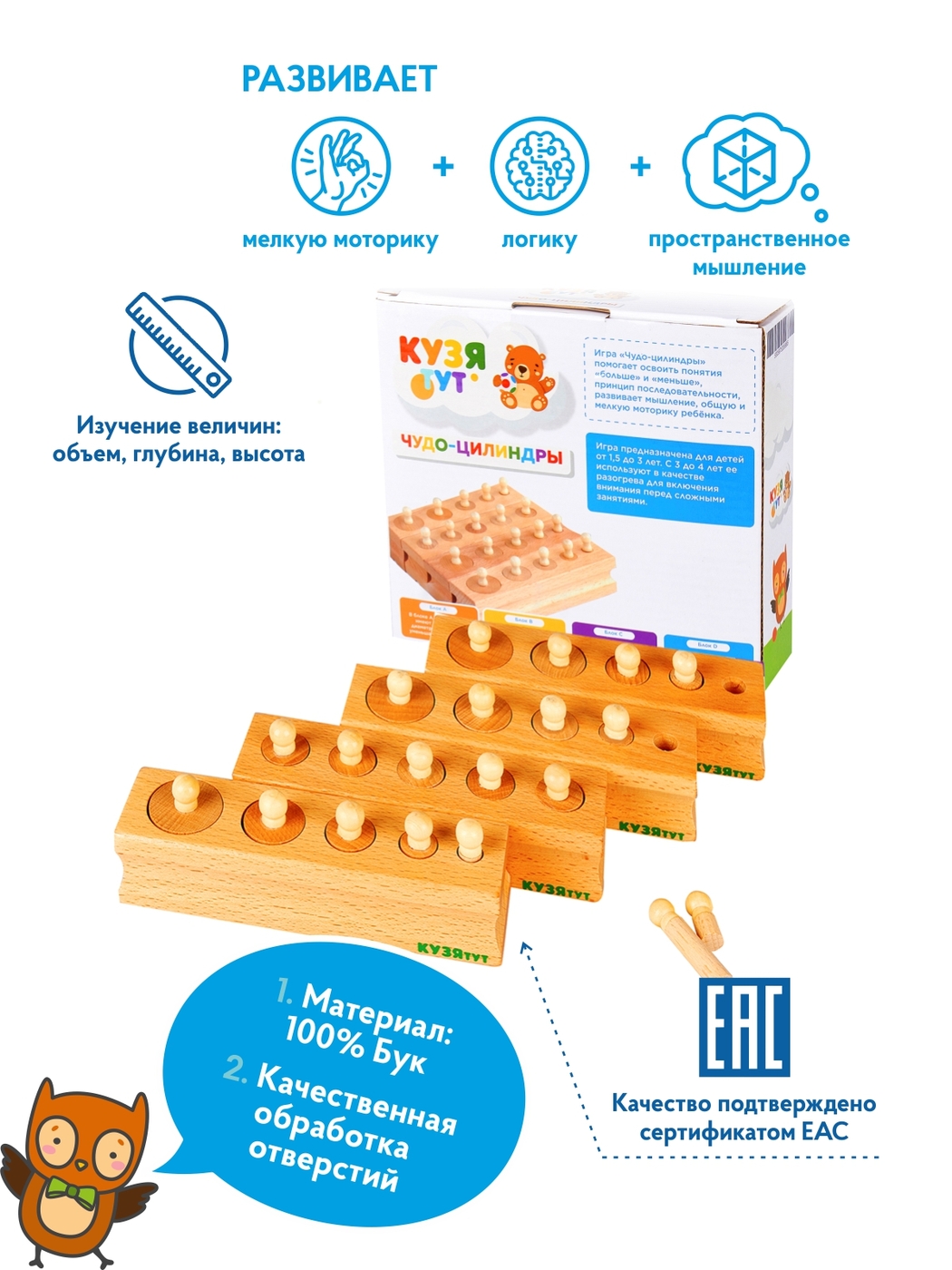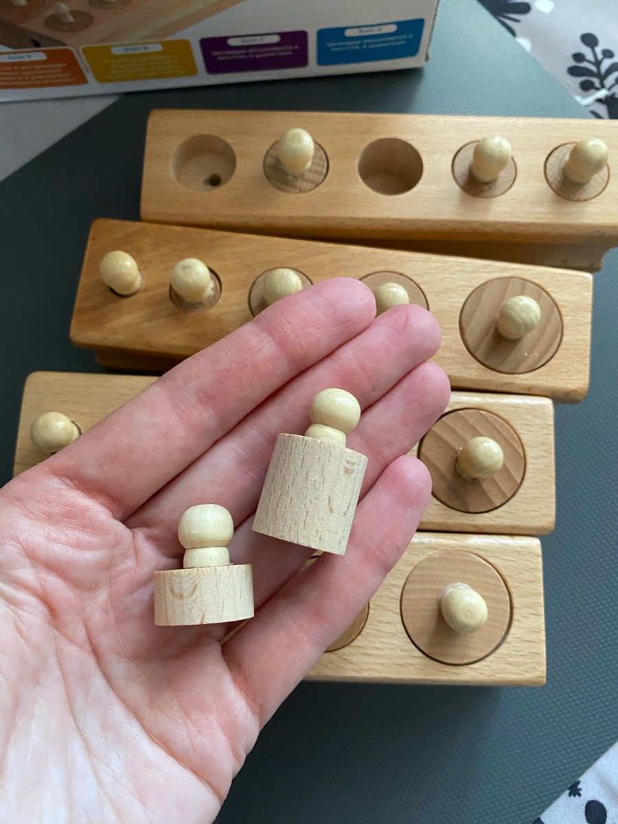 Комплектация:В набор входят 4 блока цилиндров разной высоты и диаметров, заводская фирменная упаковка.Описание:Самый популярный развивающий набор по методике Марии Монтессори - чудо цилиндры .В блоке А все цилиндры имеют одинаковый диаметр и равномерно ум