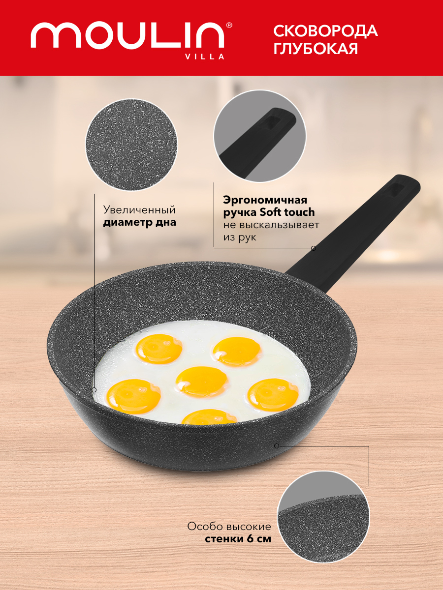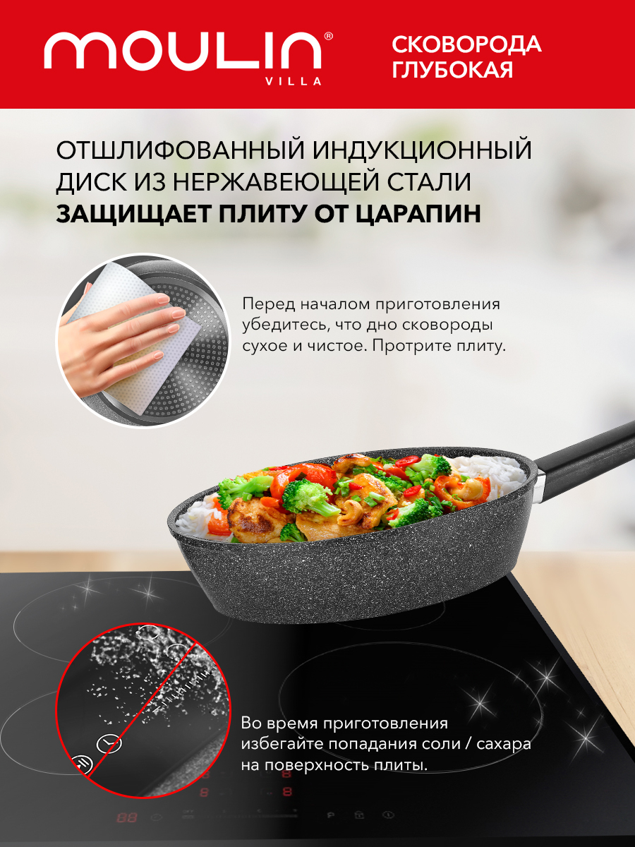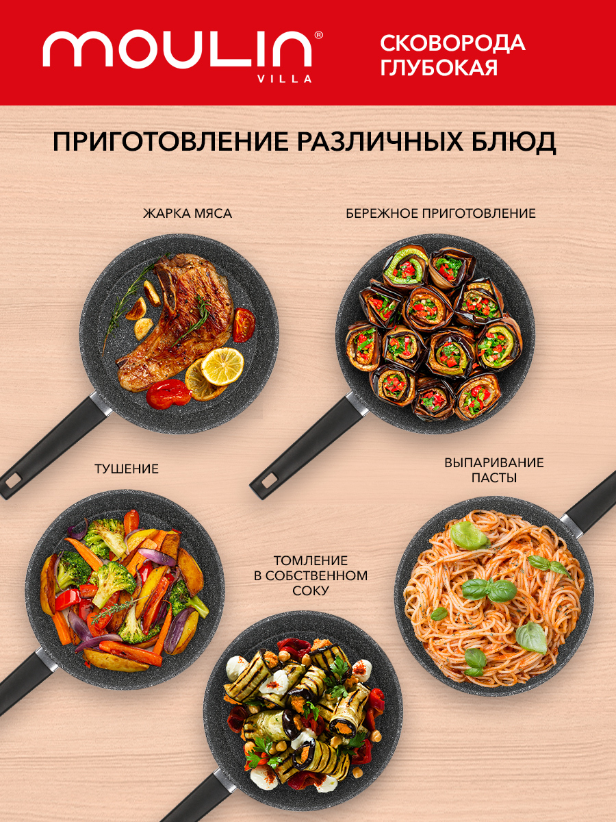 В глубокой сковороде антипригарной 24 см Impression IMP-24-DI можно и тушить, и жарить, в ней удобно перемешивать, не опасаясь перепачкать стол и плиту. Прожарка получается идеальной за счёт правильного распределения тепла и оптимальной толщины дна и стен