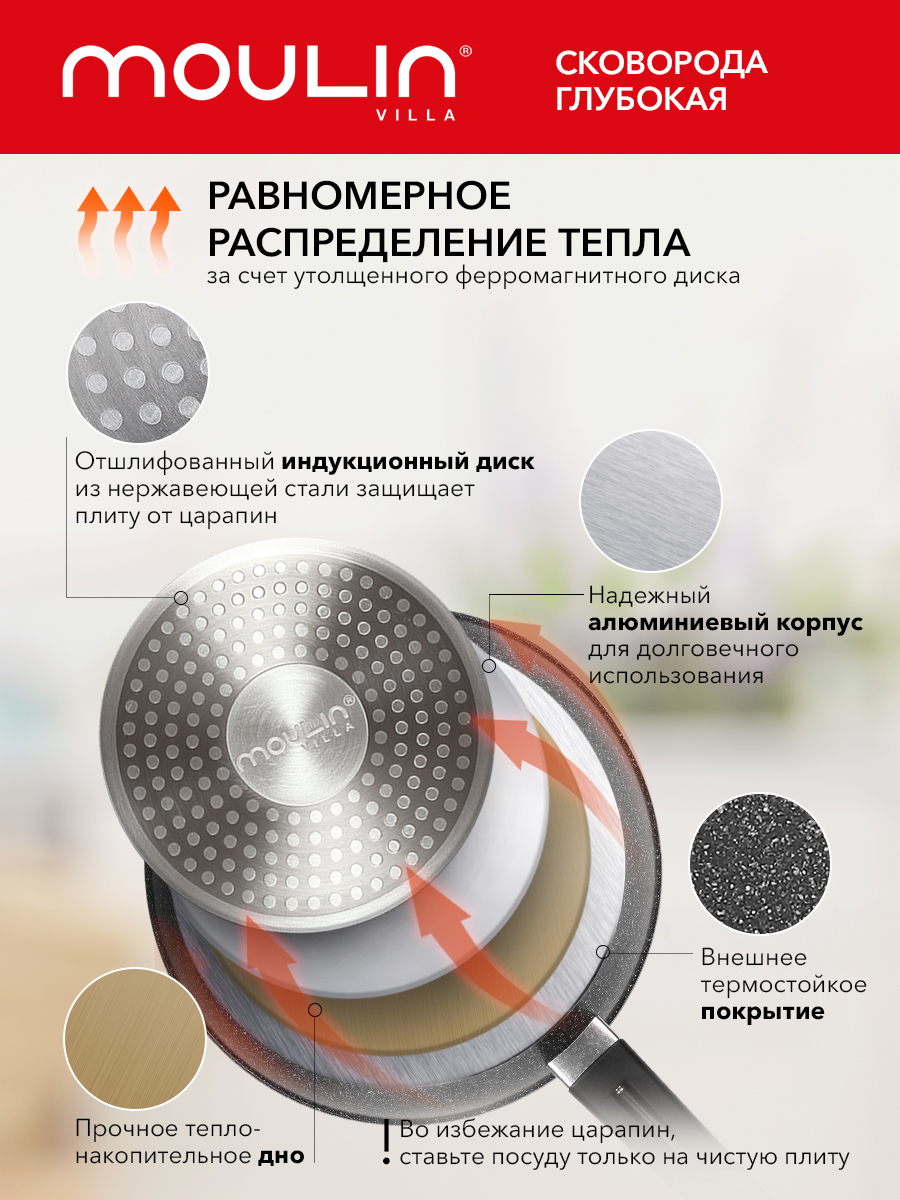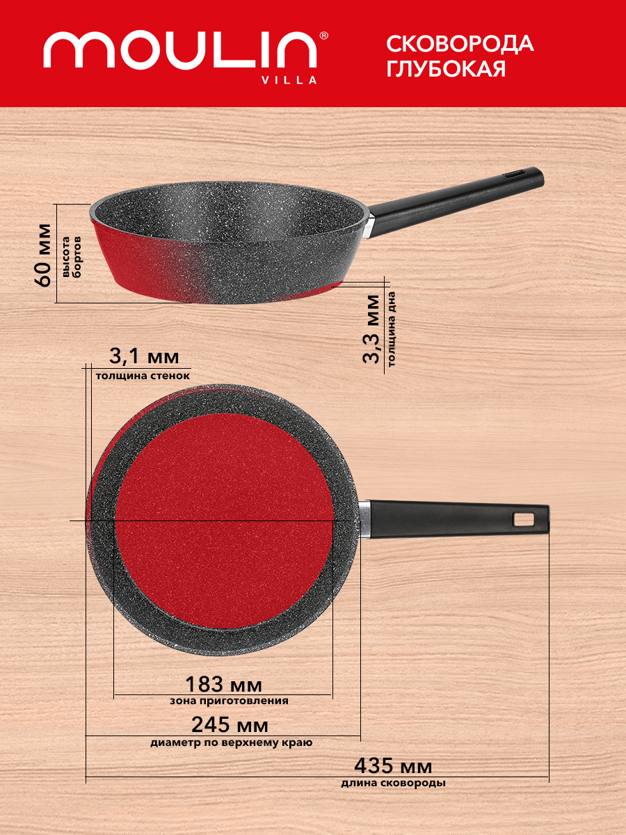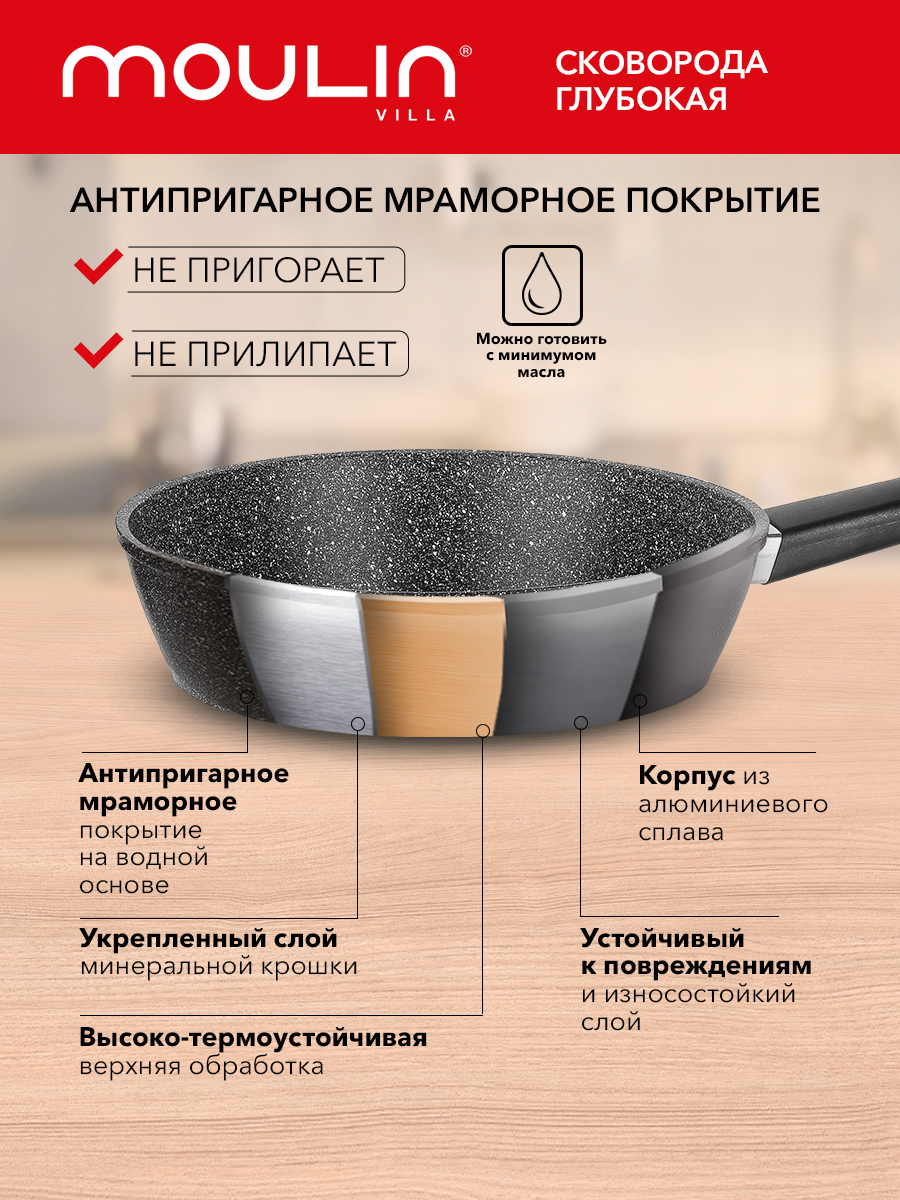 В глубокой сковороде антипригарной 24 см Impression IMP-24-DI можно и тушить, и жарить, в ней удобно перемешивать, не опасаясь перепачкать стол и плиту. Прожарка получается идеальной за счёт правильного распределения тепла и оптимальной толщины дна и стен