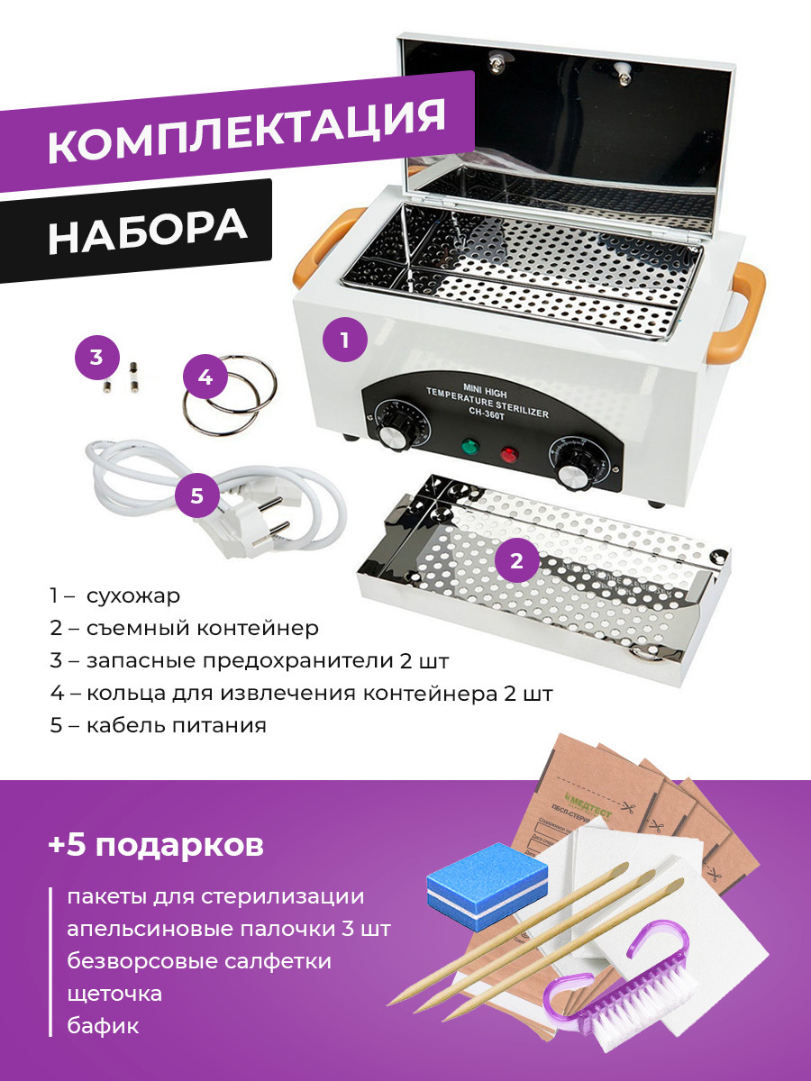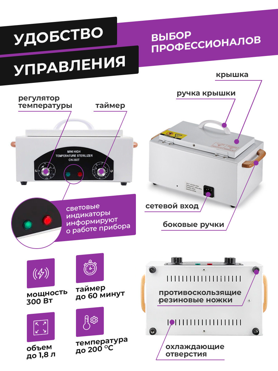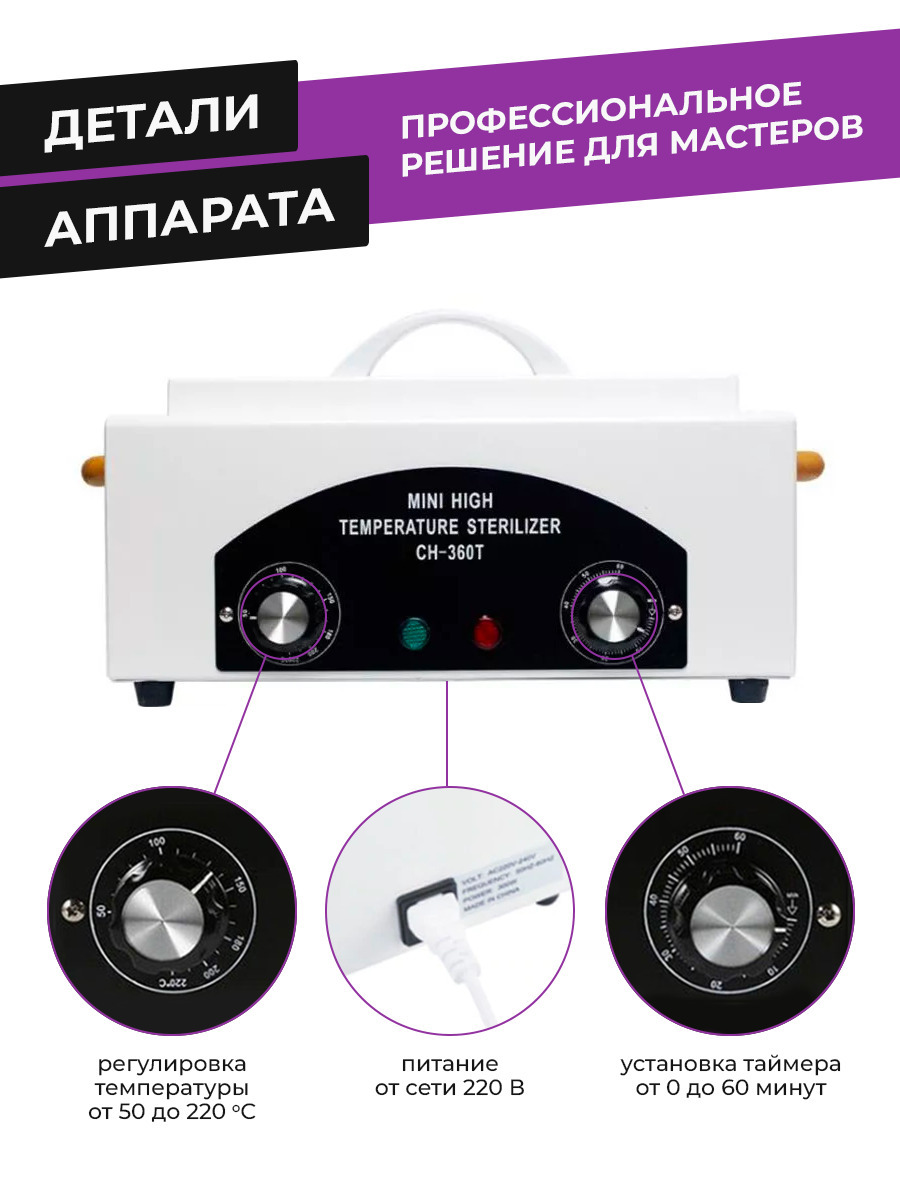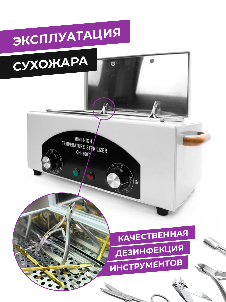Сухожаровой шкаф Ch-360T, мощностью 300 вт. Сухожаровой шкаф предназначен для стерилизации маникюрных и педикюрных инструментов. ОПЦИИРегулировка рабочей температуры стерилизатора до 220С. Контроль времени стерилизации, с помощью механического таймера со