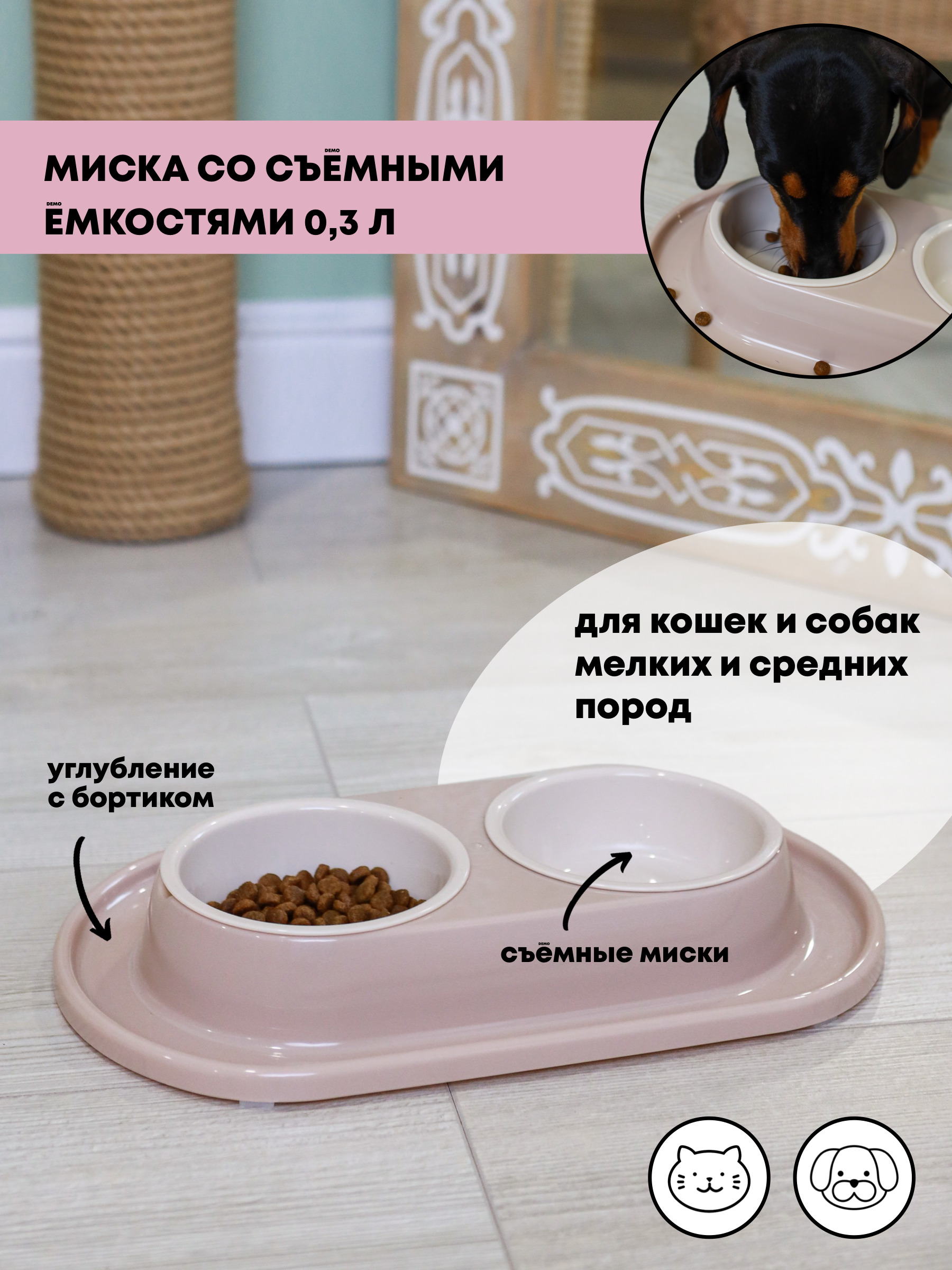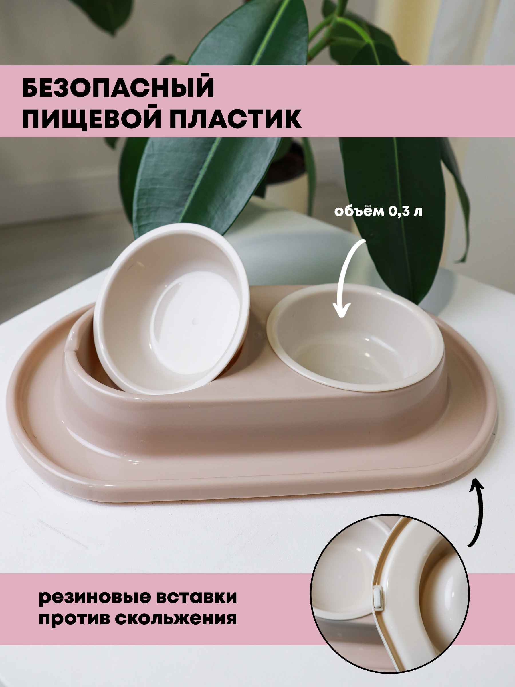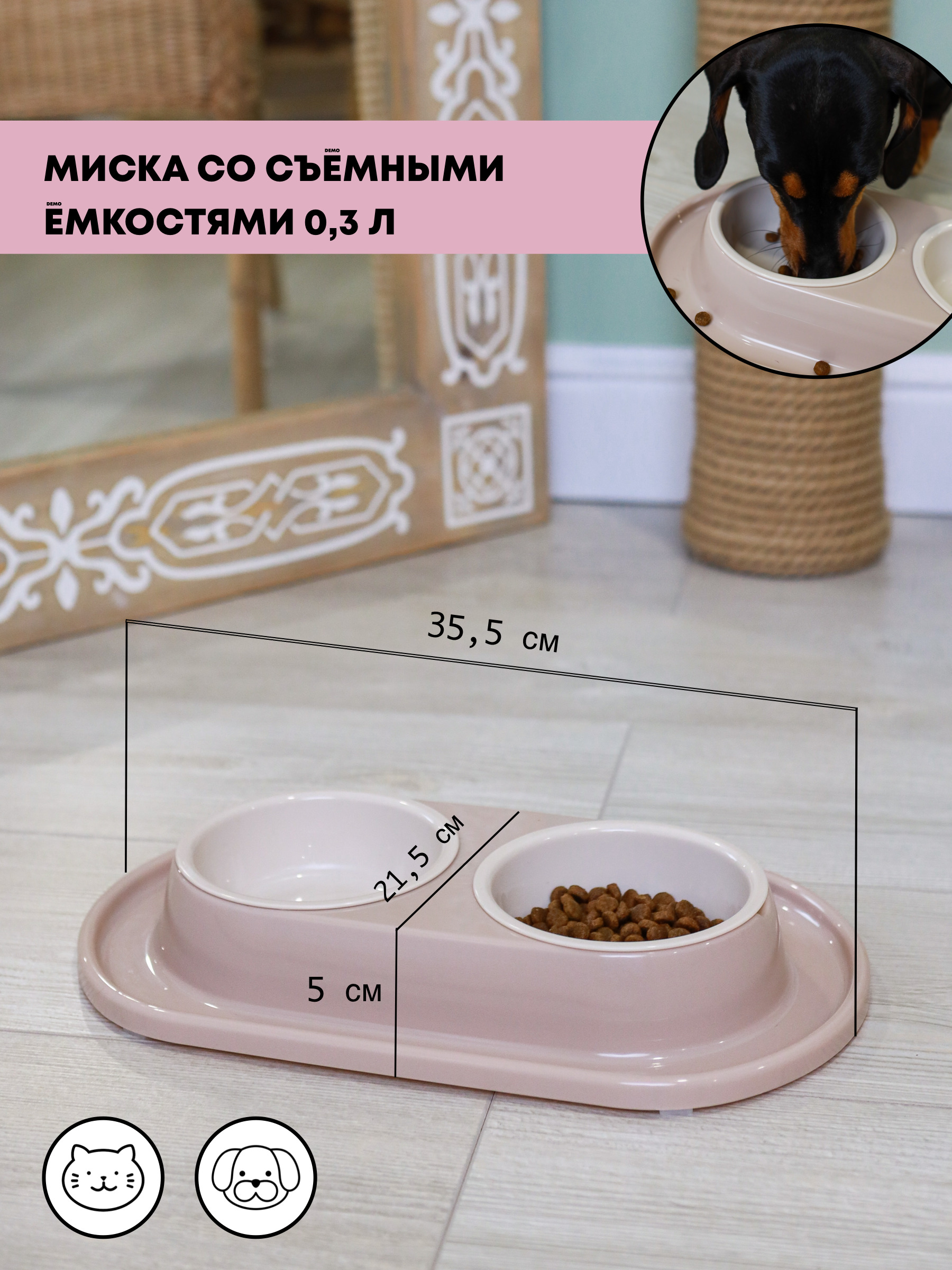 Двойная миска для кошек и собак мелких и средних пород отлично подойдёт для ваших питомцев. Объём одной миски - 0.3л. Ширина - 35,5 см. Глубина - 21,5 см. Высота - 5 смУ миски от DakiPets имеются резиновые вставки, которые обеспечивают неподвижность подст