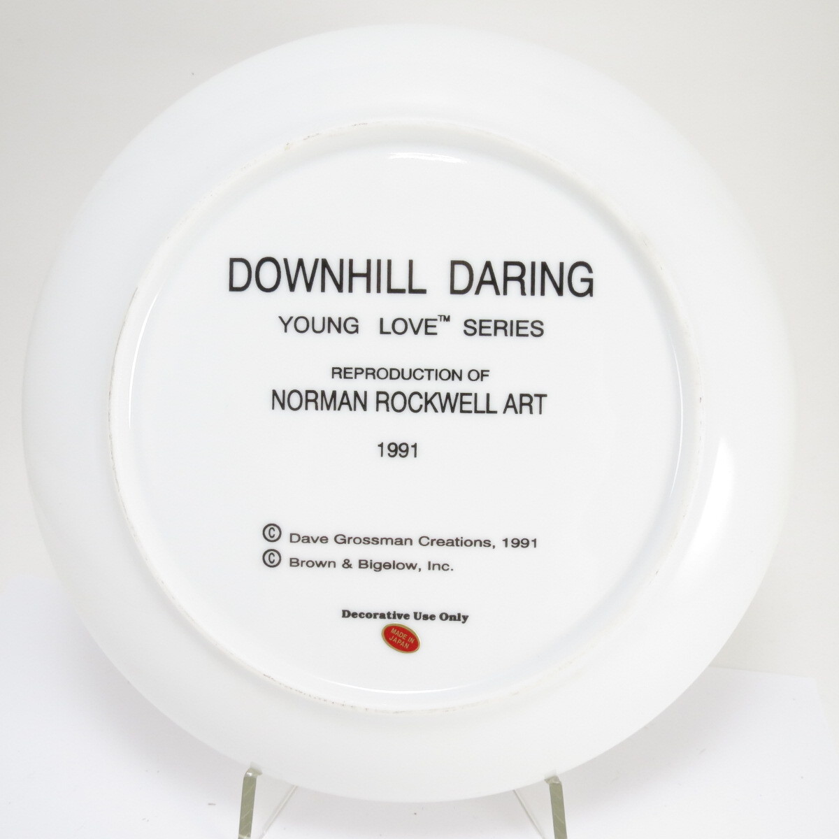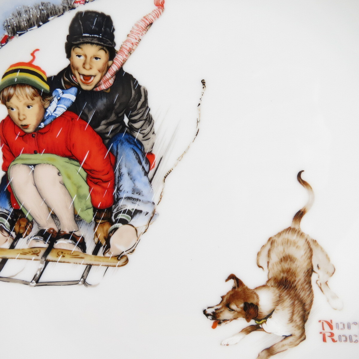 Декоративная коллекционная фарфоровая тарелка из серии "Маленькие Любимчики". На тарелке изображены мальчишники, спускающиеся сидя на санках с крутого склона. Рядом с ними так же скачет пес. Работа художника Нормана Роквелла.Тарелка пронумерованная уникал