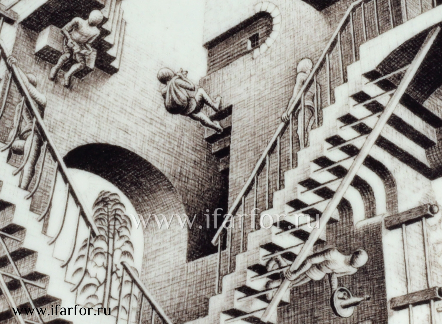 Декоративная тарелка Относительность Форма: Эллипс средняяИзделие изготовлено из материала: ФарфорАвтор росписи: Эшер М.К.Производитель: Stoppard