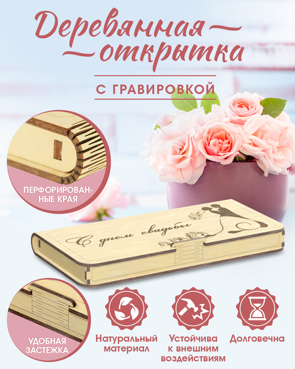 Дерево особенный материал, способный передать важность события, подчеркнуть особенное отношение жениха, невесты и их родителей к гостям. Заказав деревянные открытки на свадьбу, вы показываете знакомым, родственникам, друзьям как вы к ним относитесь. Стиль