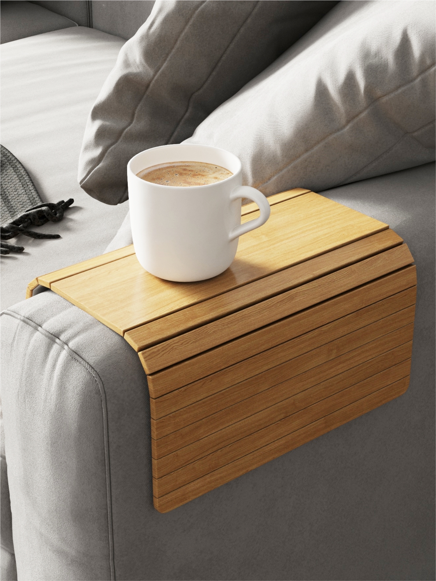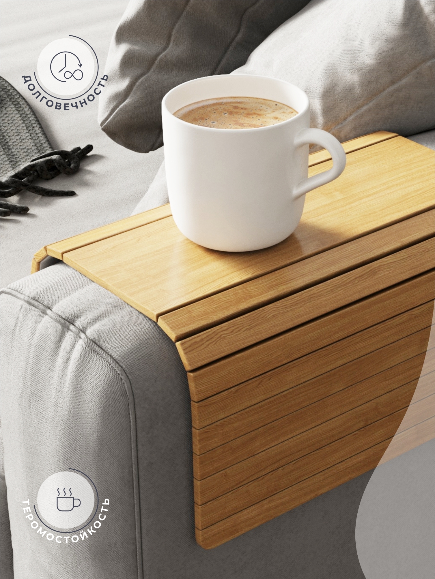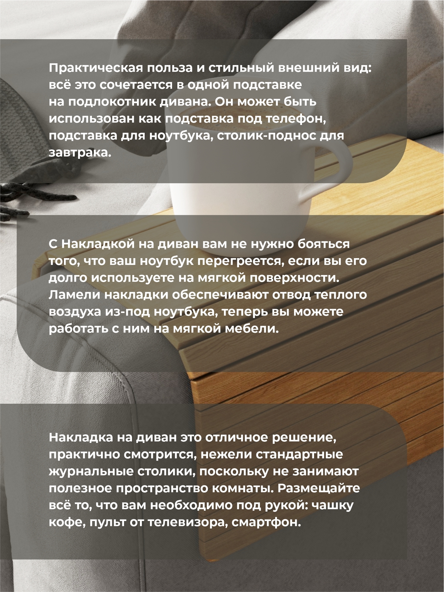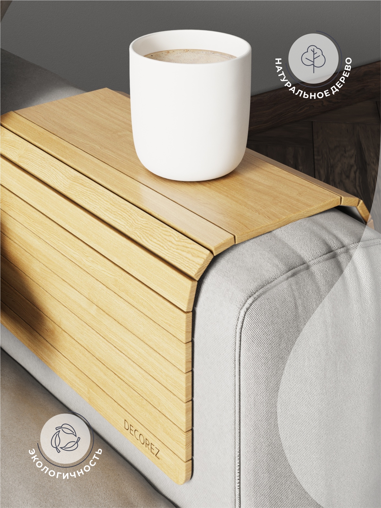 Накладка Decorez предназначена для создания полезного места на подлокотнике дивана. С её помощью можно сделать удобную подставку для ноутбука, планшета, кружки с каким-нибудь напитком. Получается сплошная ровная поверхность. Допустим, можно с удобством ра