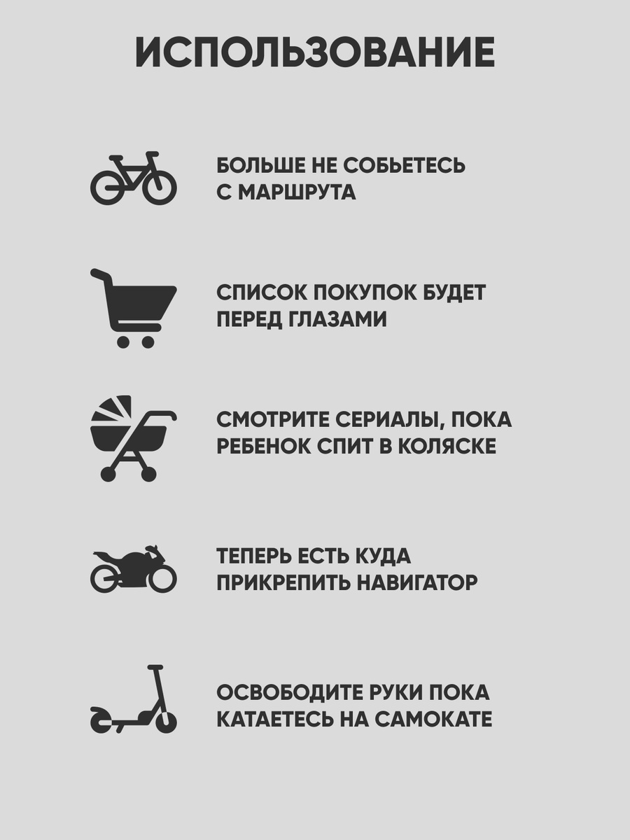 Металлический держатель для смартфона устанавливается на руль велосипеда, самоката, мопеда или мотоцикла. Прочное крепление надежно фиксирует держатель на руле. Подходит для крепления смартфонов шириной от 55 до 100 мм. Крепление имеет мягкие подушки, для