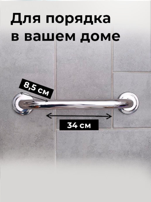 Поручень для ванны выполнен из нержавеющей стали. Подойдет для крепления на стенах ванной или туалета, а также в коридорах. Поручень для туалета позволит иметь опору при усаживании или при подъеме. 34 см - общая длина поручня с креплениями. Подходит для б