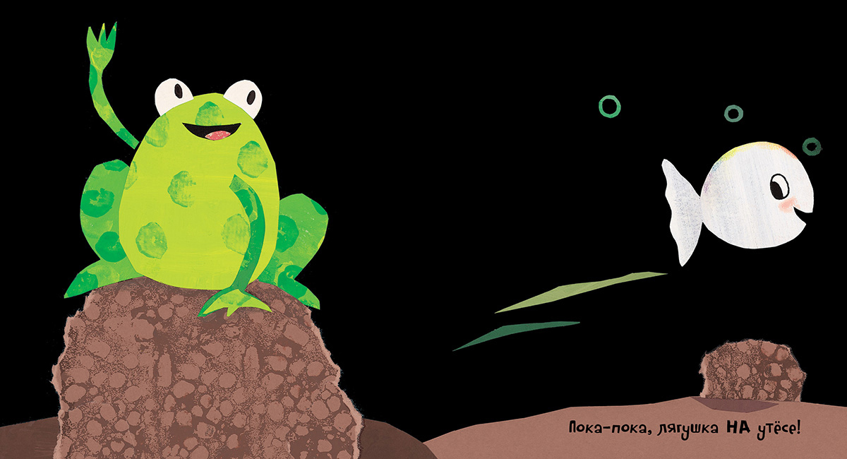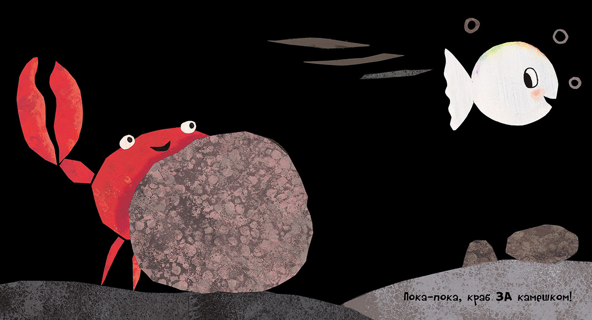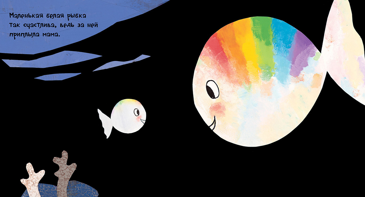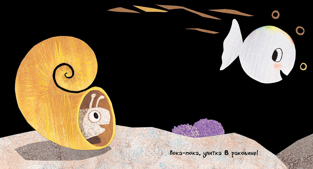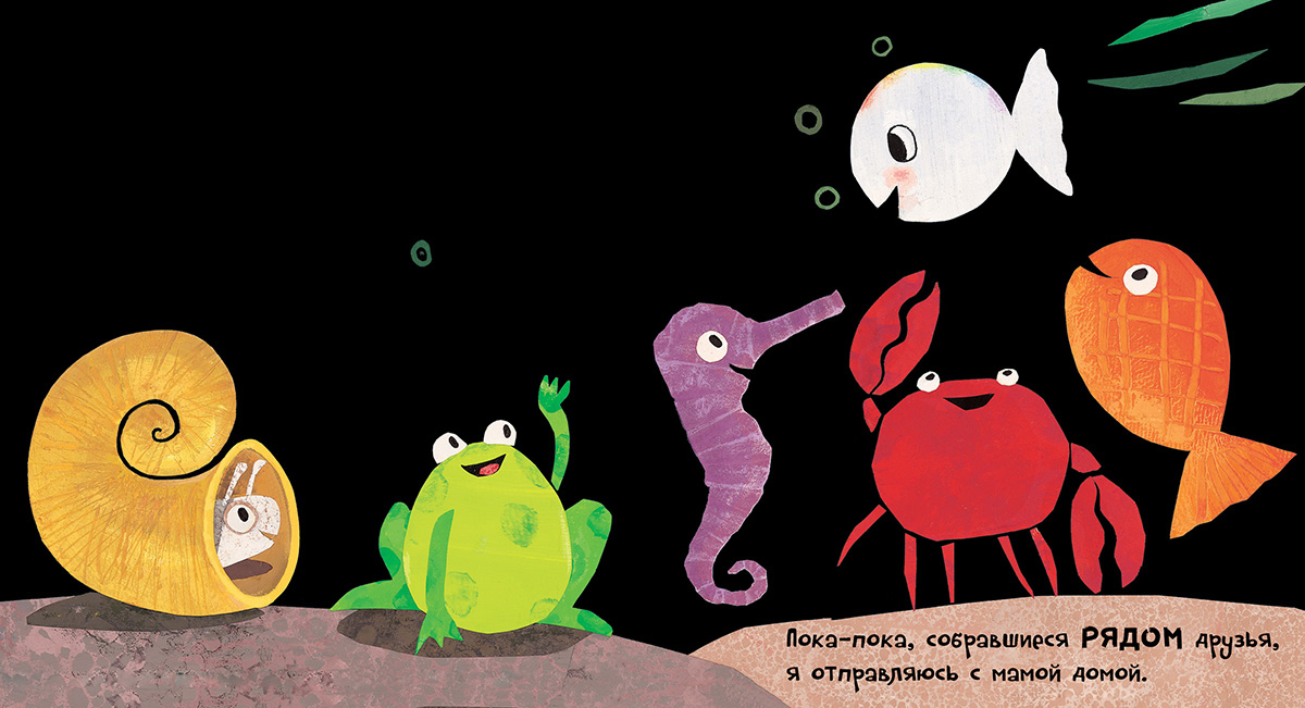 Маленькая белая рыбка так счастлива, ведь за ней приплыла мама! Но перед тем как плыть домой, надо обязательно попрощаться со всеми друзьями: улиткой в раковине, лягушкой на утёсе, морским коньком под листом и крабом за камешком. Не стоит расстраиваться –