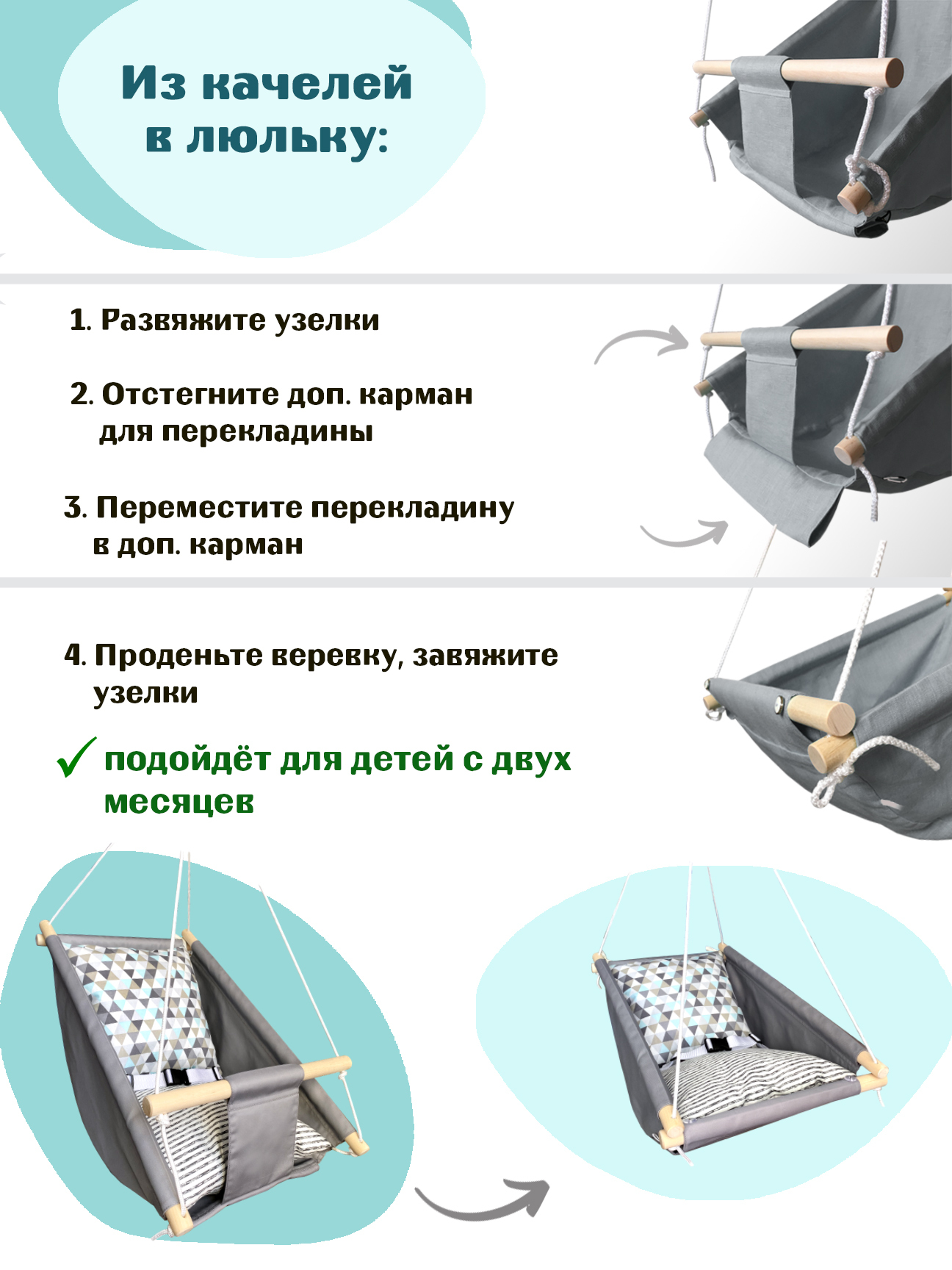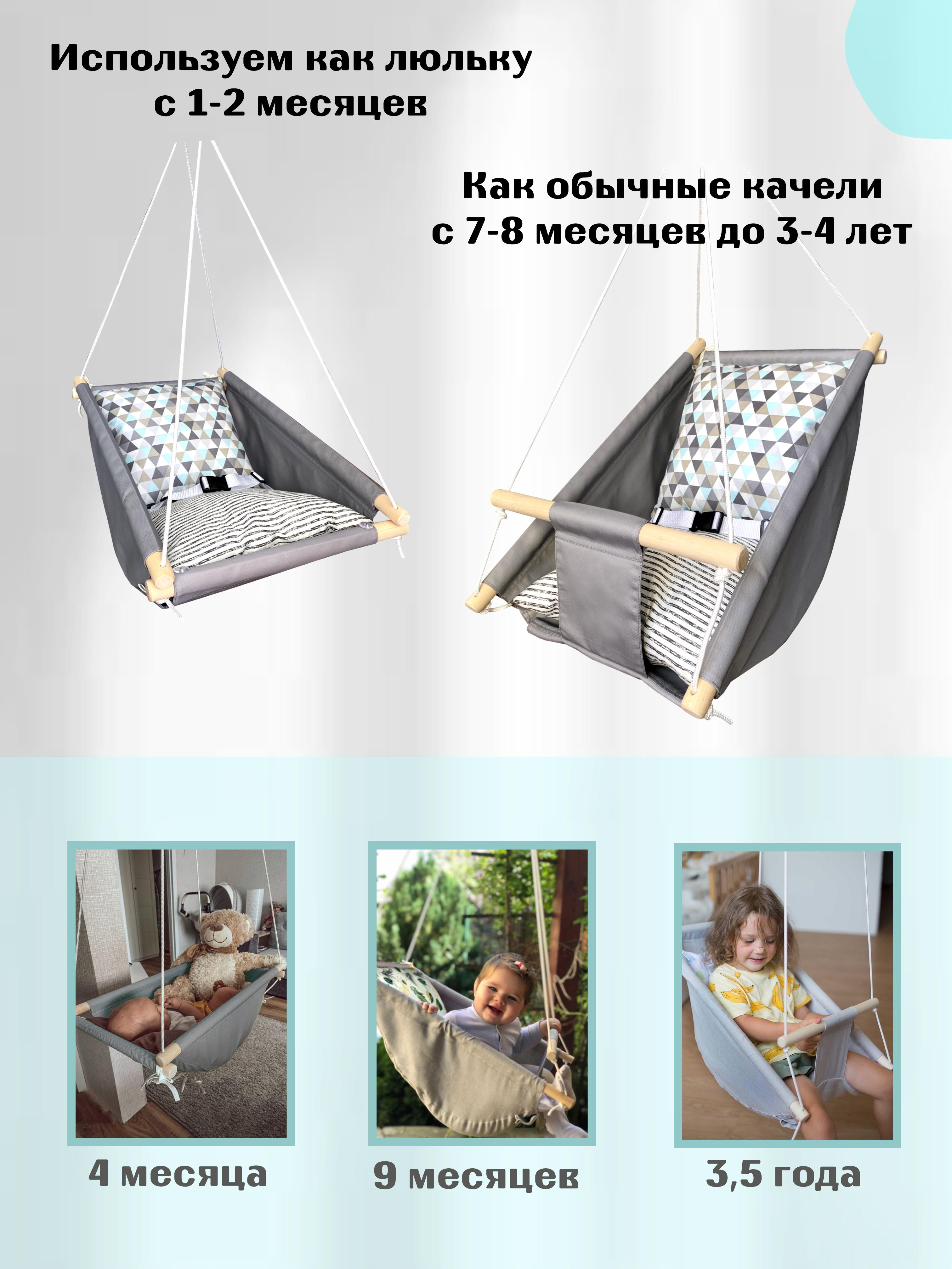 Детские качели подойдут для деток от 1-2 месяцев до 4-5 лет.Качели-транформер удобны тем, что сначала пользуемся ими как люлькой (с одного до шести месяцев)Затем ставим перегородку, и качаем как в обычных качелях (с 6-8 месяцев до 3-4 лет)Позже вновь убир
