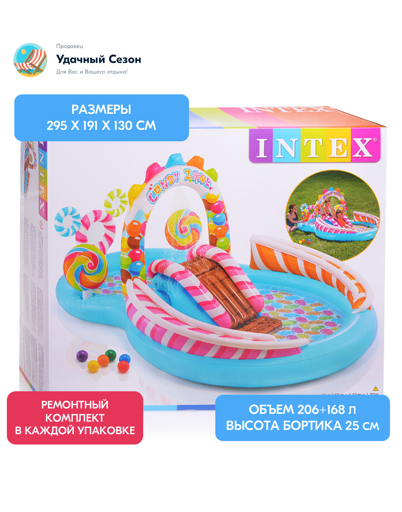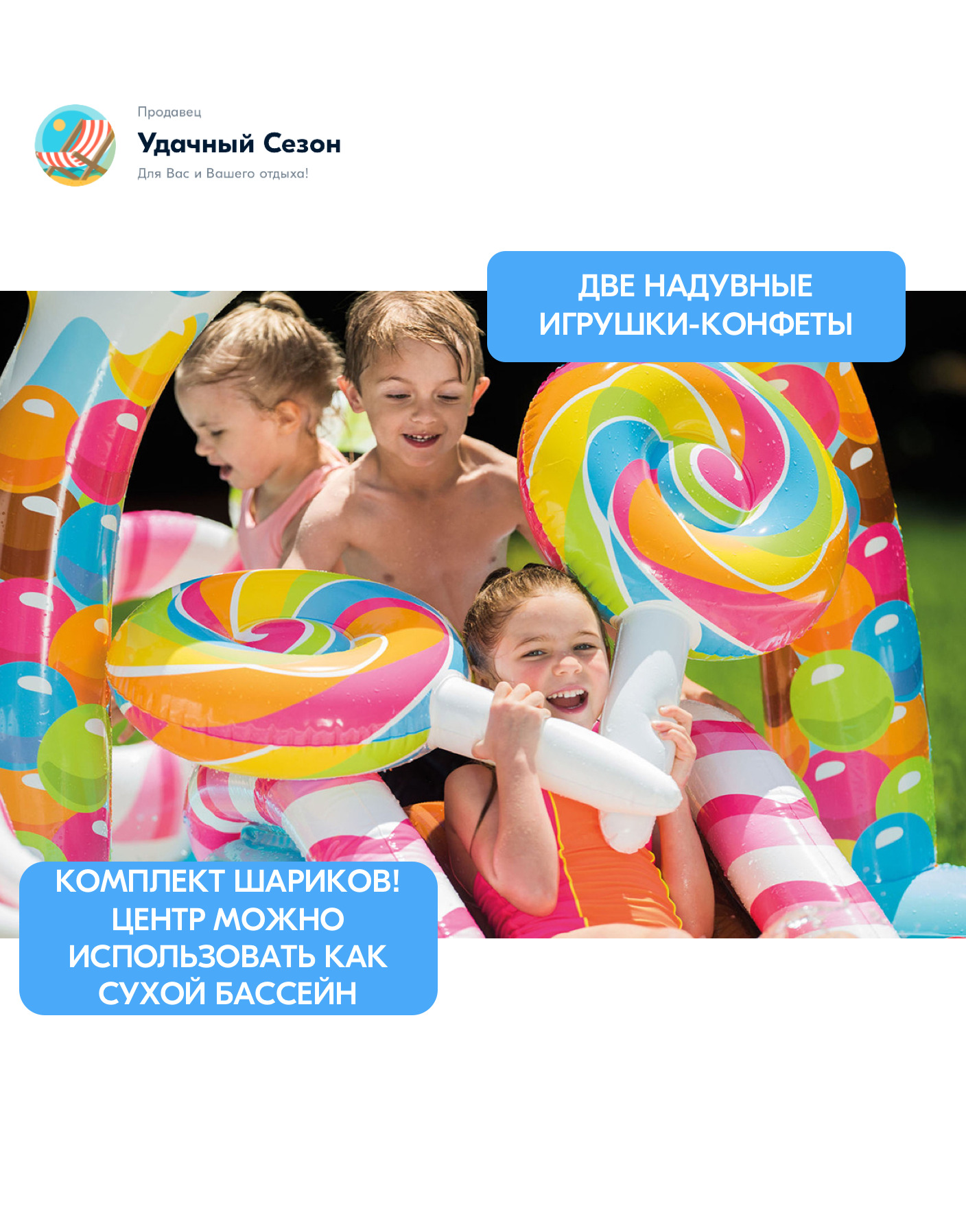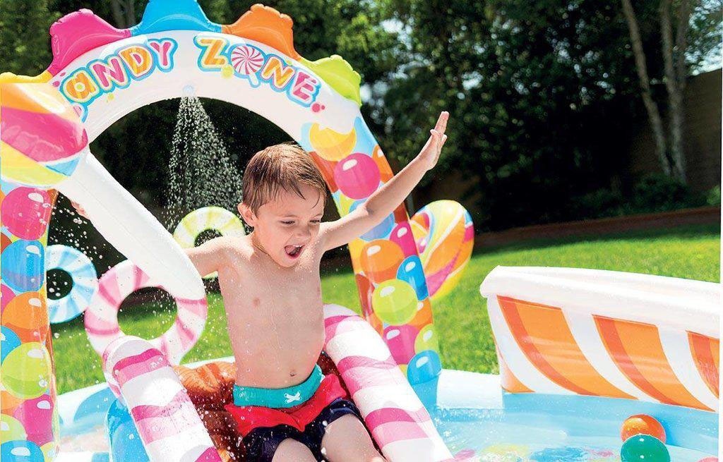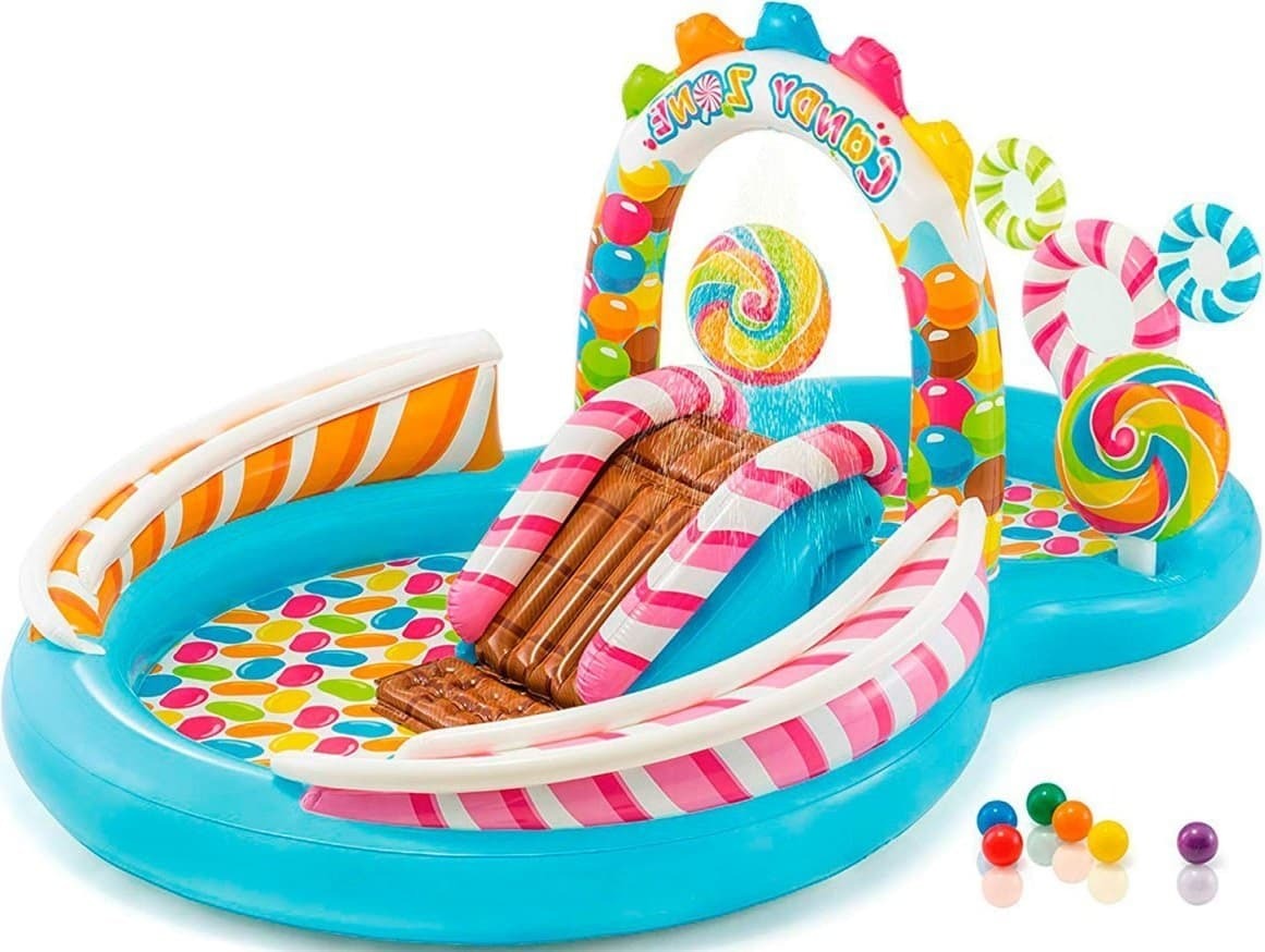 Детский надувной игровой центр Intex Candy Zone Play Center - это занимательный аттракцион, сотоящий из двух небольших бассейнов с горкой, разбрызгивателями, 2 надувными игрушками в форме леденцов и комплектом шариков.Надувной аттракцион предназначен для