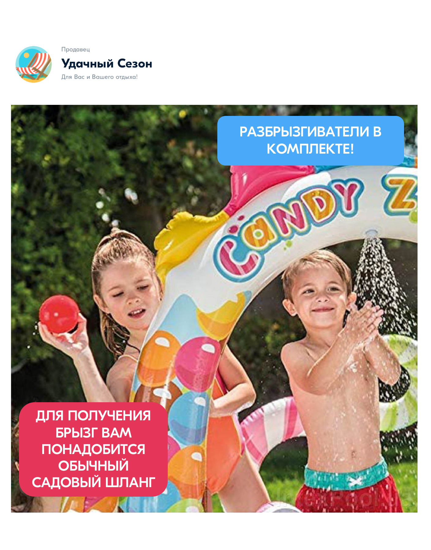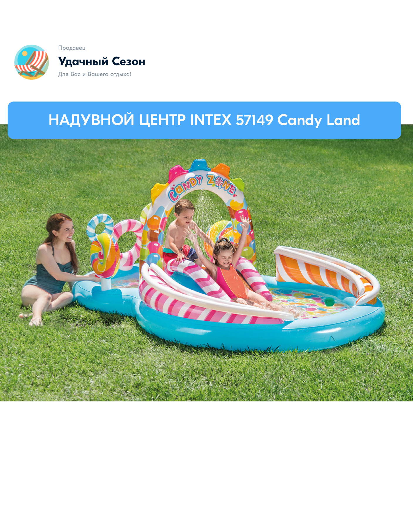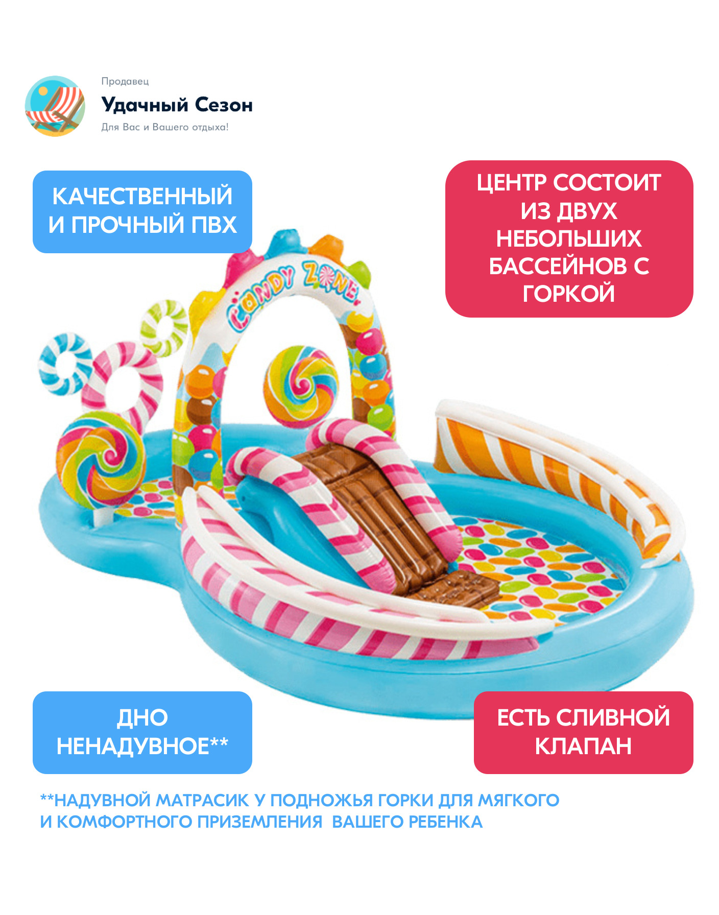 Детский надувной игровой центр Intex Candy Zone Play Center - это занимательный аттракцион, сотоящий из двух небольших бассейнов с горкой, разбрызгивателями, 2 надувными игрушками в форме леденцов и комплектом шариков.Надувной аттракцион предназначен для