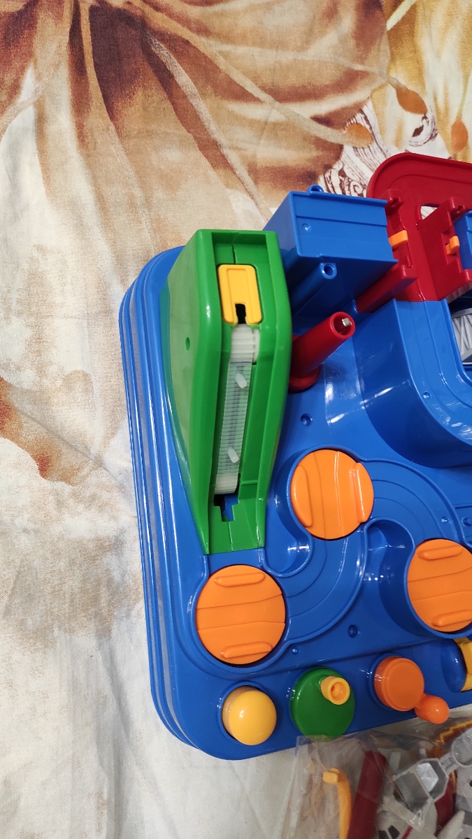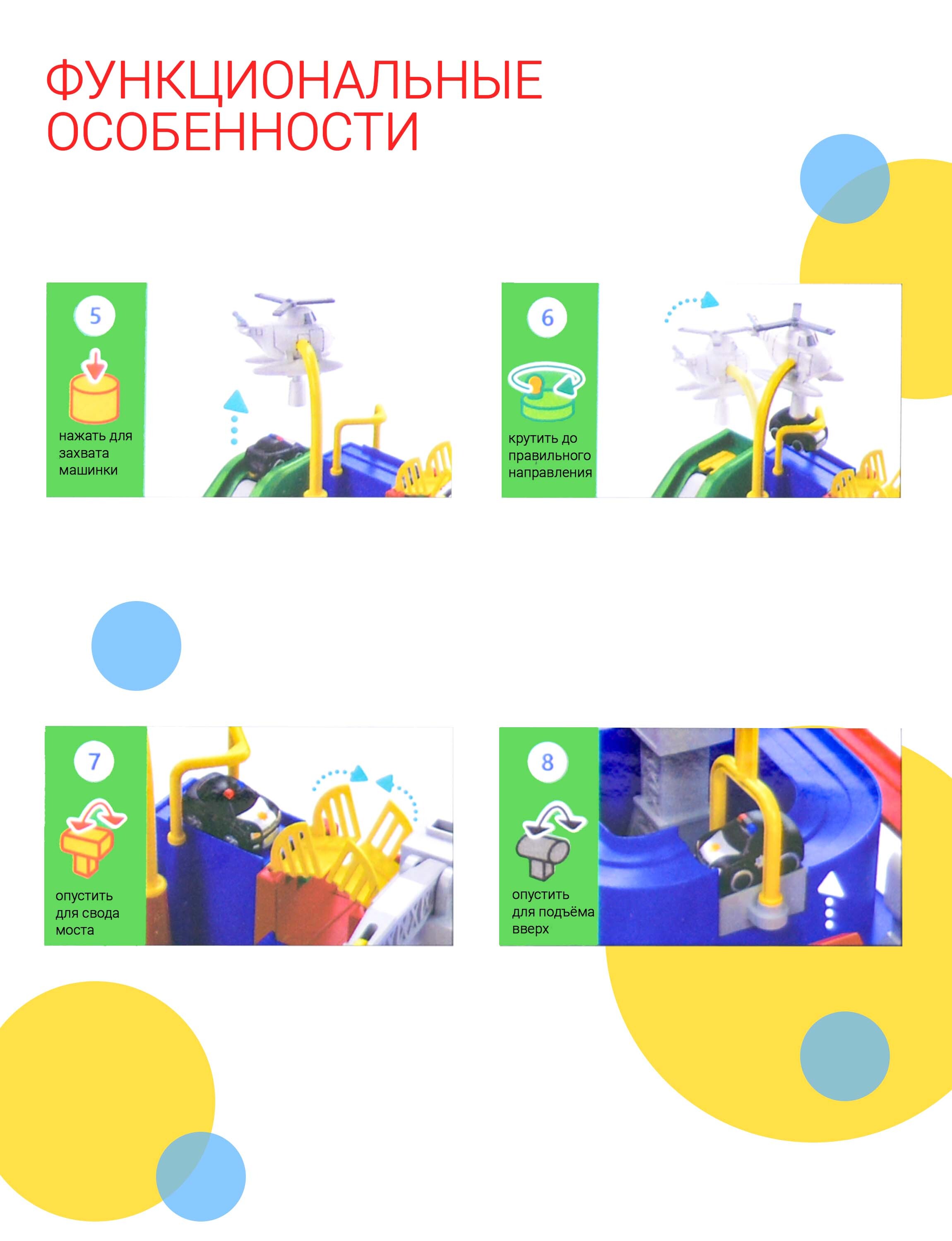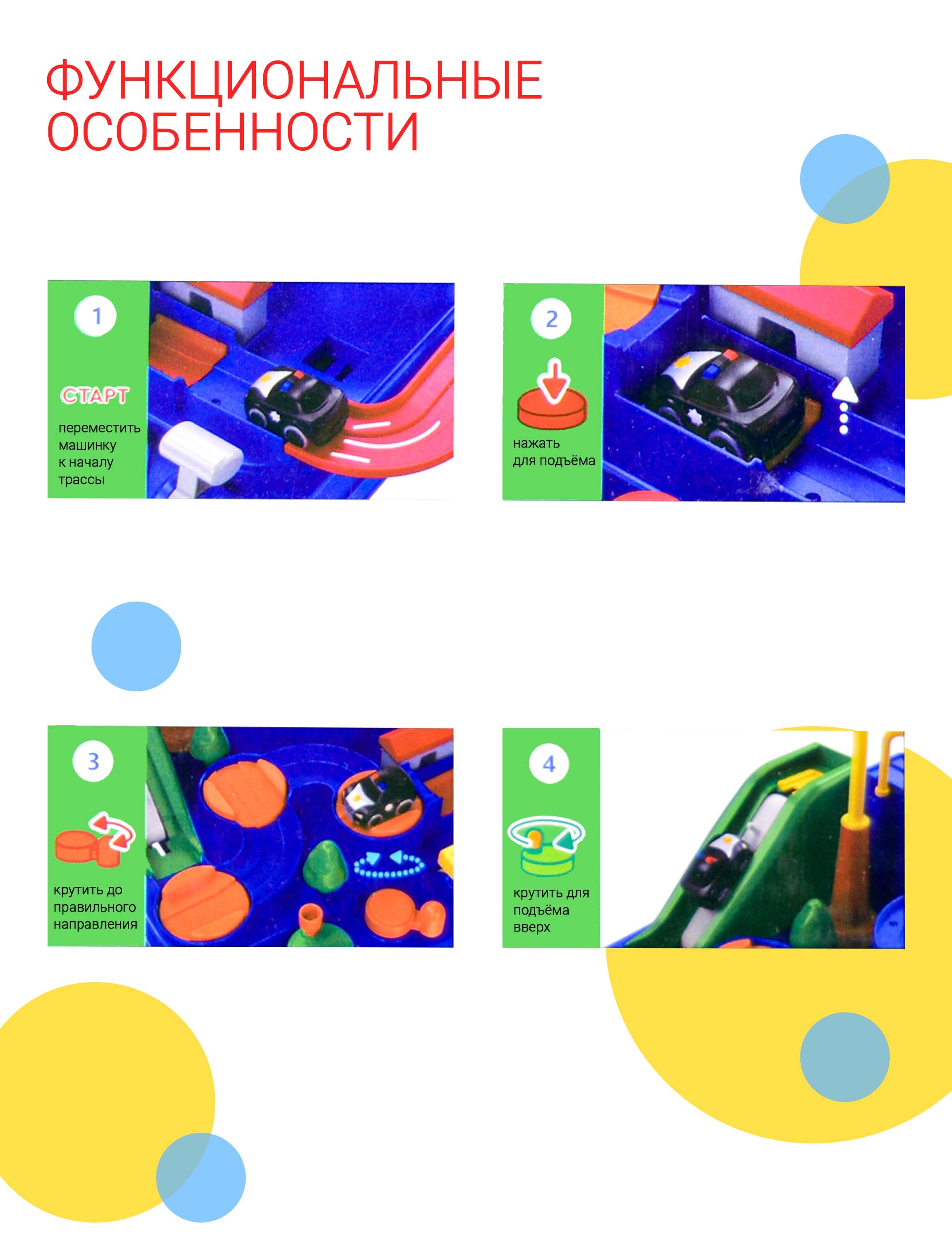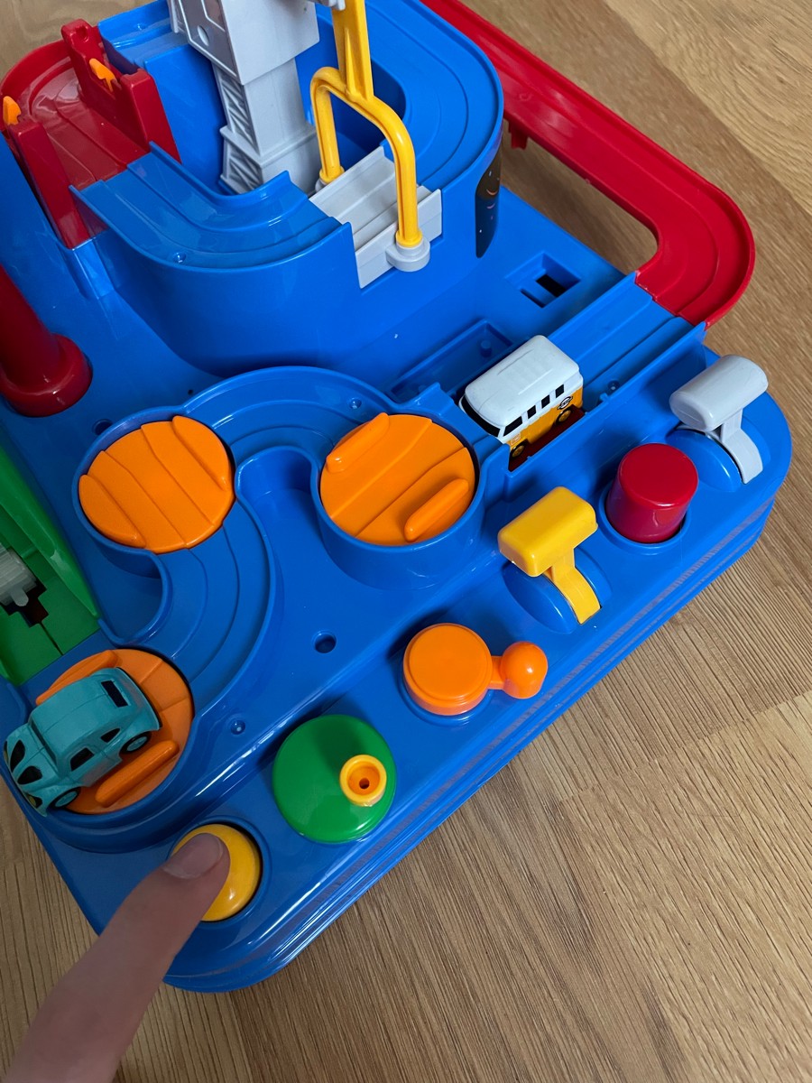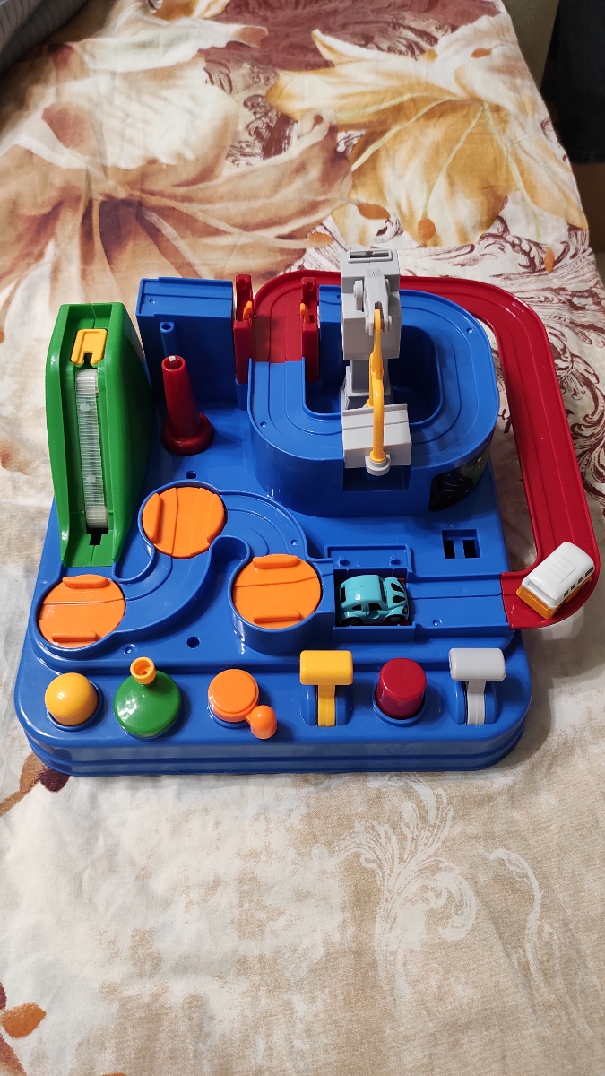 Развивающая интерактивная игра-головоломка со звуками выполнена в виде красочного города, в котором нужно вовремя нажимать рычаги, чтобы машинки преодолевали препятствия на треке. Используя элементы механического управления, малыш без труда справится с пр