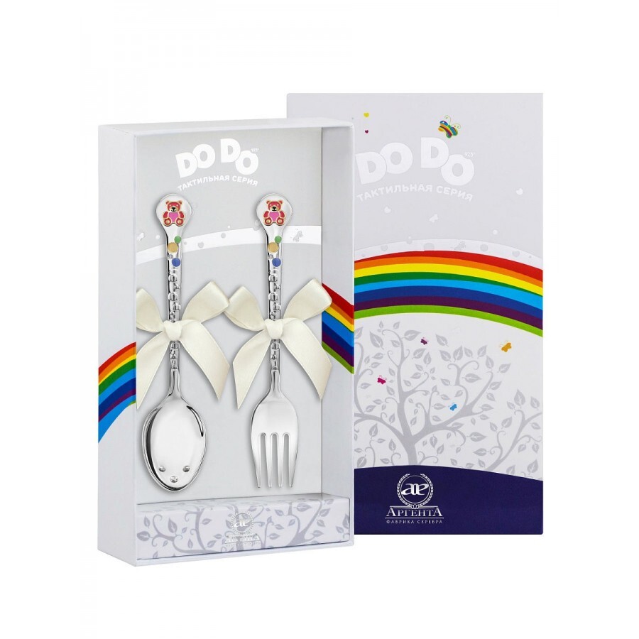 Детский набор ложка и вилка "Мишка" из серебра 925 пробы, с эмалью и позолотой. Популярный дизайн мишки, неоспоримая польза серебра и красивая коробочка с лентами - отличный подарок для ребенка! Серебряные приборы в наборе - идеальный подарок на первый з