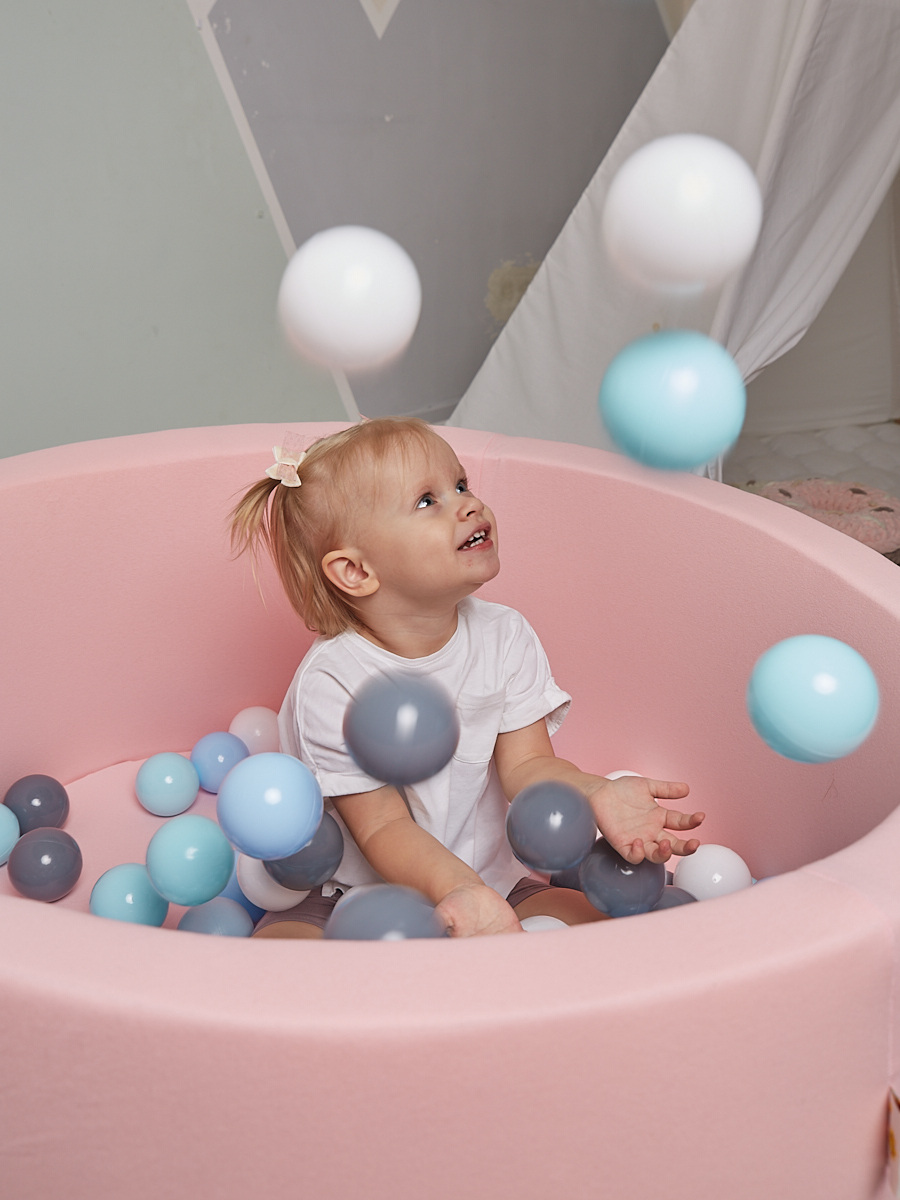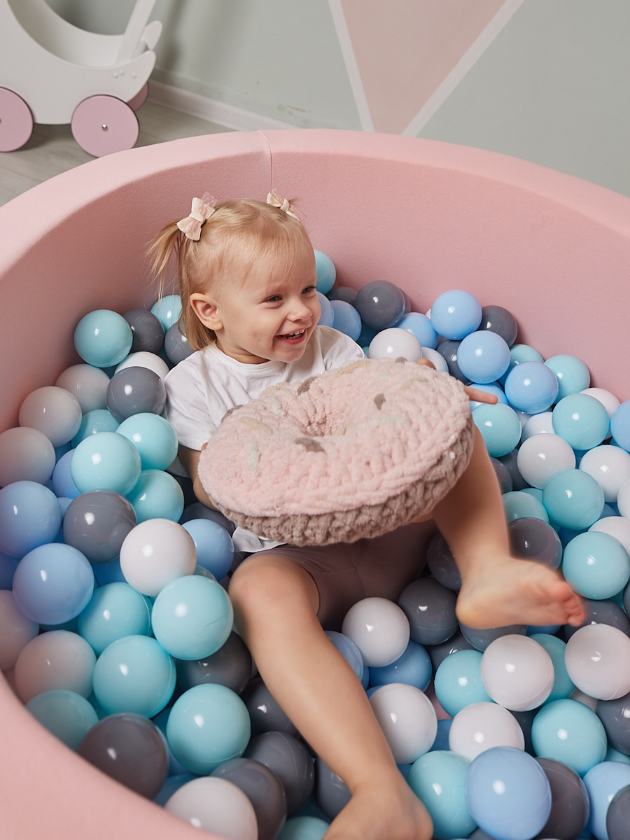 Размер Детского сухого Бассейна, в диаметре 70 см, высота бортика 30 см, толщина стенок 5 см, поролоновое дно 2 см застегивается на молнию, благодаря чему под него не попадают шарики и ребенок может комфортно играть без ссадин и ушибов. Чехол съемный, сши