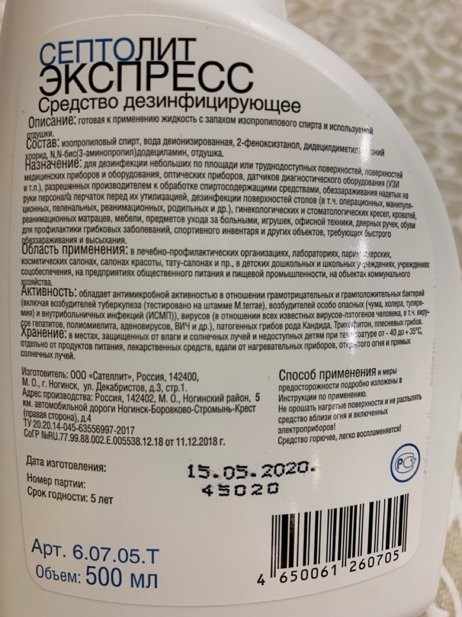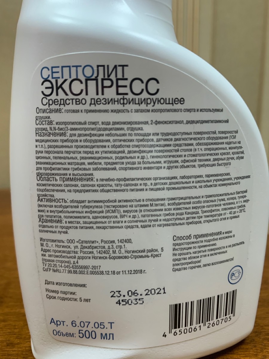 Комплектация:выпускается во флаконах из полимерных материалов емкостью 500млСостав средства:Изопропиловый спирт – 60%, дидецилдиметиламмоний хлорид – 0,2%, N,N-бис(3-аминопропил)додециламин - 0,2%, 2-феноксиэтанол – 0,3%, кроме того в состав средства вход