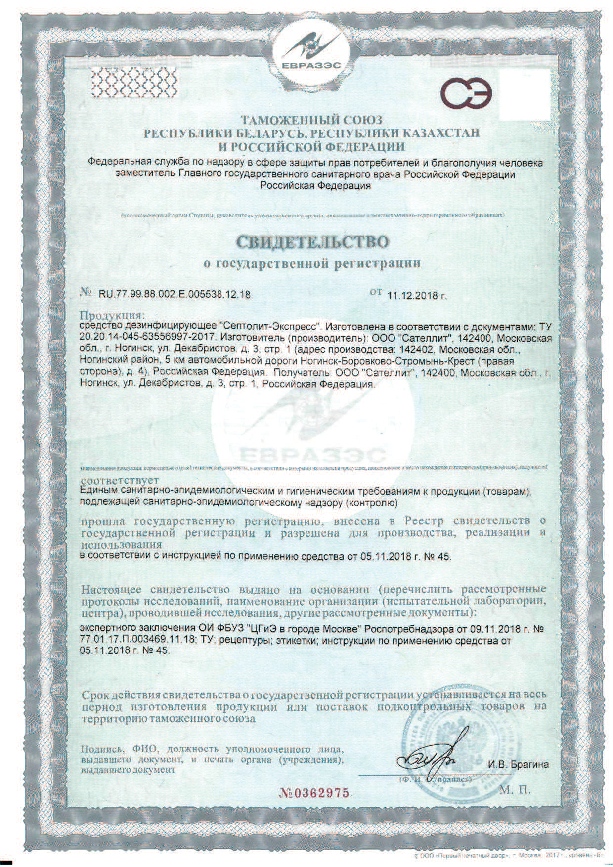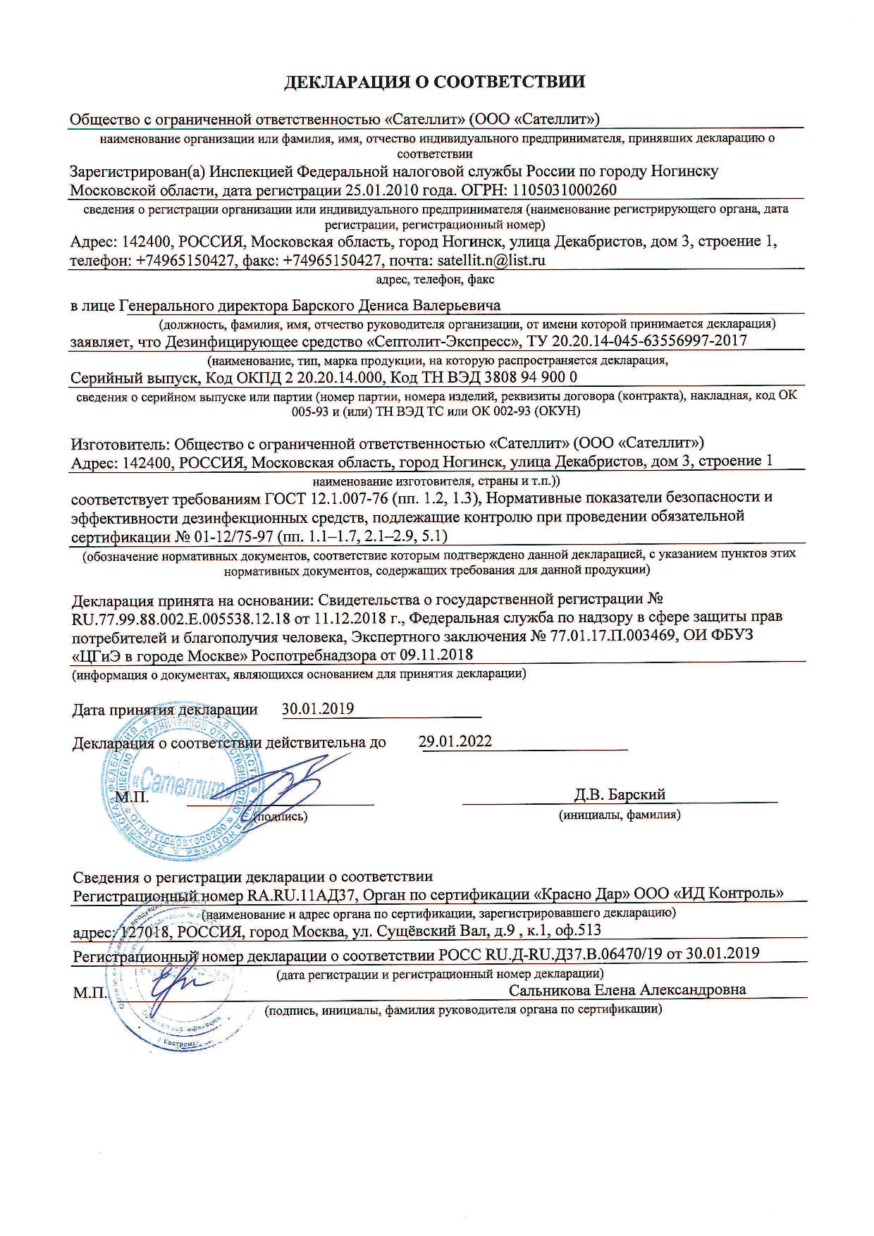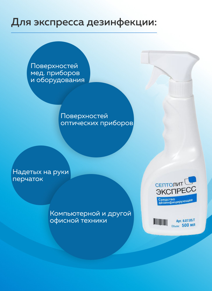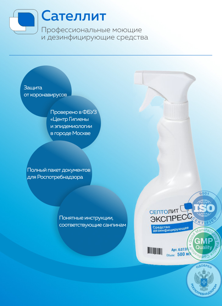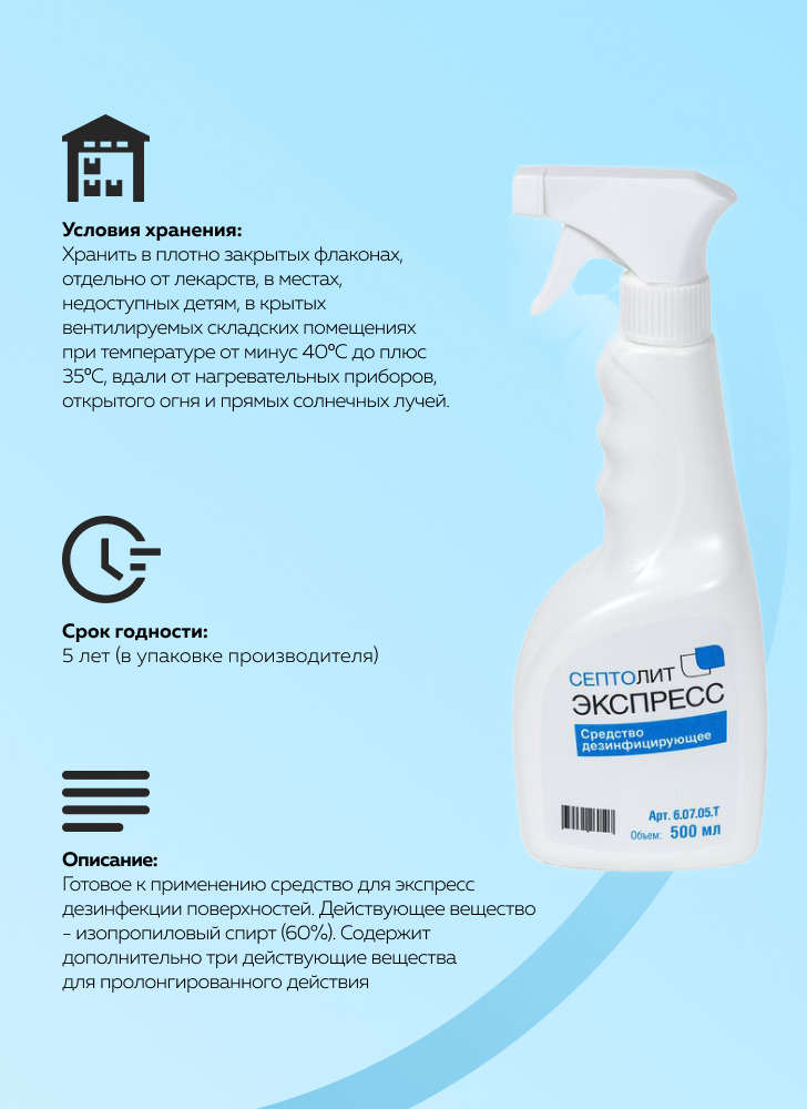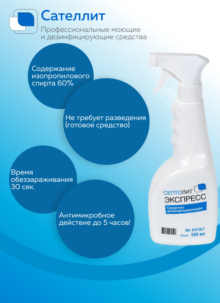 Состав:Изопропиловый спирт – 60%, дидецилдиметиламмоний хлорид – 0,2%, N,N-бис(3-аминопропил)додециламин - 0,2%, 2-феноксиэтанол – 0,3%, кроме того в состав средства входят отдушка и вода.Описание:Готовое средство для экспресс дезинфекции поверхностей. Де