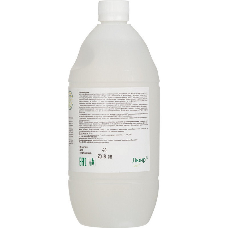 Дезсредство Люир 1,0 лДезинфицирующее средство 'Люир' 1 л (концентрат). Химический состав дезсредства: ЧАС, вспомогательные компоненты. Действующие вещества: алкилдиметилбензиламмоний хлорид (АДБАХ) 5.5 %, вспомогательные компоненты. Сфера применения: аку