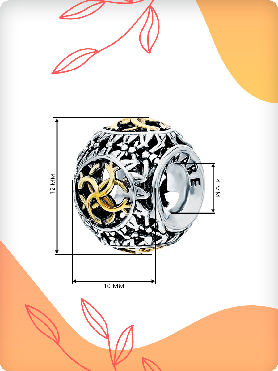 Шарм "Свадебник" выполнен из серебра 925 пробы с золочением. Ширина отверстия для браслета - 4 мм. Подойдет для браслета любого бренда с диаметром меньше 4 мм.- Шарм выполнен в виде ажурной бусины, украшенной старославянским символом.- Золочение нанесено