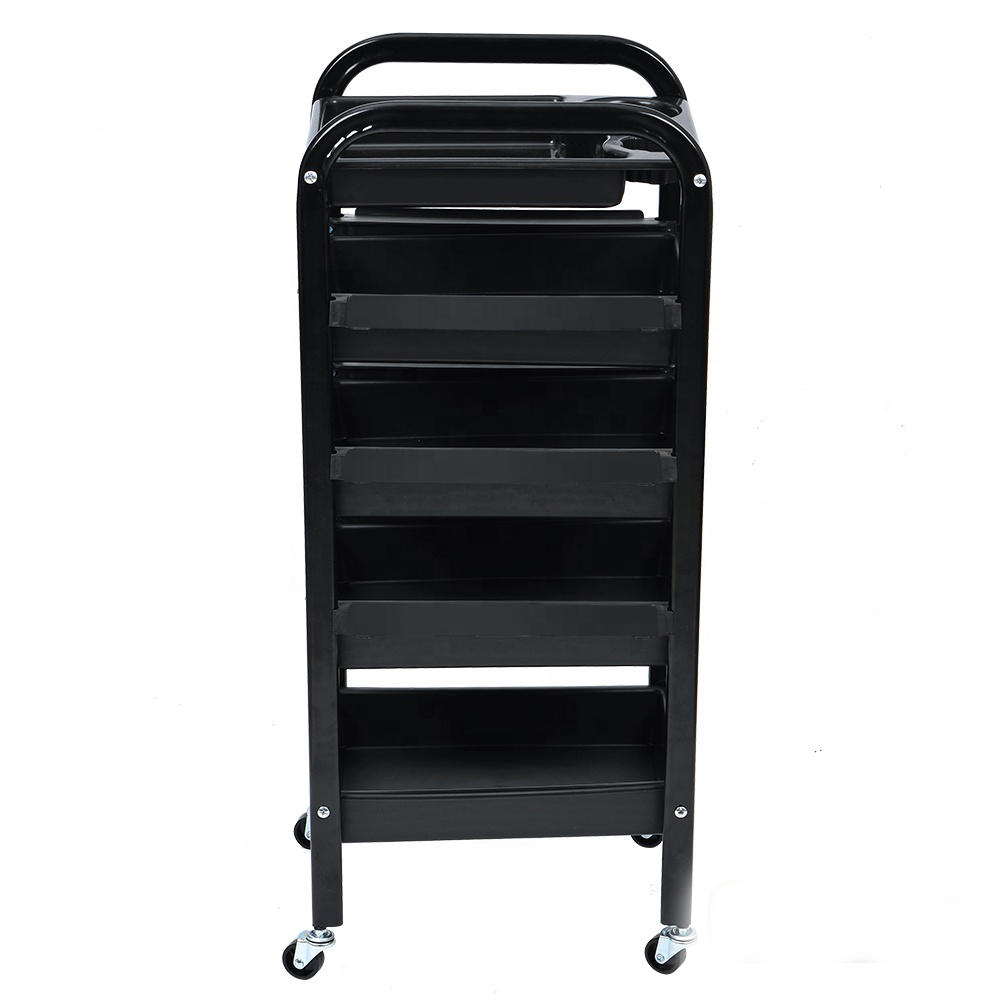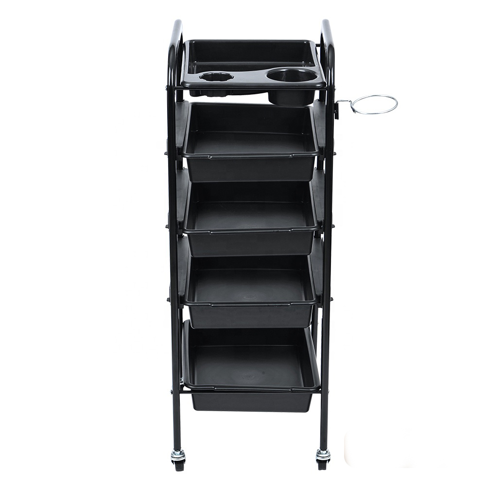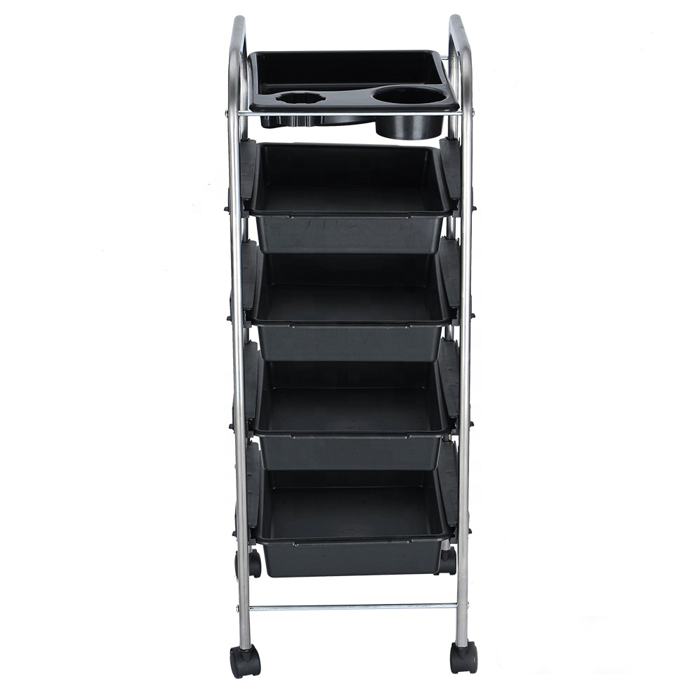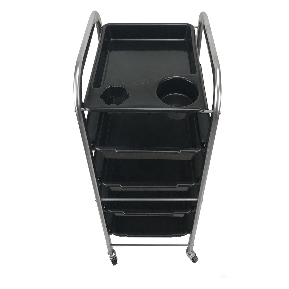 Тележка оборудована выдвижными ящиками. Выполнена из пластика и хромированного металла. Имеются отверстия для фена и хранения прочего парикмахерского инвентаря.Габариты: 880*370*320 мм