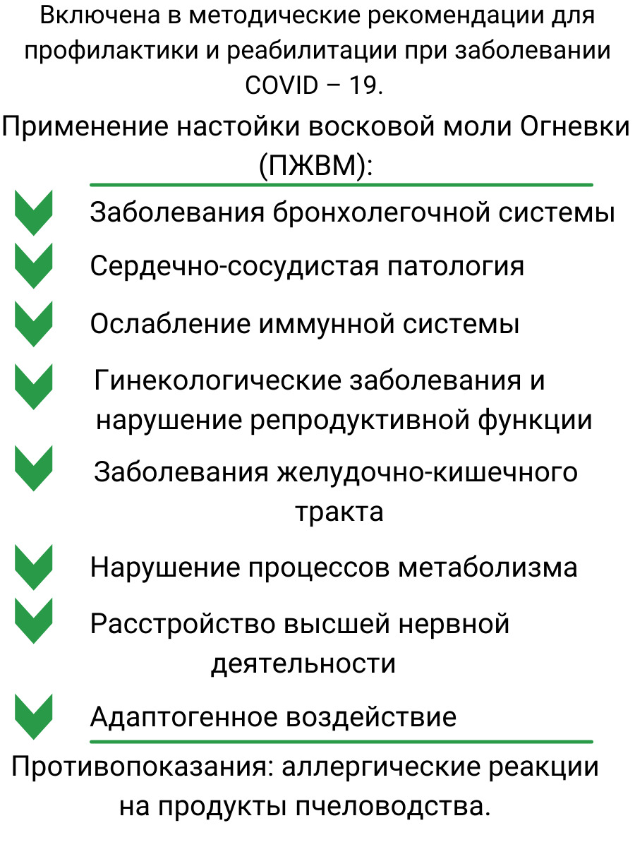 Включена в методические рекомендации для профилактики и реабилитации при заболевании COVID – 19. Так же подтверждено личным опытом среди близких , друзей и знакомых в период пандемии 2020-2021г.Показания к применению спиртовой настойки личинок восковой мо