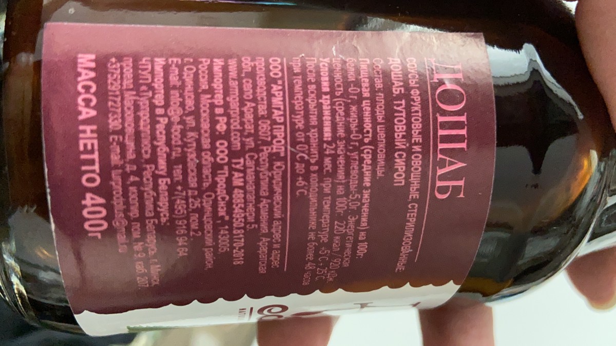 Условия хранения:хранить при температуре от 5 до 25С при относительной влажности не более 75%Состав:Плоды шелковицыОписание:Армянский сироп, славящийся своими лечебными свойствами. Всего одна ложка этого соуса разнообразит ваши привычные десерты.