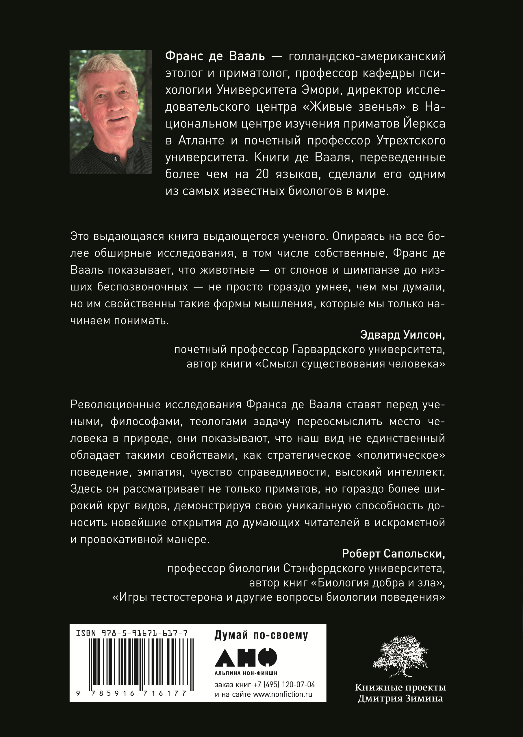 Комментарий:2-е издание.Описание:В течение большей части прошедшего столетия наука была чрезмерно осторожна и скептична в отношении интеллекта животных. Исследователи поведения животных либо не задумывались об их интеллекте, либо отвергали само это поняти