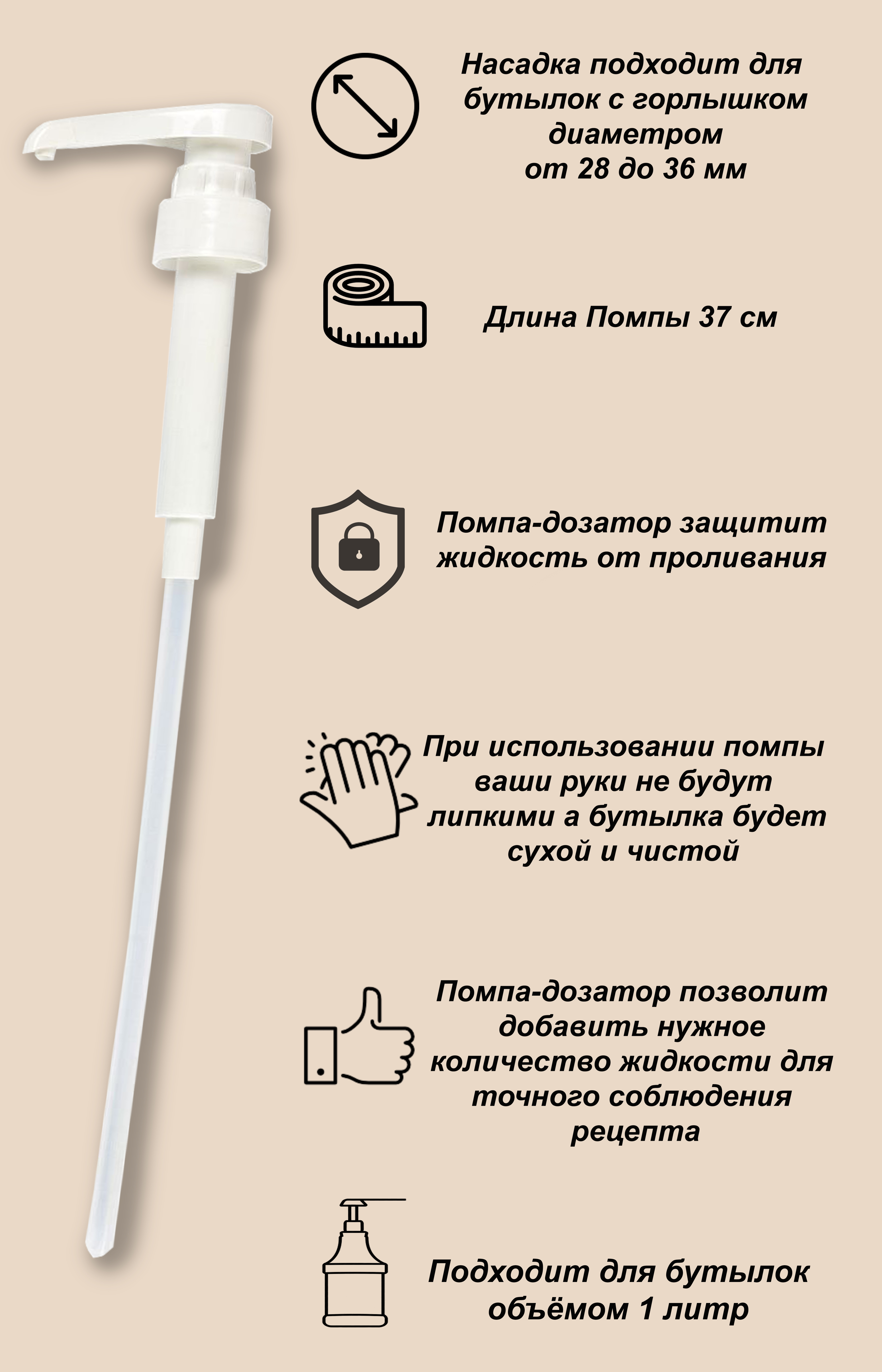 Помпа дозатор, это прекрасный помощник который позволит Вам сохранить вашу кухню в чистоте и сэкономить ваши деньги.Данный гаджет, решит проблему "липкой бутылки". То есть использование дозатора обеспечить чистоту той ёмкости для которой он будет использо