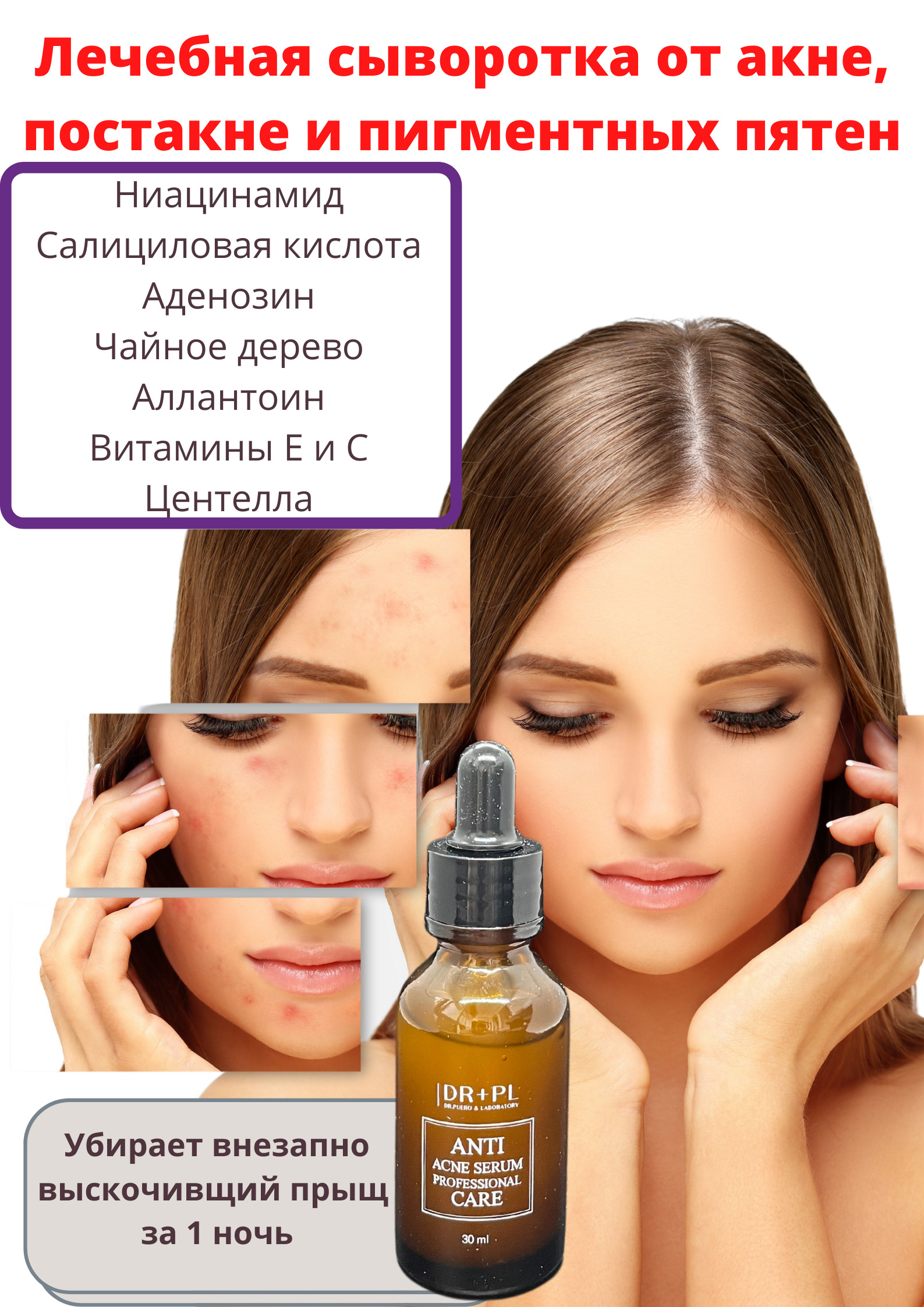 Состав средства:Ниацинамид, масло чайного дерева, аденозин, аллантоин, салициловая кислота, витамин А, витамин СОписание:Stop Acne serum Сыворотка очищающая для проблемной кожи Dr.Puerlab заботится об устранении угревой сыпи, акне, постакне, пигментных пя