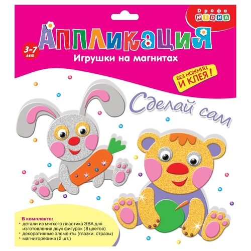 Подробная комплектация2 основы из ЭВА, вырубленные по форме животного, детали из ЭВА двух фактур (матовые, голографические) на самоклеящейся основе (6 цветов), декоративные элементы на самоклеящейся основе (стразы, глазки), цветная листовка-образец