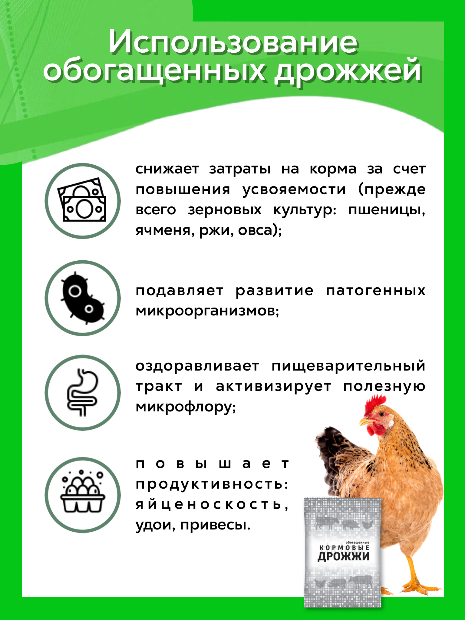 Использование обогащенных дрожжей: снижает затраты на корма за счет повышения усвояемости (прежде всго зерновых культур: пшеницы, ячменя, ржи, овса); подавляет развитие патогенных микроорганизмов; оздаравливает пищеварительный тракт и активизирует полезну