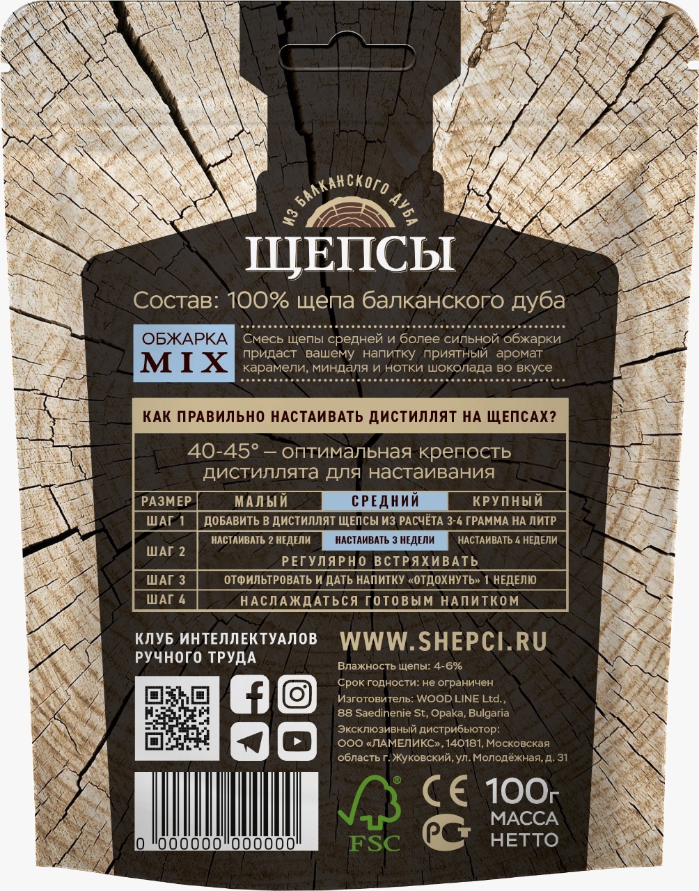 Комплектация:Дубовая ЩепаОписание:Щепсы" - это дубовая щепа для облагораживания крафтовых напитков! Смесь дубовой щепы средней и более сильной обжарки Mix придаст Вашему напитку приятный аромат карамели, миндаля и нотки шоколада во вкусе.Продукт полностью