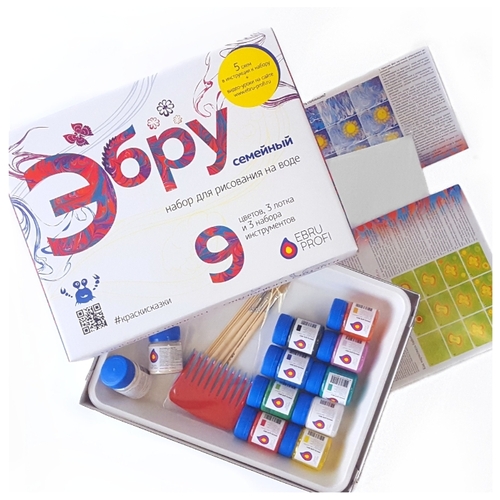 Подробная комплектация- 3 лотка для воды размера А4; - бумагу для рисунков(30 листов) и очистки воды (45 листов); - 9 баночек по 30 мл с эбру-краской (красная, оранжевая, желтая, синяя, изумрудная, зеленая, фиолетовая или сливовая, белая, черная); - загуститель на 15 л воды (