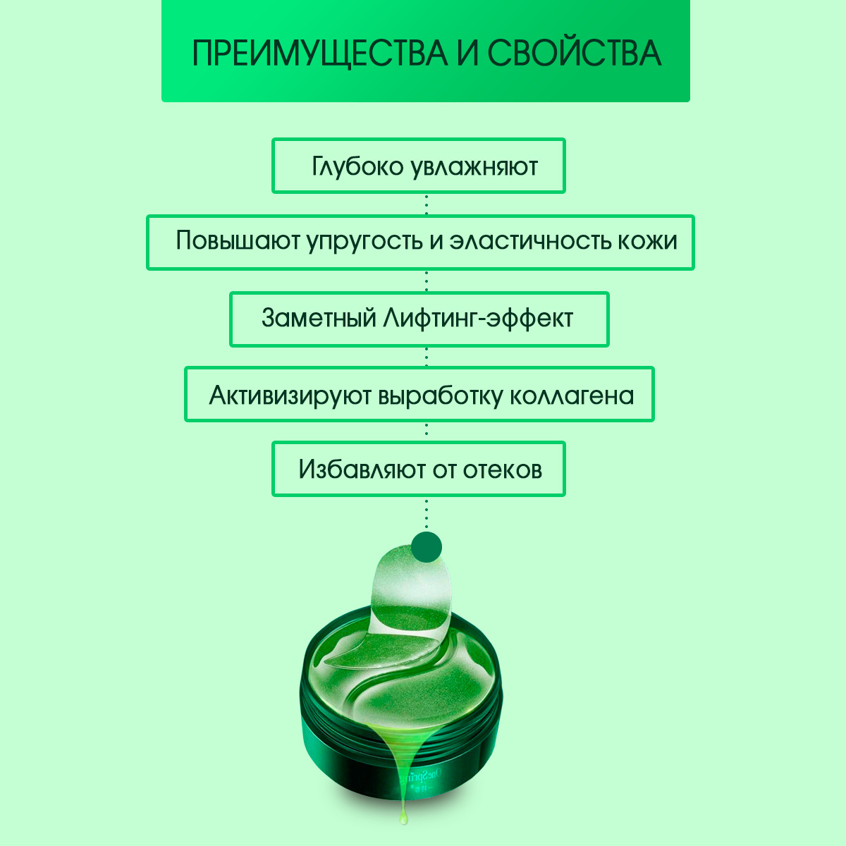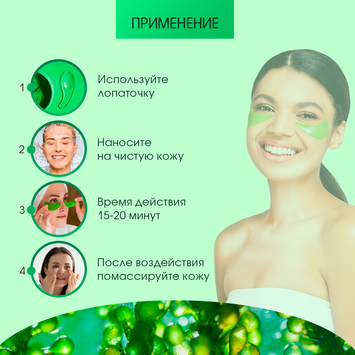 Способ примененияПатчи легко использовать: для этого нужно аккуратно положить их на очищенную от макияжа кожу под нижним веком, расположив более широкую часть у внешнего уголка глаза. После этого патчи оставляют на 15-20 минут, затем снимают. Бояться, что патчи отклеятся