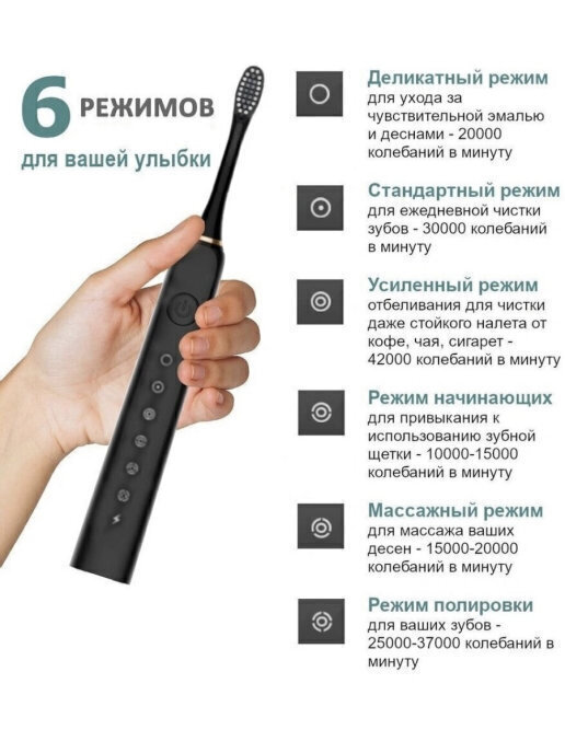 Режимы работыПульсирующий режим, Массаж, Деликатная чистка, Отбеливание, DIY-пользовательский режим