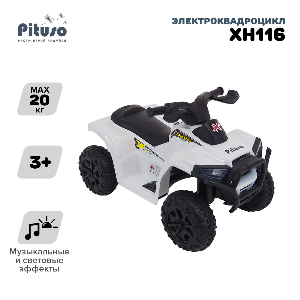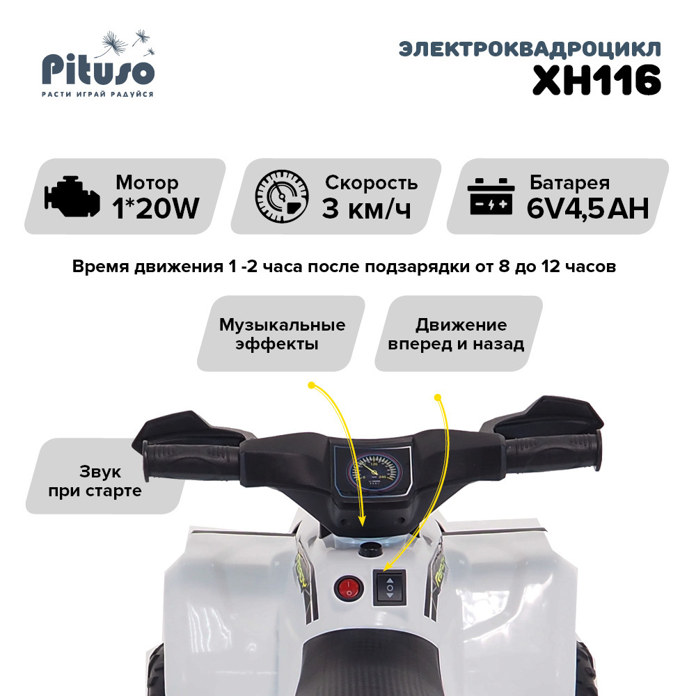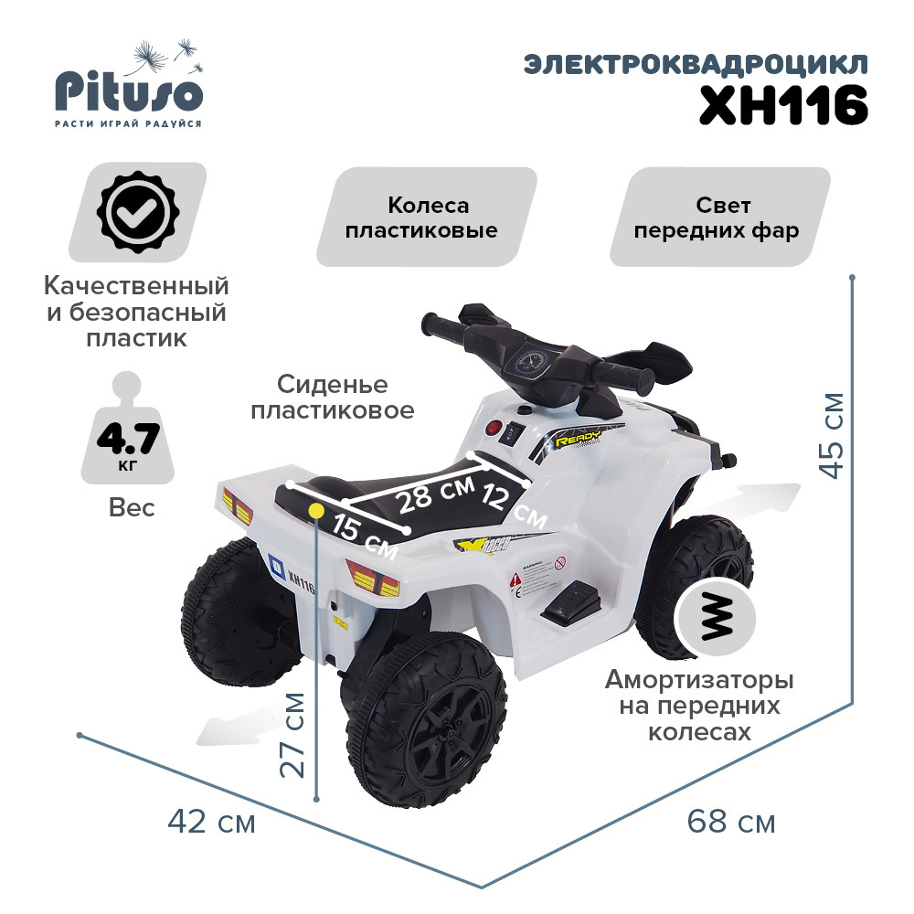 Движение вперед и назадСвет передних фарЗвук при старте4 разных мелодииЗащита от перегрузкиАмортизаторы на передних колесахКолеса пластиковыеАккумулятор — 6V4,5AH*1Мотор — 20W*1Скорость - 3 км/часВозраст — 3-7 летМаксимальная нагрузка — 30 кг