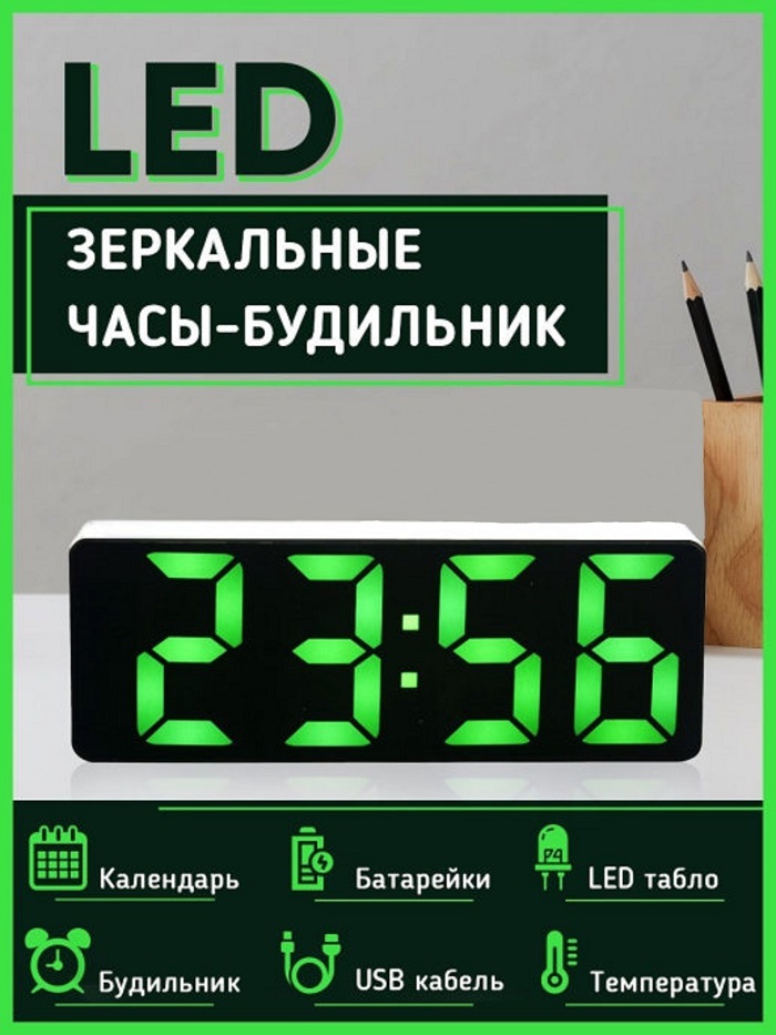 Электронные часы будильник с большими LCD дисплеем, с большими зелеными цифрами, которые прекрасно видно как в темноте, так и при солнечном свете. С цифрами такого размера время будет видно как пожилым людям, так и людям с плохим зрением.Присутствует инди