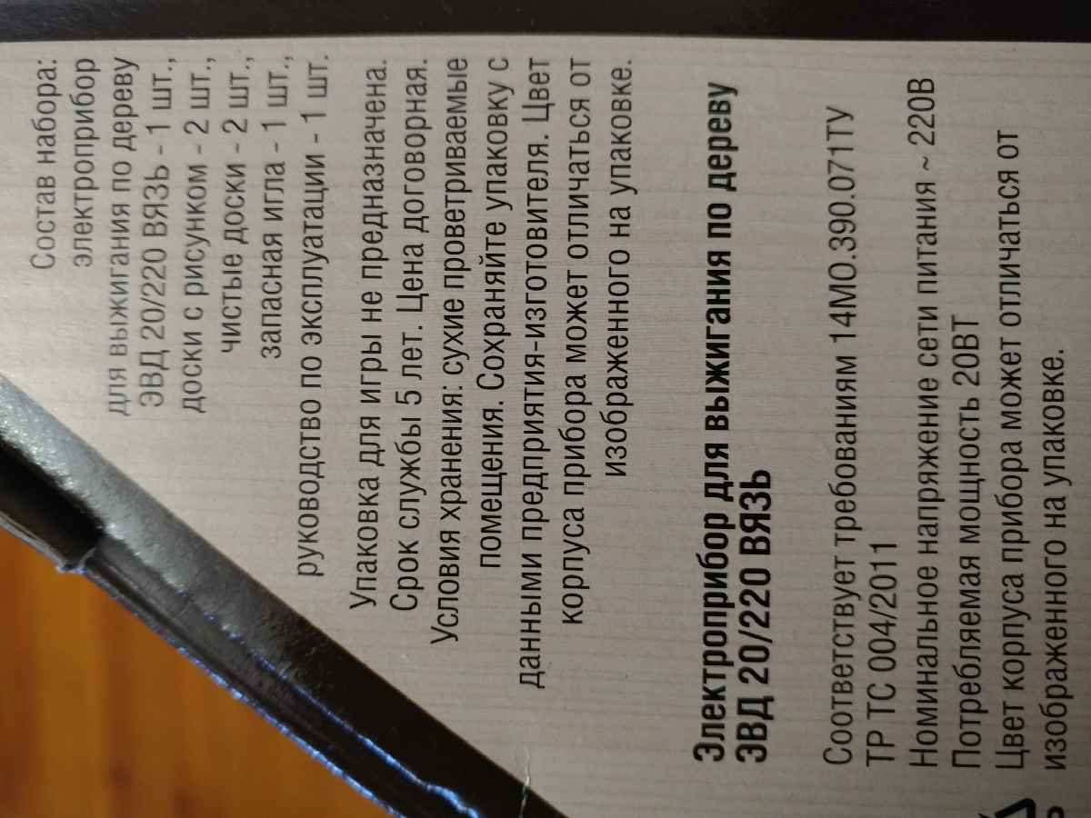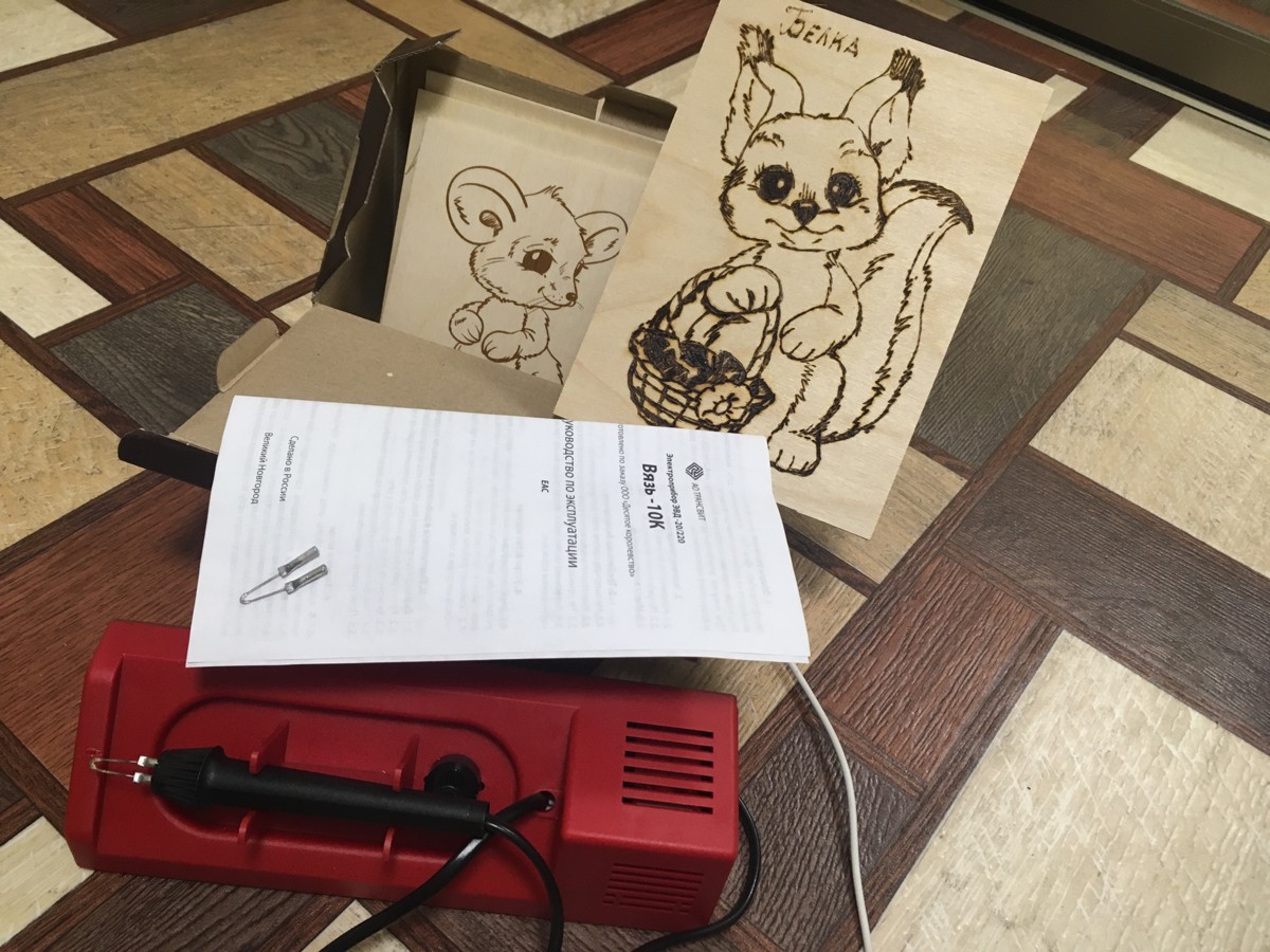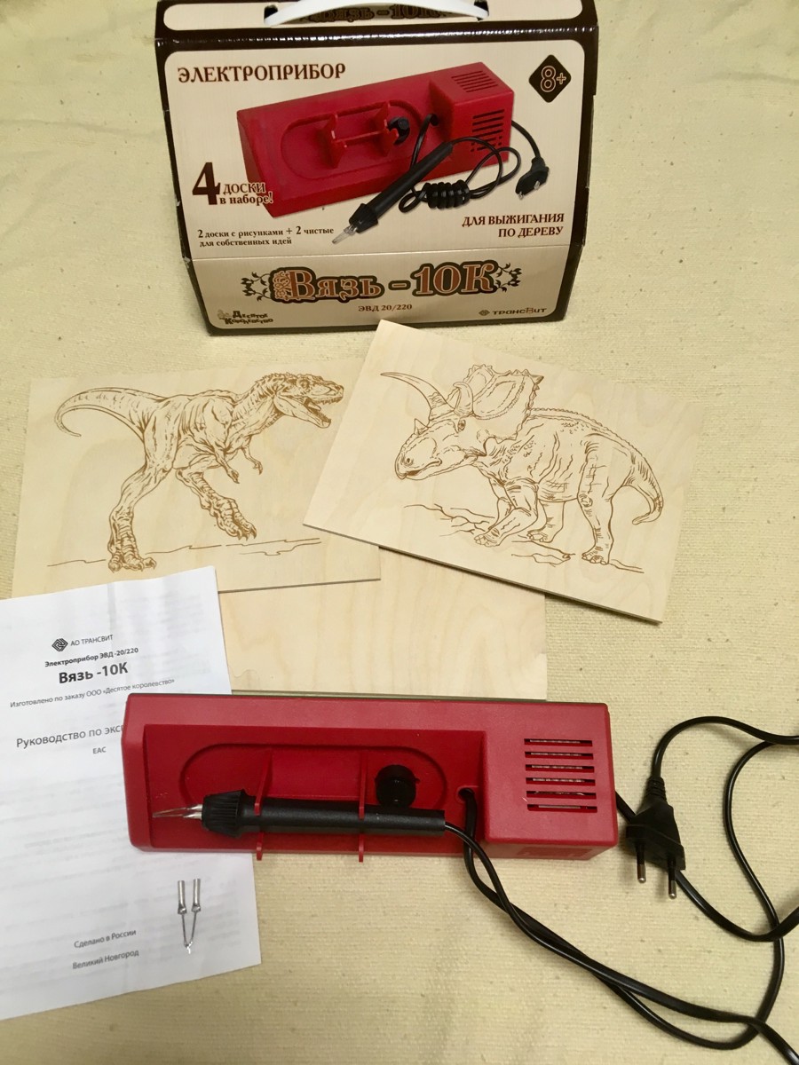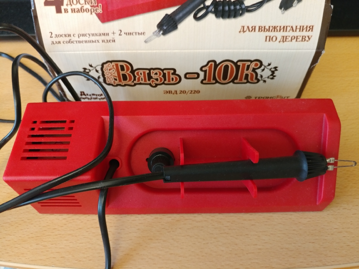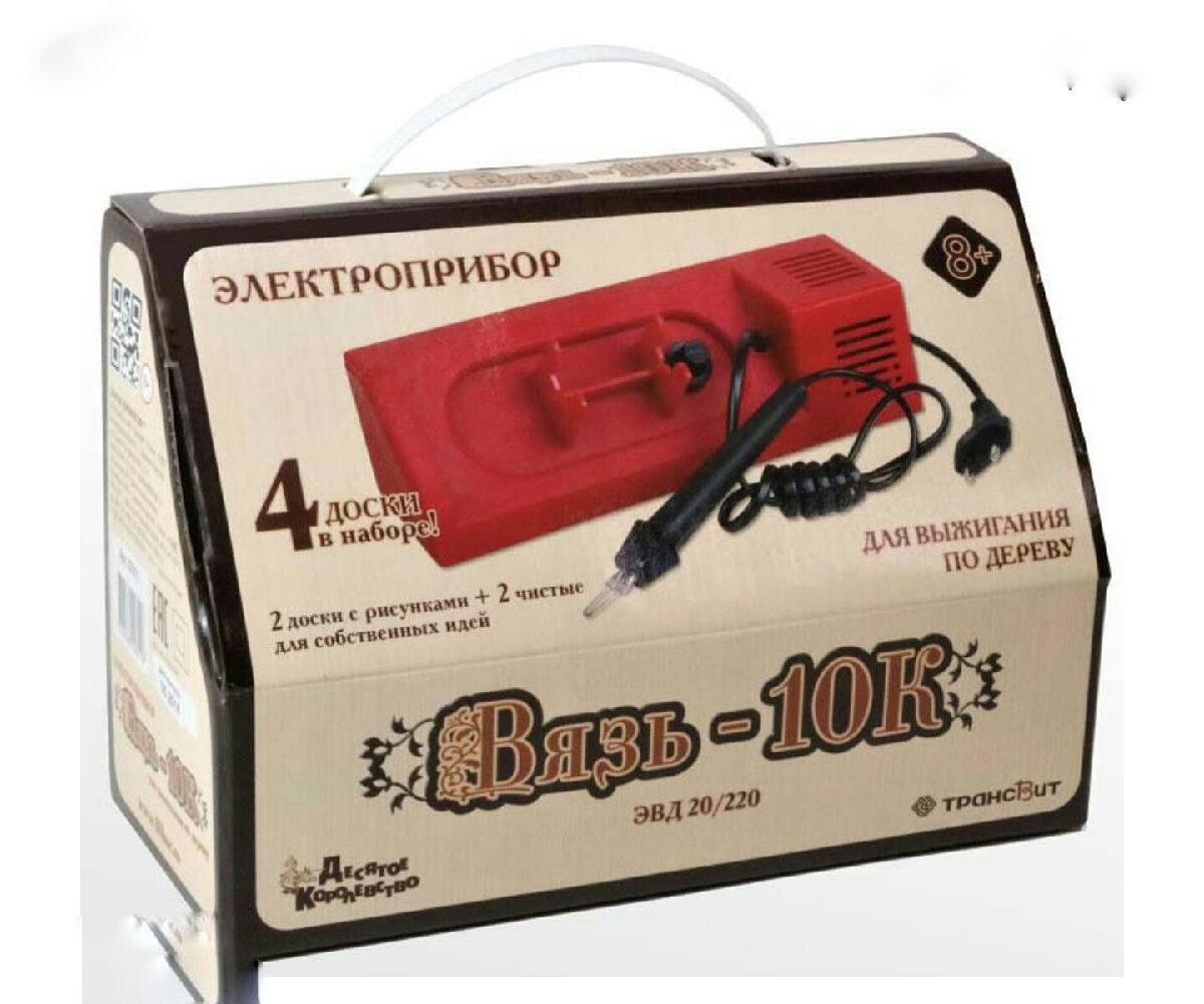 Представляем Вашему вниманию набор для выжигания по дереву "Вязь-10К", с плавной регулировкой режима нагрева и 4 досками, размером 210х150 мм. Комплектация: - электроприбор для выжигания по дереву ЭВД20/220 Вязь – 1 шт; - доски с рисунком – 2 шт;