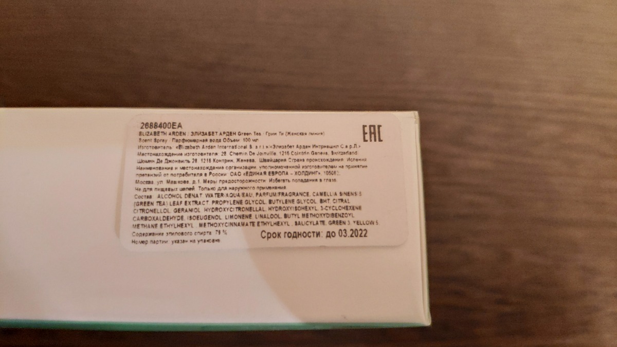 Состав:Alcohol Denat., Water/Aqua/Eau, Parfum/Fragrance, BHT, Butyl Methoxydibenzoyl Methane, Butylene Glycol, Caffeine, Camellia Sinensis (Green Tea) Leaf Powder, Ethylhexyl Methoxycinnamate, Ethylhexyl Salicylate, Propylene Glycol, Citral, Citronellol,