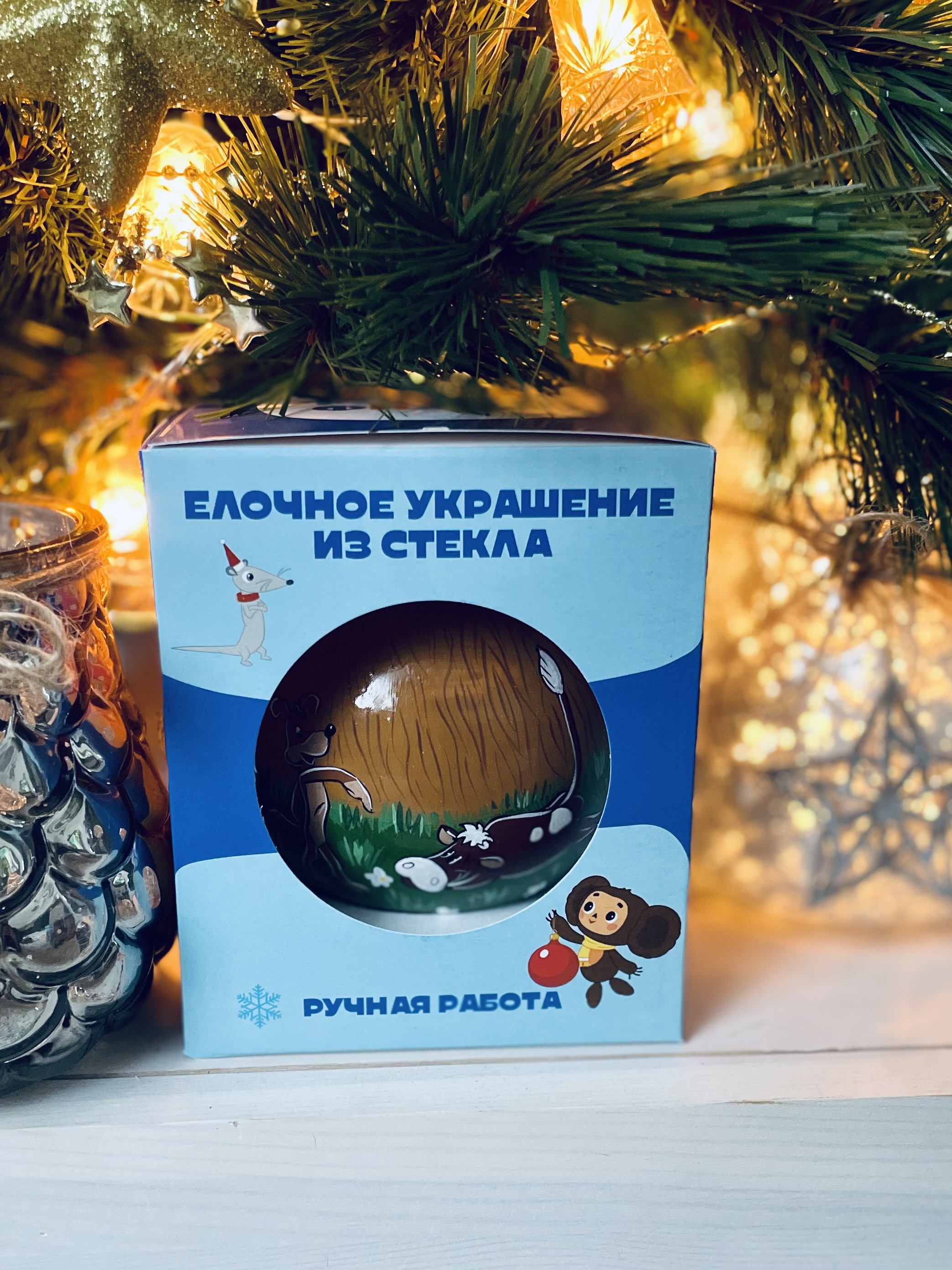 Шар стеклянный ёлочный из серии "Герои студии Союзмультфильм" Диаметр шара 10 см. Ограниченная серия оригинальных ёлочных шаров с изображением всеми любимых героев советских мультфильмов. Расписано вручную нашими лучшими художниками по лицензии студии «Со