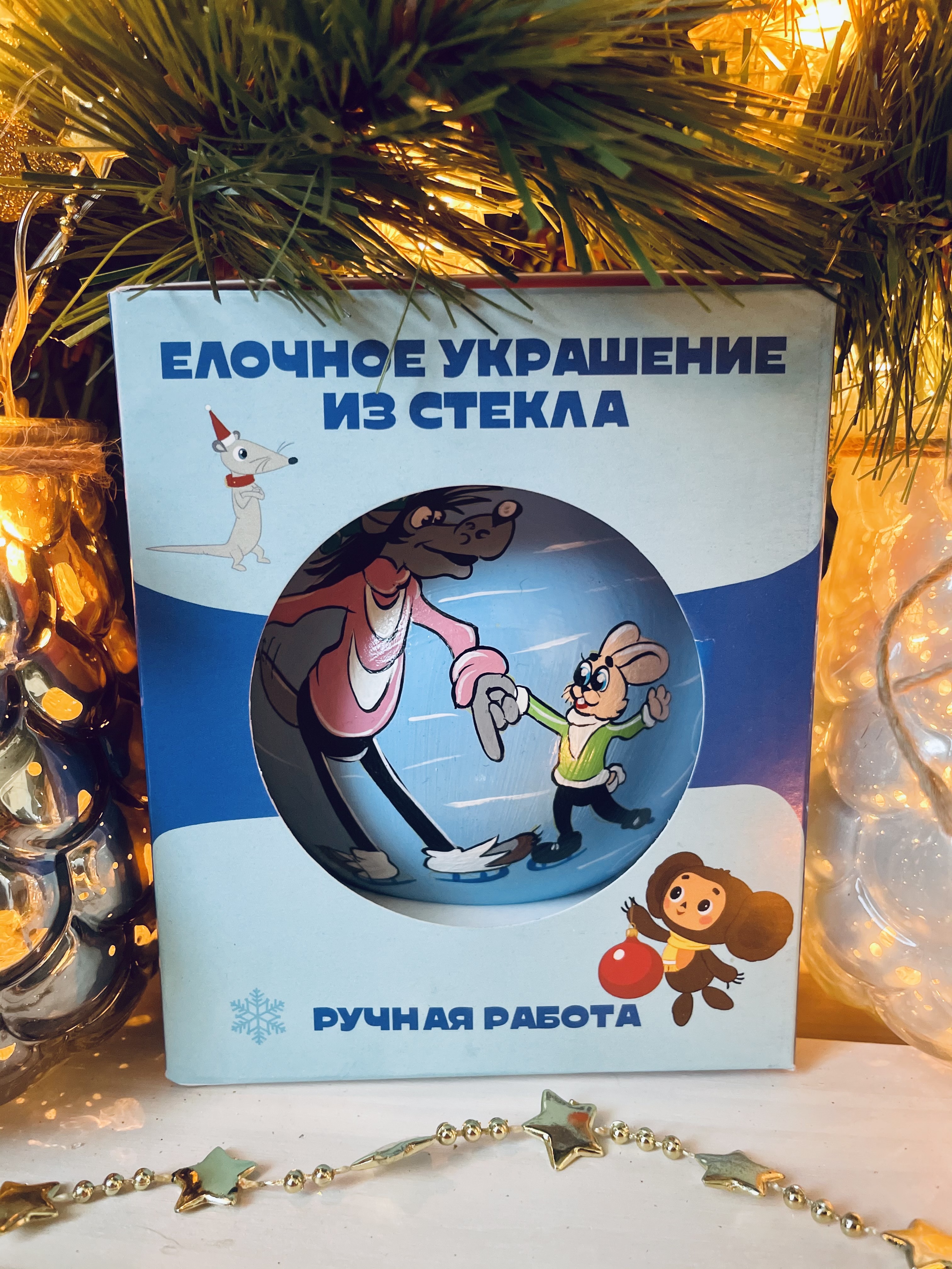 Комплектация:Шар, упаковка.Описание:Шар стеклянный ёлочный из серии "Герои студии Союзмультфильм" Диаметр шара 10 см. Ограниченная серия оригинальных ёлочных шаров с изображением всеми любимых героев советских мультфильмов. Расписано вручную нашими лучшим