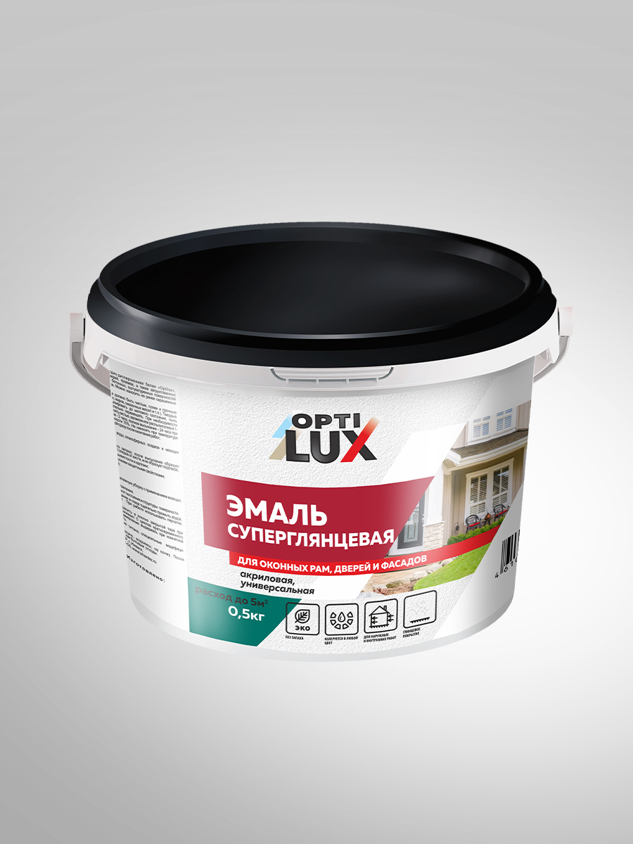 Эмаль акриловая «OPTILUX» универсальная СУПЕРГЛЯНЦЕВАЯПредназначена для деревянных оконных рам, дверей, проемов, а также загрунтованных металлических поверхностей, кирпичных, бетонных, оштукатуренных поверхностей снаружи и внутри помещений, кроме полов. М