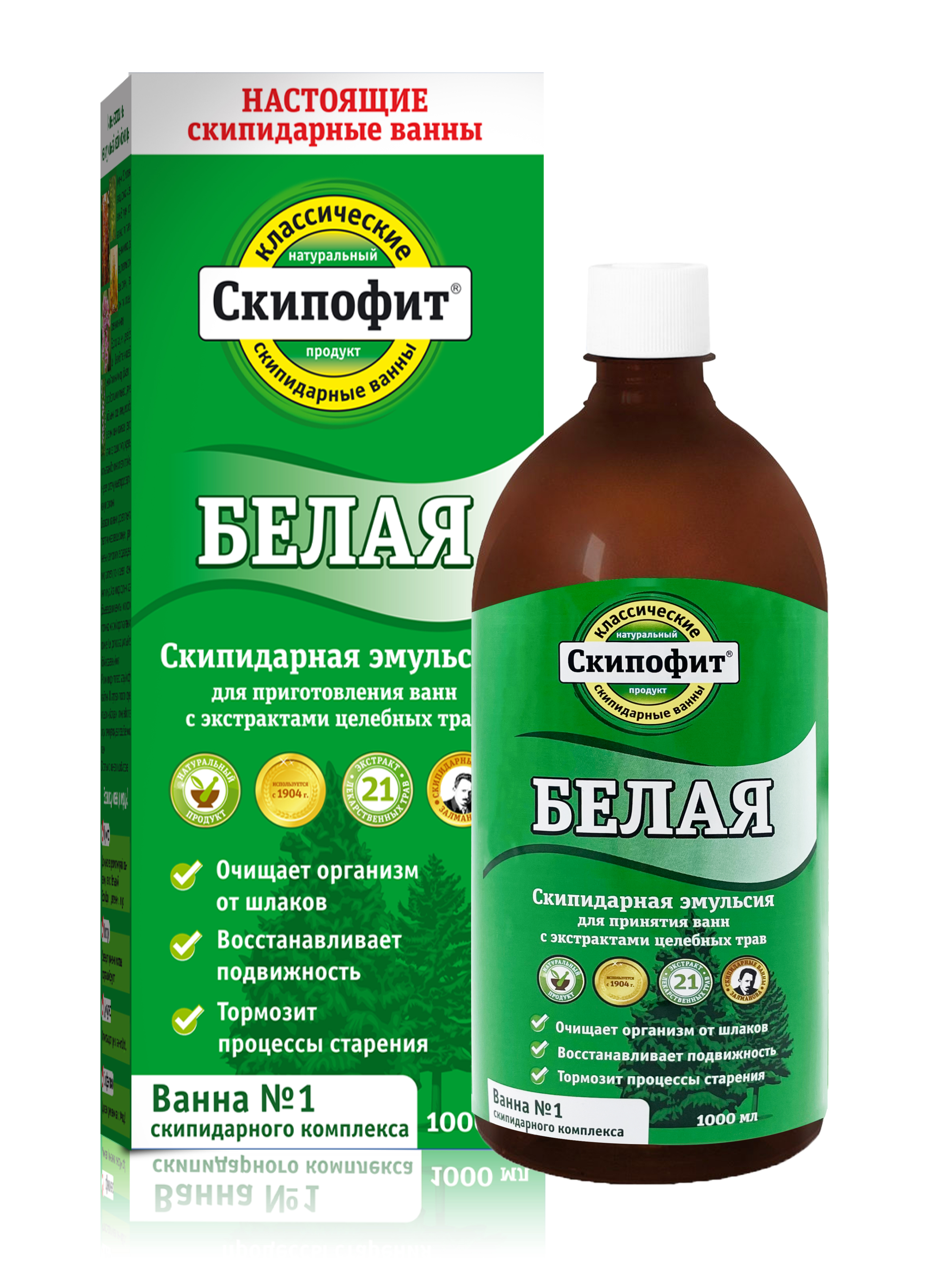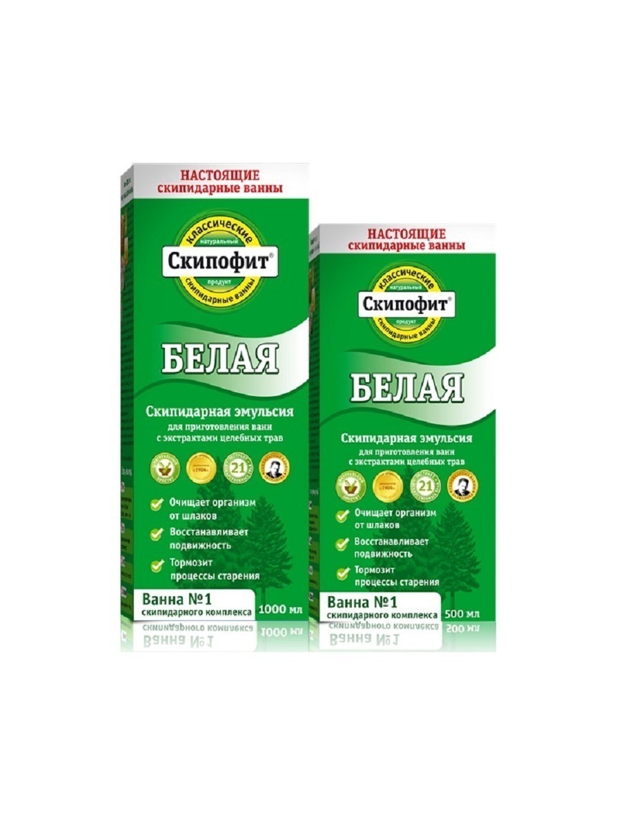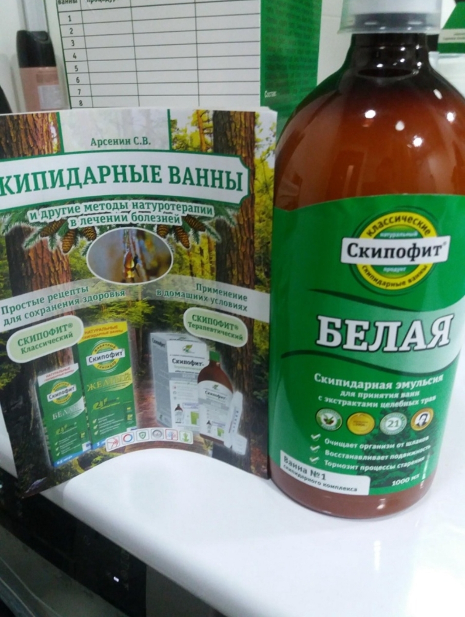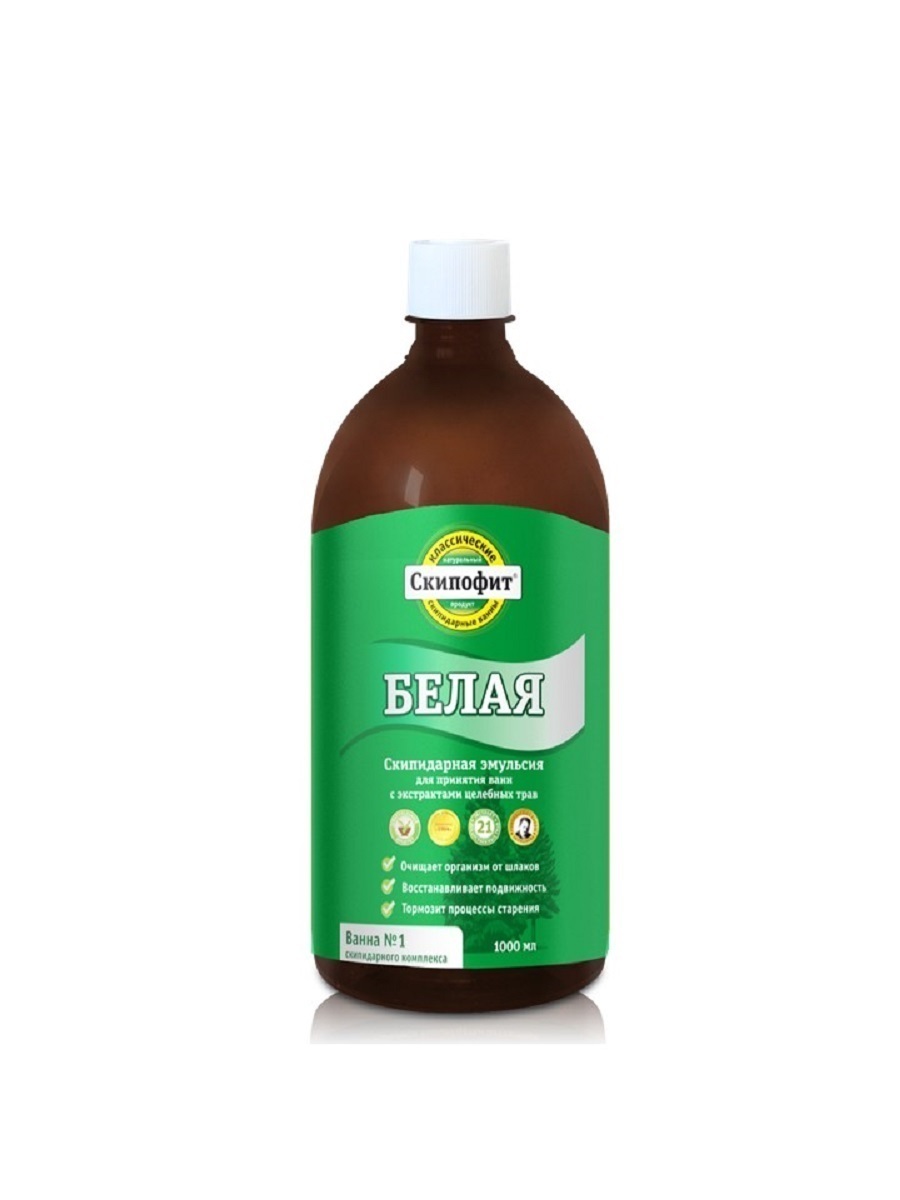 Белая скипидарная эмульсия оказывает спазмолитическое, противовоспалительное, обезболивающее и согревающее действие, стимулирует местное кровообращение. Ванны со «Скипофитом белым» вызывают пульсацию капилляров, которая приводит к повышению артериального