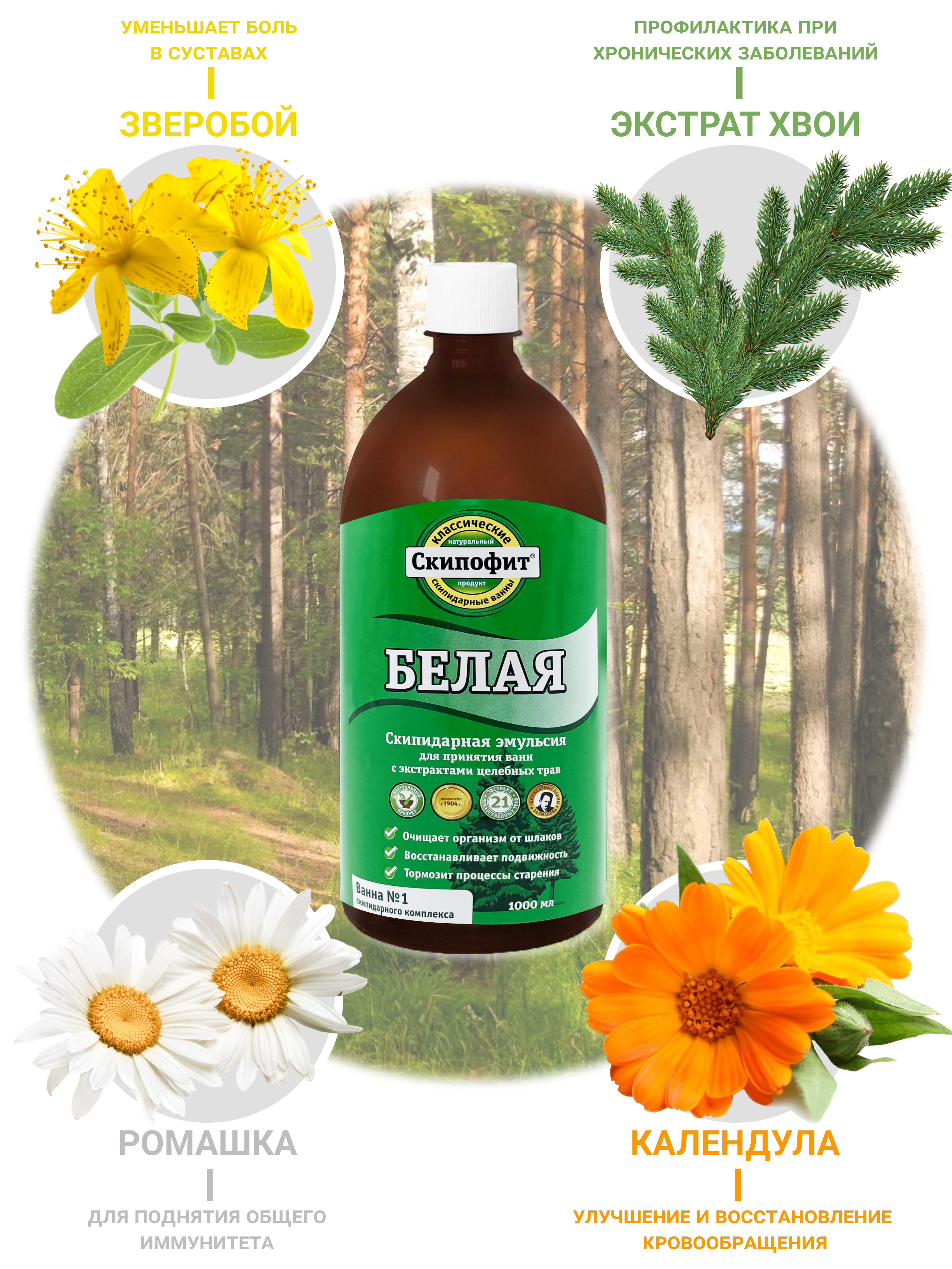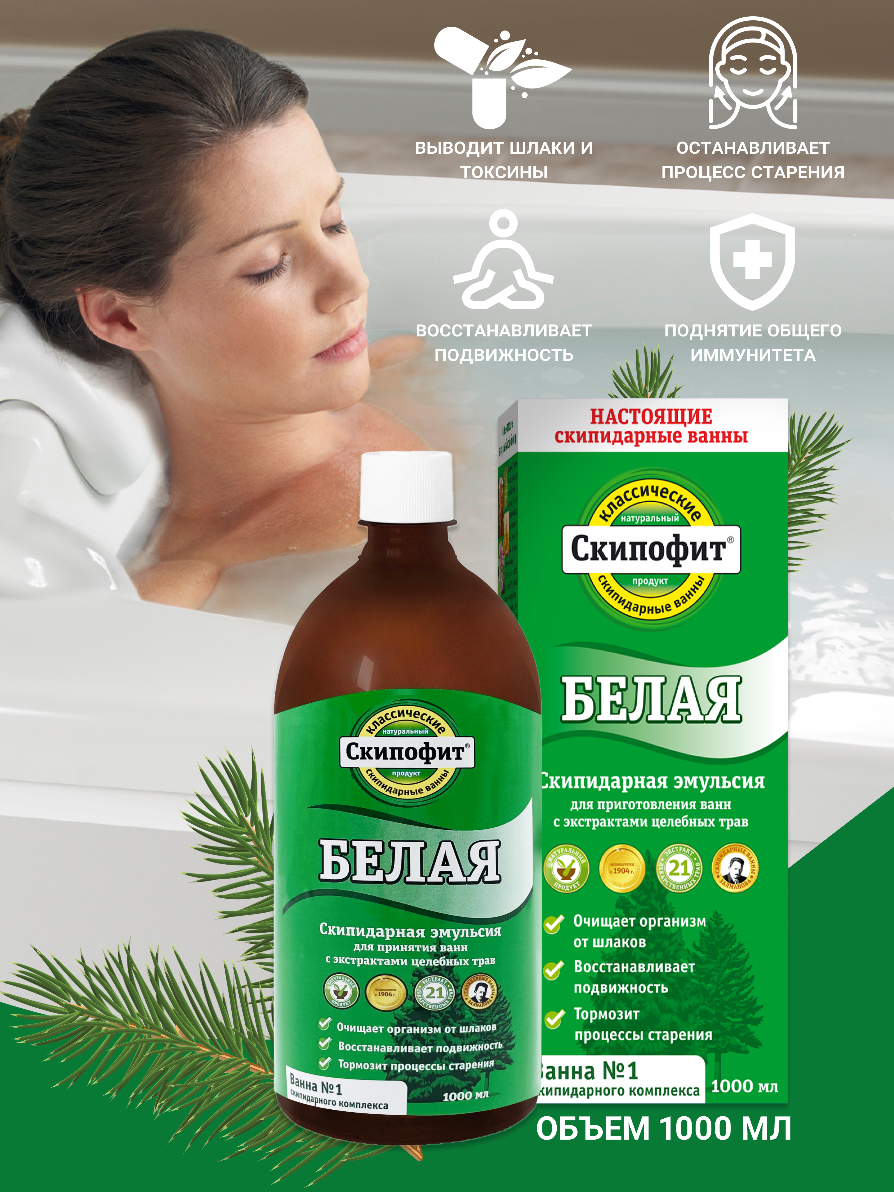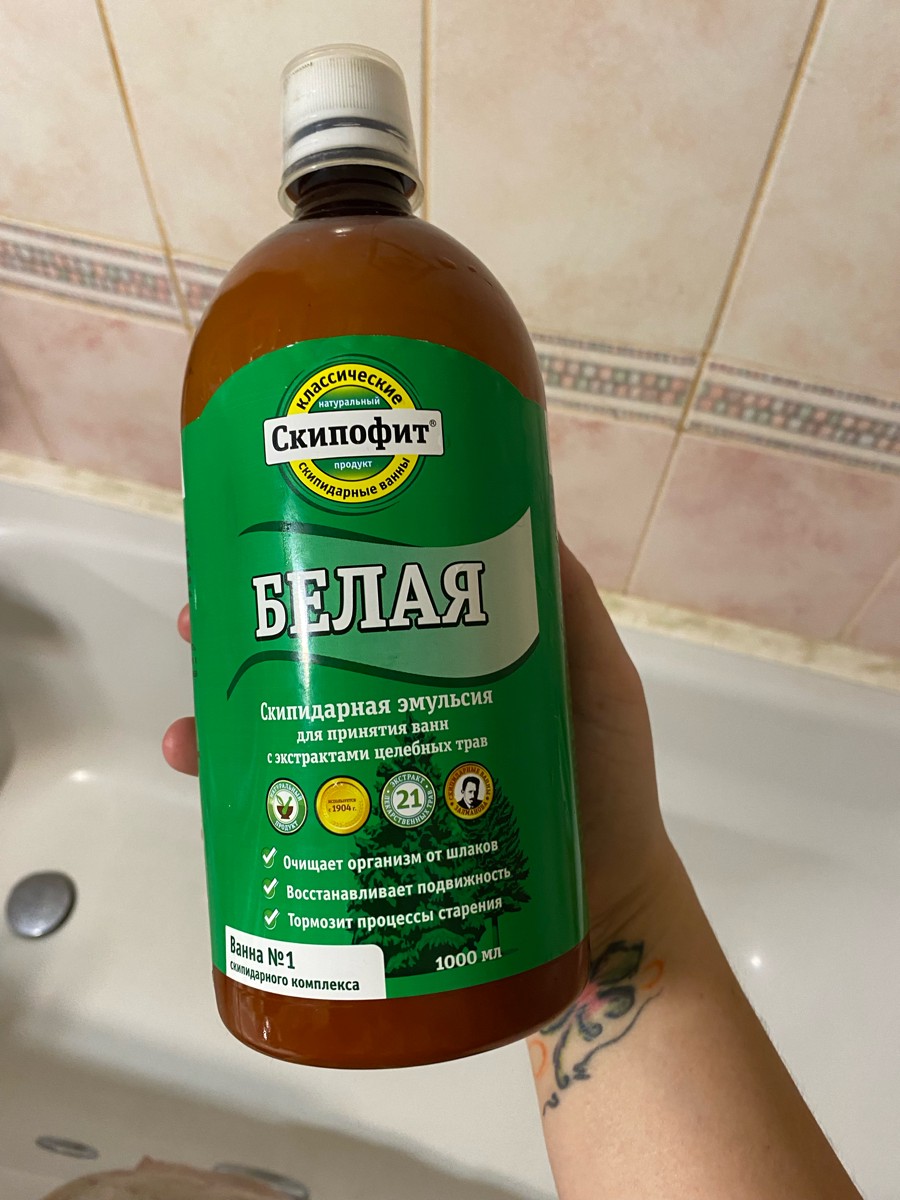 Белая скипидарная эмульсия оказывает спазмолитическое, противовоспалительное, обезболивающее и согревающее действие, стимулирует местное кровообращение. Ванны со «Скипофитом белым» вызывают пульсацию капилляров, которая приводит к повышению артериального