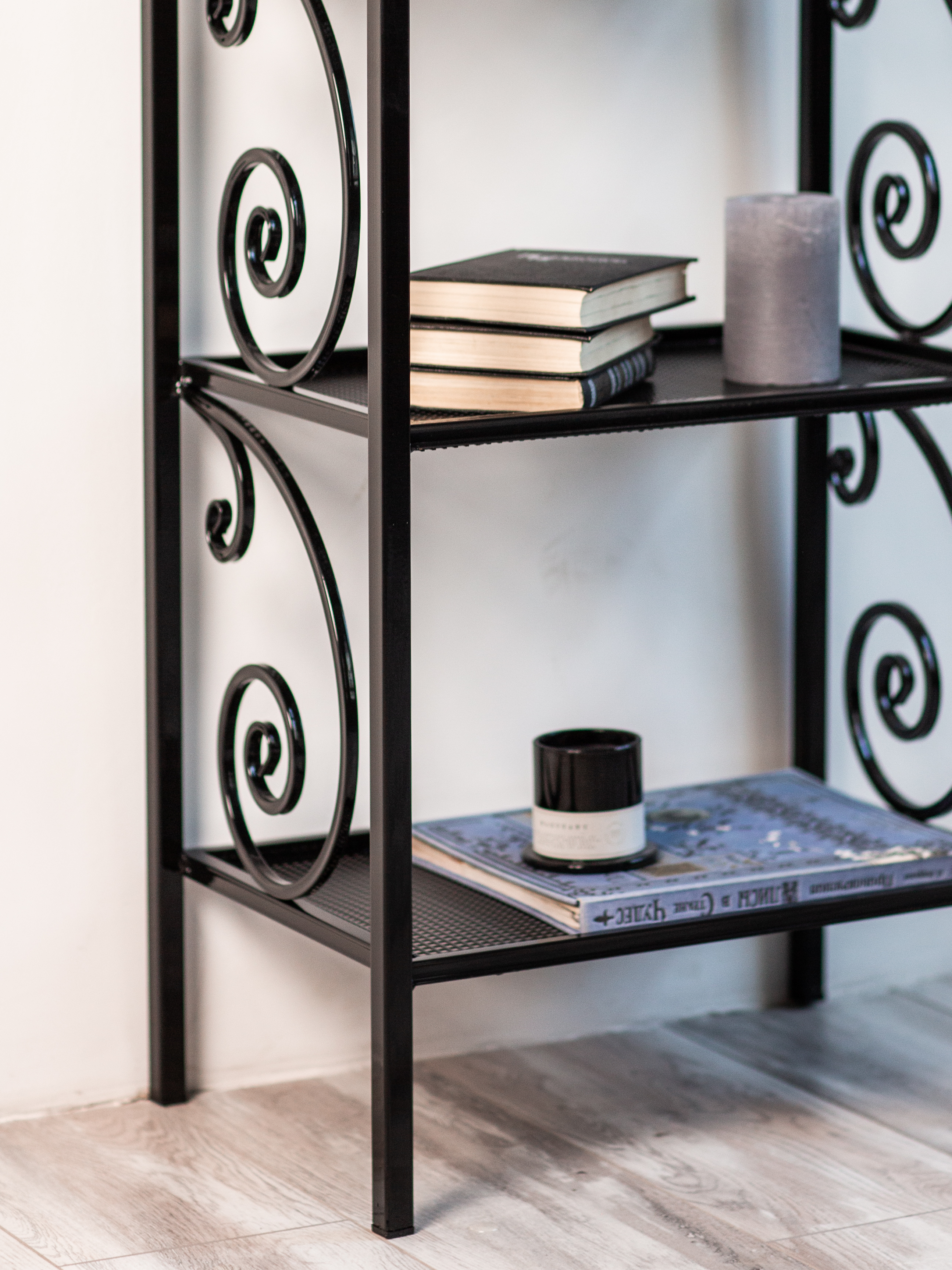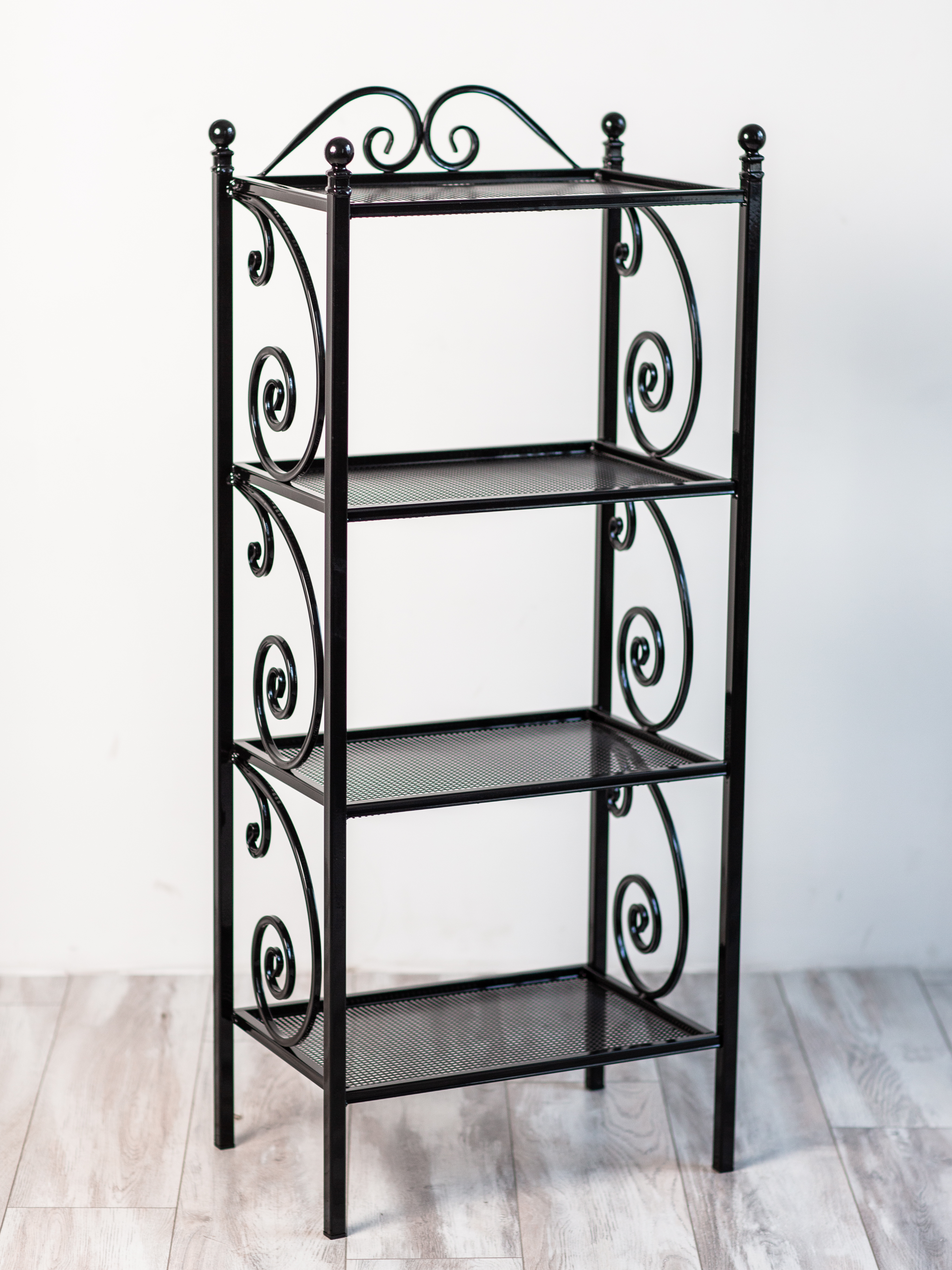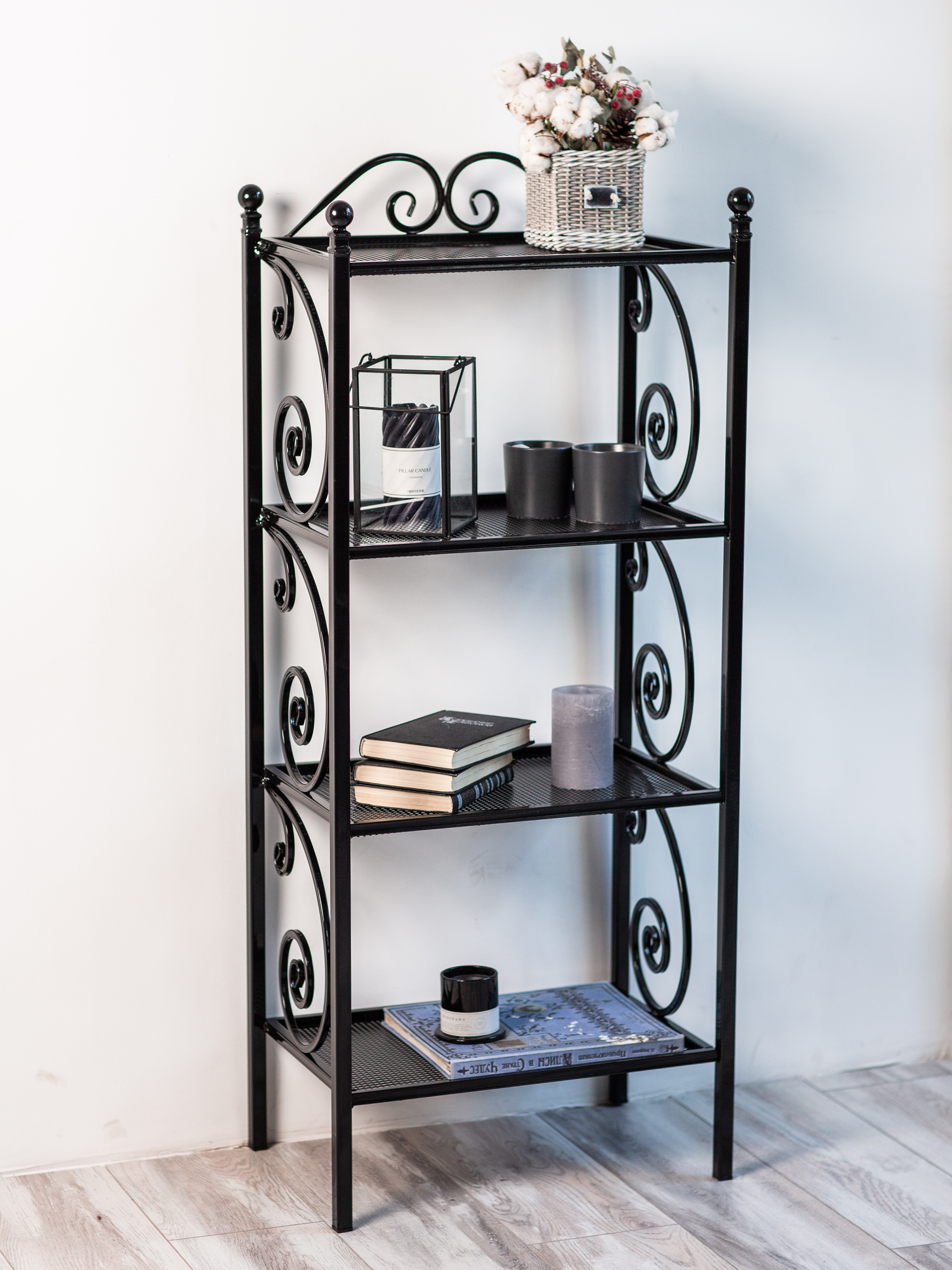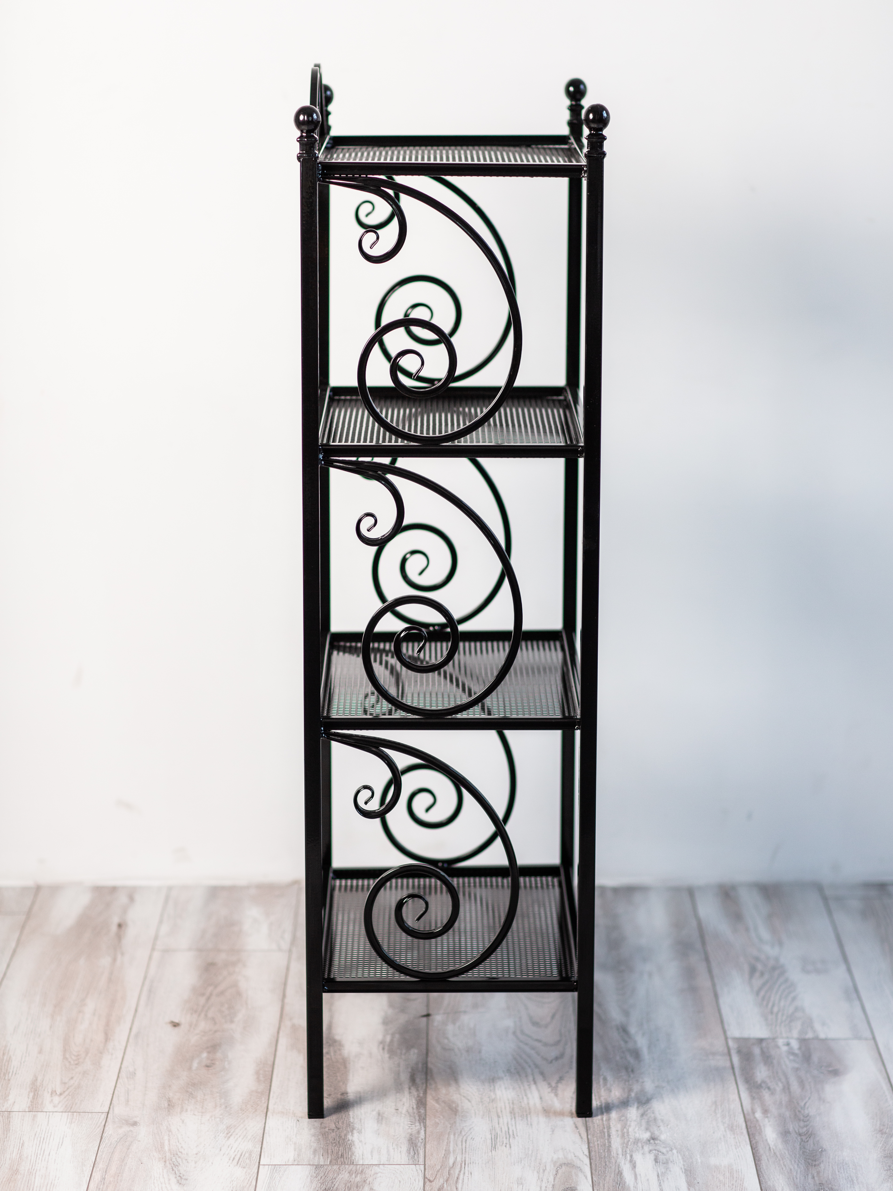 Этажерка изготовлена из металла с элементами ковки. Сварка элементов между собой выполнена на автоматизированном производстве в России.Покрыта порошковой краской, которая создает высокую антикоррозионную стойкость, стойкость к ударам, химическим веществам