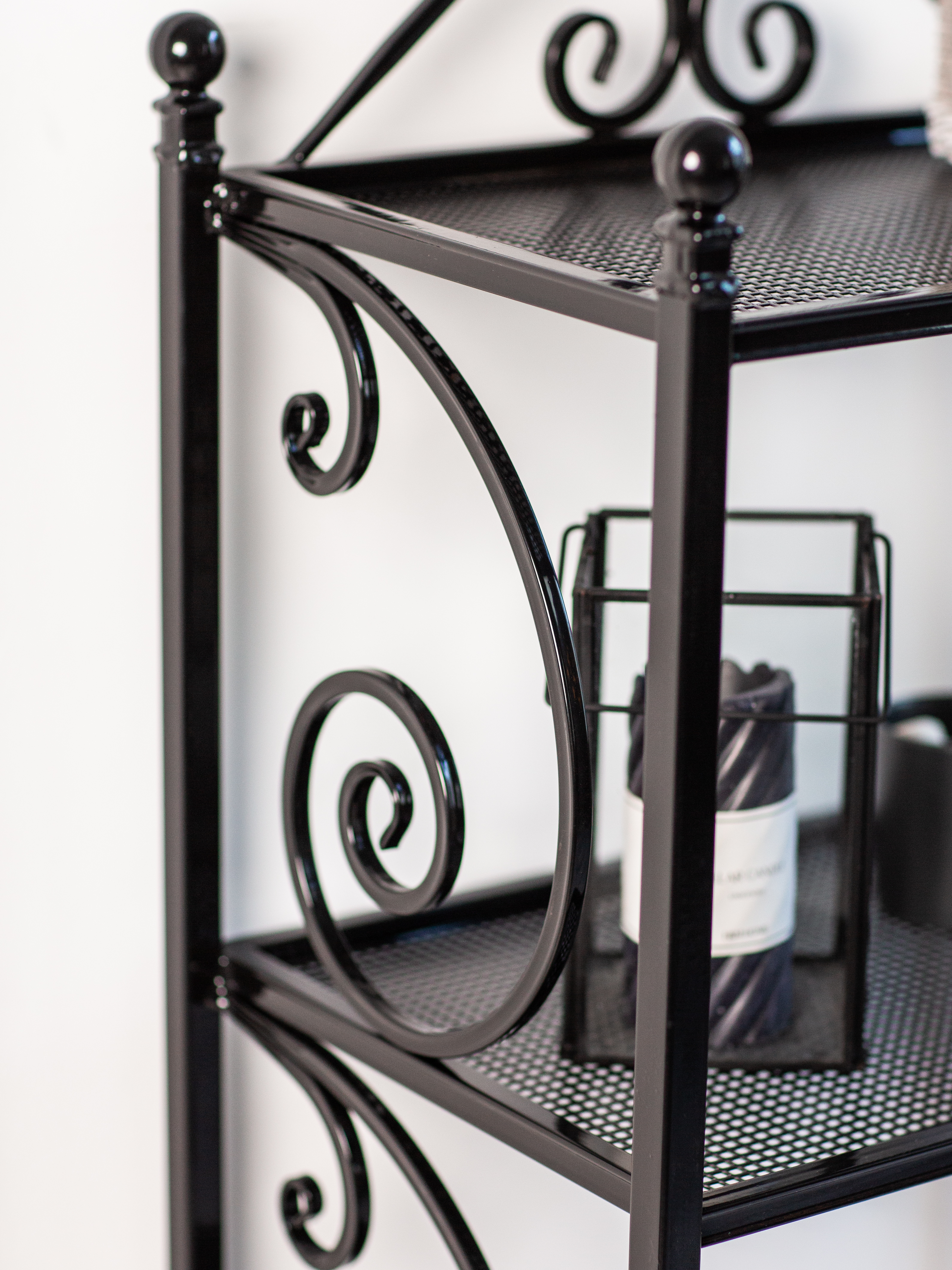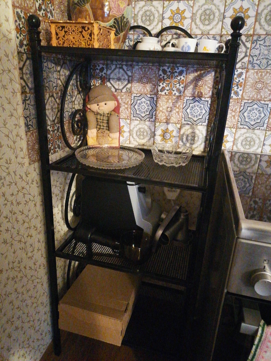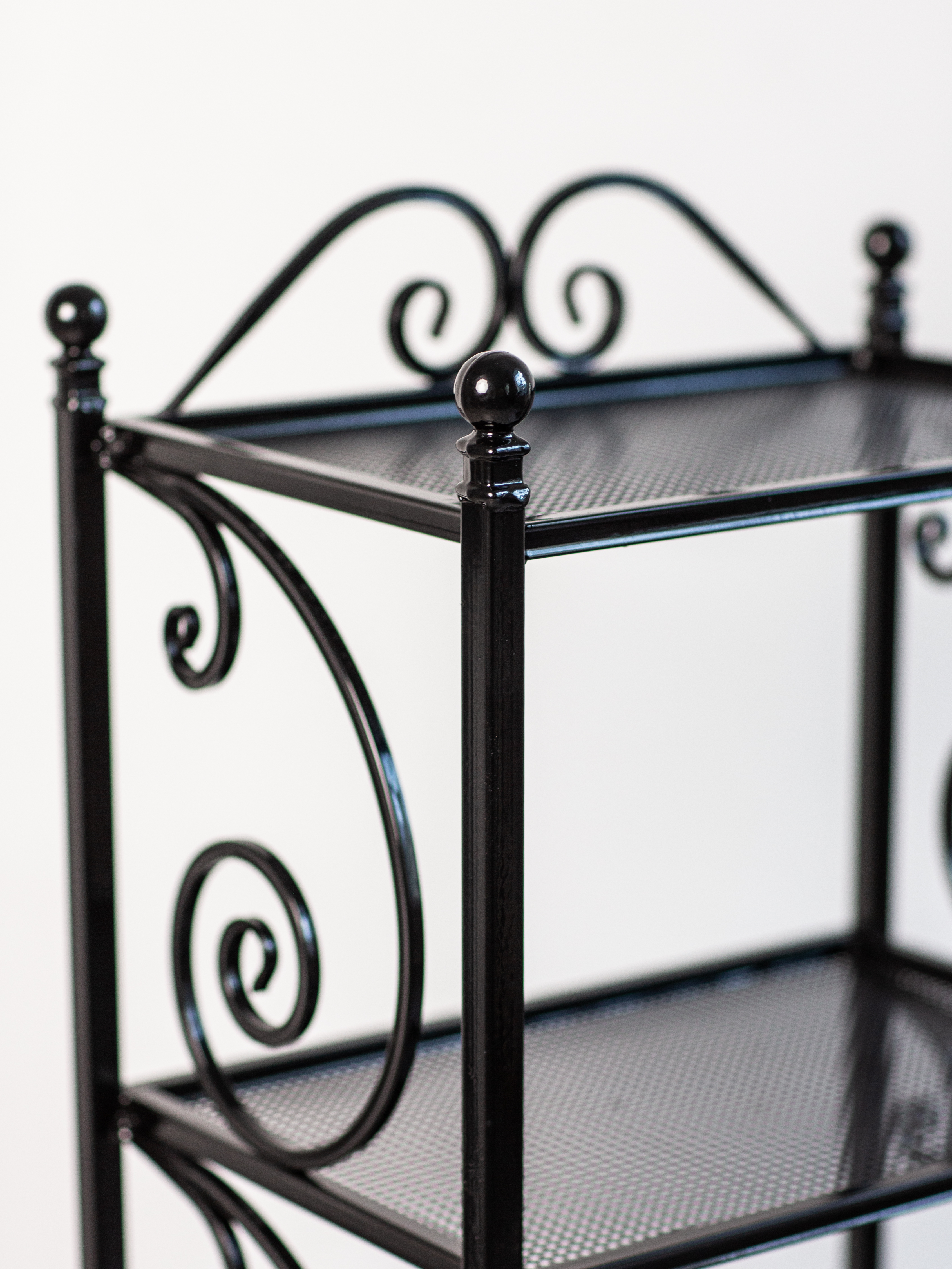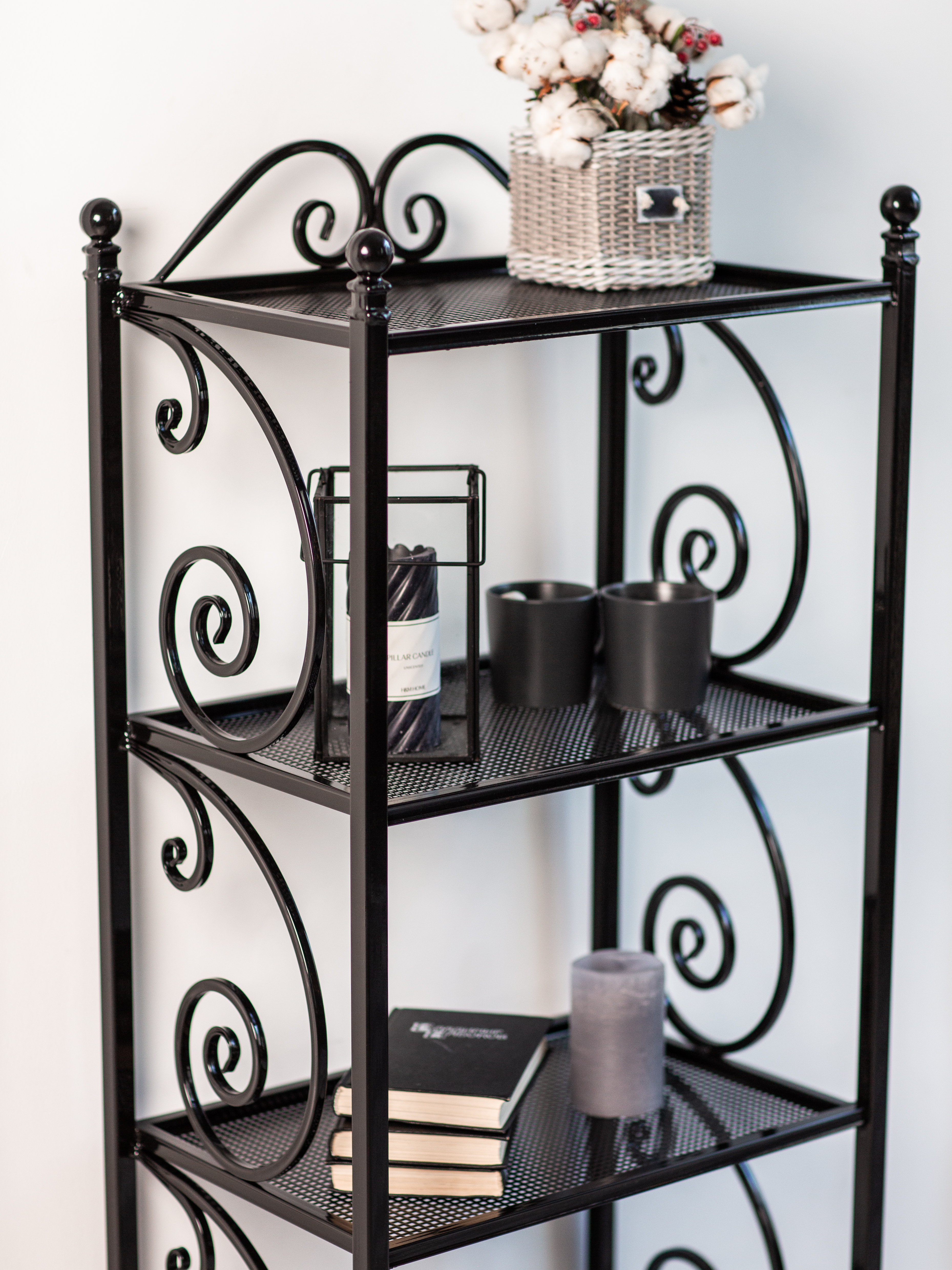 Этажерка изготовлена из металла с элементами ковки. Сварка элементов между собой выполнена на автоматизированном производстве в России.Покрыта порошковой краской, которая создает высокую антикоррозионную стойкость, стойкость к ударам, химическим веществам