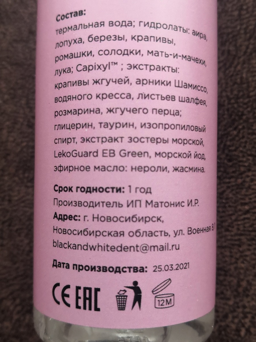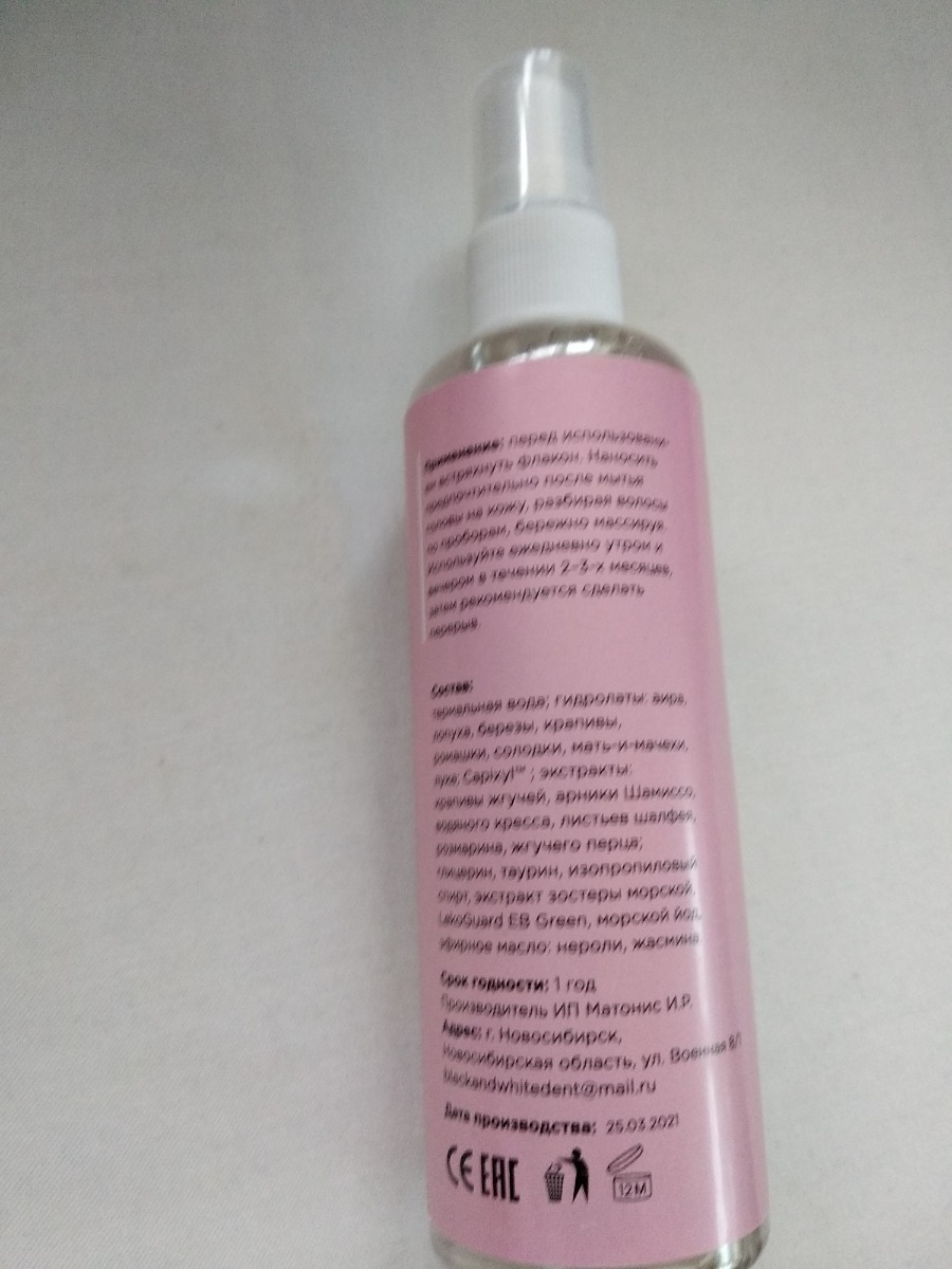 Состав:Capixyl 4%, LekoGuard EB Green 4%, глицерин 4%, таурин 4%, изопропиловый спирт 4%, гидролат аира 4%, Экстракт розмарина 4%, экстракт арники 4%, термальная вода 4%, эфирное масло нероли 4%, гидролат крапивы 4%, гидролат ромашки 4%, эфирное масло жас